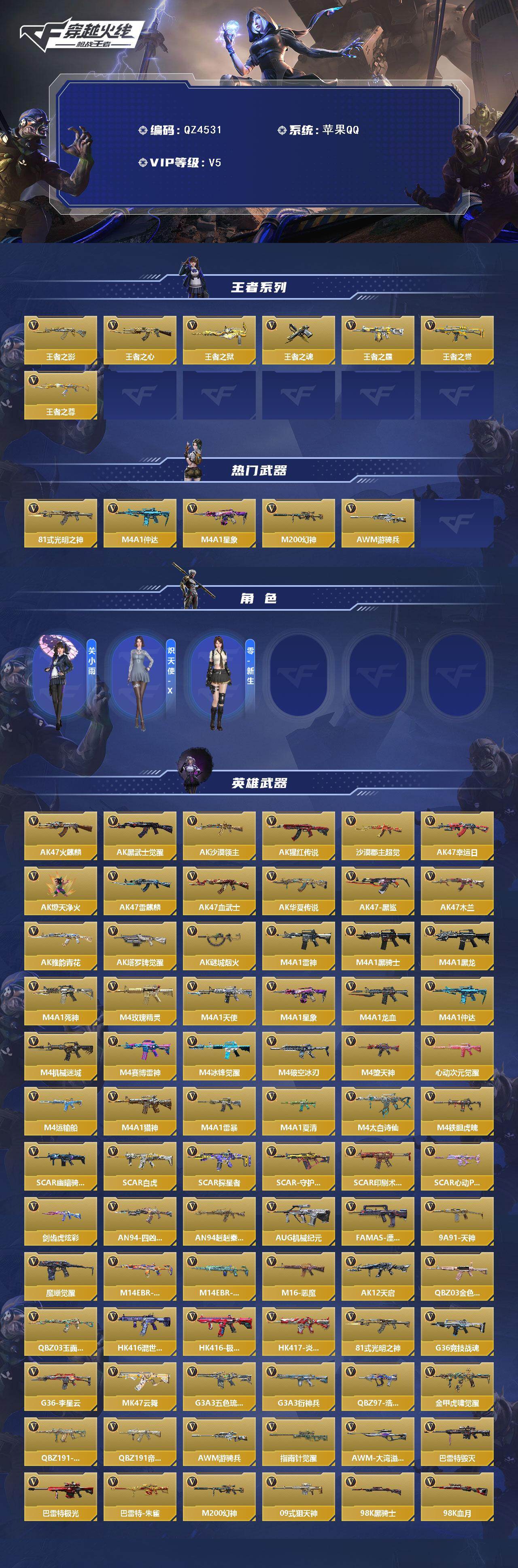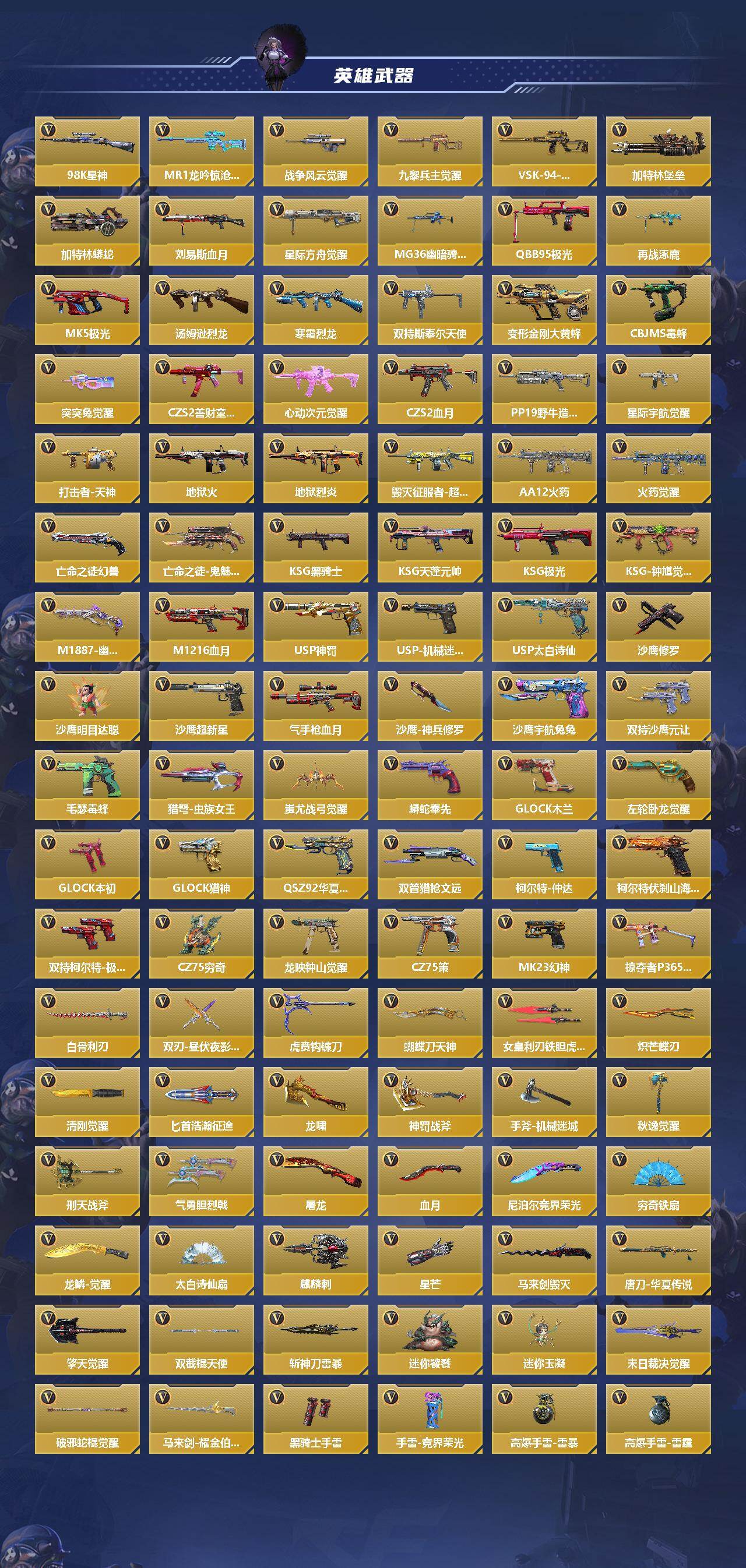 【qz4531】vip5/336v/王者之影/王者之心/王者之狱/王者之魂/王者之霆/王者之誉/王者之尊/81式-光明之神/m4a1-仲达/m4a1-星象/m200-幻神/awm-游骑兵/关小雨/炽天使-x/零-新生/ak47-火麒麟/ak47-黑武士觉醒/ak47-沙漠领主/ak47-猩红传说/ak47-沙漠郡主-超觉/ak47-幸运日/ak47-燎天净火/ak47-雷麒麟/ak47-血武士/ak47-华夏传说/ak47-黑鲨/ak47-木兰/ak47-雅韵青花/ak47-塔罗牌觉醒/ak47-谜城烟火/m4a1-雷神/m4a1-黑骑士/m4a1-黑龙/m4a1-死神/m4a1-玫瑰精灵/m4a1-天使/m4a1-龙血/m4a1-机械迷城/m4a1-赛博雷神/m4a1-冰锋觉醒/m4a1-破空冰刃/m4a1-堕天神/m4a1-心动次元觉醒/m4a1-运输船/m4a1-猎神/m4a1-雷暴/m4a1-夏清/m4a1-太白诗仙/m4a1-铁胆虎魄/scar-幽暗骑士/scar light-白虎/scar-探星者/scar-守护者觉醒/scar-印刷术觉醒/scar-心动pick/剑齿虎-炫彩/an94-四凶觉醒/an94-赳赳秦师/aug-机械纪元/famas-湮灭/9a91-天神/9a91-魔蜥觉醒/m14ebr-拂影/m14ebr-葫芦山庄/m16-恶魔/ak12-天启/q03-金色蔷薇/q03-玉面羞花/hk416-混世行者/hk416-极光/hk417-炎龙铠甲/g36-竞技战魂/g36-李星云/mk47-云舞/g3a3-五色琉璃觉醒/g3a3-衍神兵/q97-浩瀚征途/q191-金甲虎啸觉醒/q191-封神榜/q191-帝皇铠甲/awm-指南针觉醒/awm-大湾溢彩/芭蕾特-毁灭/芭蕾特-极光/芭蕾特-朱雀/09式狙-天神/98k-黑骑士/98k-血月/98k-星神/mr1-龙吟惊沧海/gm6-战争风云觉醒/vsk-94-九黎兵主觉醒/vsk-94-金蚀/加特林-堡垒/加特林-蟒蛇/刘易斯-血月/刘易斯-星际方舟觉醒/mg36-幽暗骑士/qbb95-极光/qbb95-再战涿鹿/mk5-极光/汤姆逊-烈龙/寒霜烈龙/双持斯泰尔-天使/qcw05-变形金刚·大黄蜂/cbj-ms-毒蜂/p90-突突兔觉醒/czs2-善财童子/czs2-心动次元觉醒/czs2-血月/pp19野牛-造纸术/ddm4-pdw-星际宇航觉醒/打击者-天神/地狱火/地狱烈炎/毁灭征服者-超越max/aa12-火药/aa12-火药觉醒/亡命之徒-幻兽/亡命之徒-鬼魅双生/ksg-黑骑士/ksg-天蓬元帅/ksg-极光/ksg-钟馗觉醒/m1887-幽冥玄喵觉醒/m1216-血月/usp-神罚/usp-机械迷城/usp-太白诗仙/沙鹰-修罗/沙鹰-明目达聪/沙鹰-超新星/气手呛-血月/沙鹰-神兵修罗/沙鹰-宇航兔兔/双持沙鹰-元让/毛瑟-毒蜂/猎弩-虫族女王/蚩尤战弓觉醒/蟒蛇-奉先/改装glock-木兰/左轮-卧龙觉醒/双持glock18-本初/glock18-猎神/qsz92-华夏传说/双管猎呛-文远/柯尔特-仲达/柯尔特-伏刹山海觉醒/双持柯尔特-极光/cz75-穷奇/cz75-龙映钟山觉醒/cz75-策/mk23-幻神/掠夺者p365-虹舞/白骨利刃/双刃-昼伏夜影觉醒/虎贲钩镰刀/蝴蝶刀-天神/女皇利刃-铁胆虎魄/炽芒蝶刃/清刚-觉醒/匕首-浩瀚征途/龙啸/神罚战斧/手斧-机械迷城/秋逸觉醒/刑天战斧/气勇胆烈戟/屠龙/血月/尼泊尔-竞界荣光/穷奇铁扇/龙鳞-觉醒/太白诗仙扇/麒麟刺/星芒/马来剑-毁灭/唐刀-华夏传说/擎天觉醒/双截棍-天使/斩神刀-雷暴/迷你饕餮/迷你玉凝/末日裁决觉醒/破邪蛇棍觉醒/马来剑-耀金伯爵/黑骑士手蕾/手蕾-竞界荣光/高爆手蕾-雷暴/高爆手蕾-雷霆/高爆手蕾-无限/高爆手蕾-神工天巧/分裂雷-偃蛇/手蕾-游骑兵/高爆手蕾-幻灵/粘性手蕾-彩虹小白马觉醒/闪光丹-游骑兵/幻兽闪光丹/王者之心闪光丹/黑骑士闪光丹/闪光丹-神工天巧/盐雾蛋-游骑兵/黑骑士盐雾蛋/盐雾蛋-雷霆/盐雾蛋-神工天巧/盐雾蛋-星际宇航/盐雾蛋-幻灵/燃烧弹-游骑兵