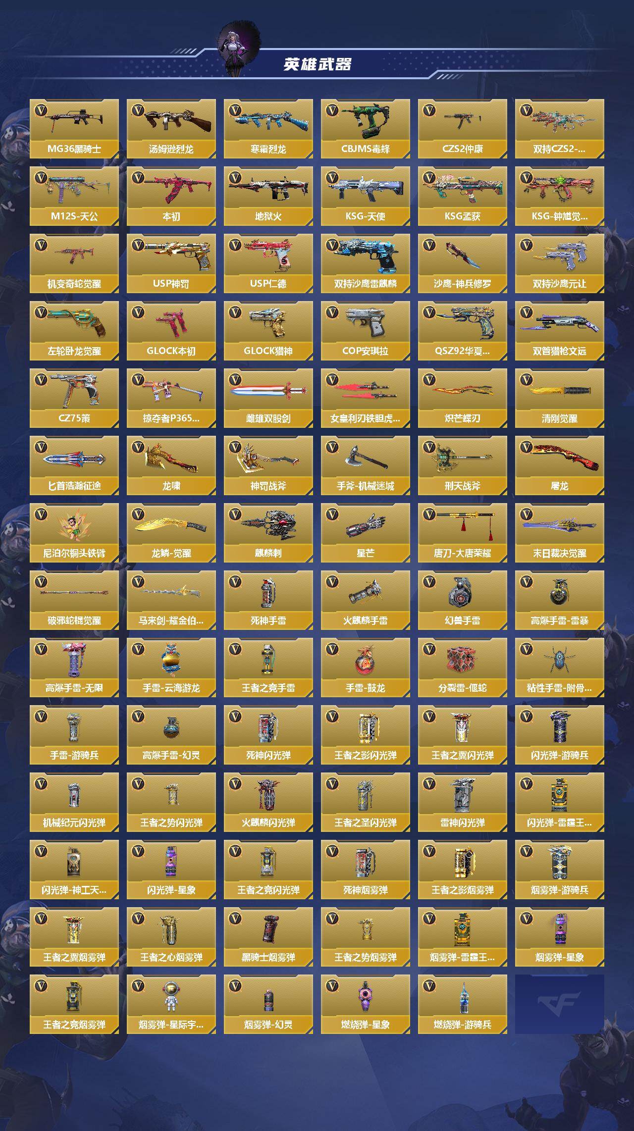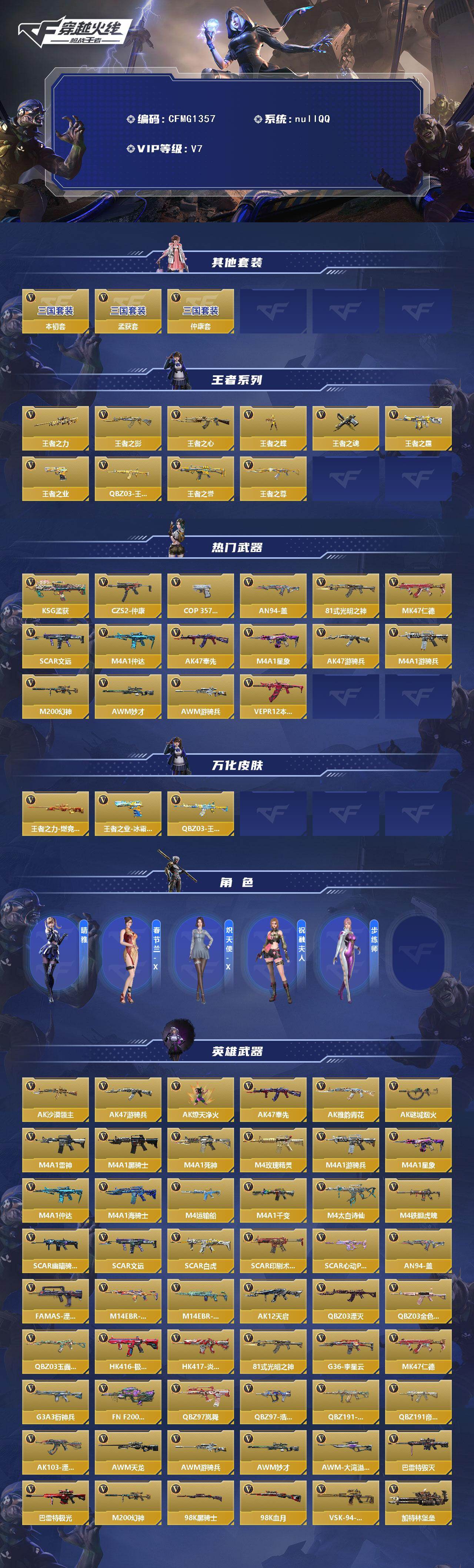 【cfmg1357】vip7/231v/10王者/仲康套/孟获套/本初套/王者之力/王者之影/王者之心/王者之蝶/王者之魂/王者之霆/王者之业/q03-王者蔷薇/王者之誉/王者之尊/ksg-孟获/czs2-仲康/cop 357-安琪拉/an94-盖/81式-光明之神/mk47-仁德/scar-文远/m4a1-仲达/ak47-奉先/m4a1-星象/ak47-游骑兵/m4a1-游骑兵/m200-幻神/awm-妙才/awm-游骑兵/vepr12-本初/q03-王者蔷薇-冰霜奇迹/王者之业-冰霜奇迹/王者之力-燃竞之巅/晴雅/春节兰-x/炽天使-x/祝融夫人/步练师/ak47-沙漠领主/ak47-燎天净火/ak47-雅韵青花/ak47-谜城烟火/m4a1-雷神/m4a1-黑骑士/m4a1-死神/m4a1-玫瑰精灵/m4a1-海骑士/m4a1-运输船/m4a1-千变/m4a1-太白诗仙/m4a1-铁胆虎魄/scar-幽暗骑士/scar light-白虎/scar-印刷术觉醒/scar-心动pick/famas-湮灭/m14ebr-拂影/m14ebr-葫芦山庄/ak12-天启/q03-湮灭/q03-金色蔷薇/q03-玉面羞花/hk416-极光/hk417-炎龙铠甲/g36-李星云/g3a3-衍神兵/fn f2000-十绝阵觉醒/q97-岚舞/q97-浩瀚征途/q191-封神榜/q191-帝皇铠甲/ak103-湮灭/awm-天龙/awm-大湾溢彩/芭蕾特-毁灭/芭蕾特-极光/98k-黑骑士/98k-血月/vsk-94-金蚀/加特林-堡垒/mg36-黑骑士/汤姆逊-烈龙/寒霜烈龙/cbj-ms-毒蜂/双持czs2-魔礼寿/m12s-天公/地狱火/ksg-天使/ksg-钟馗觉醒/igin12-机变奇蛇觉醒/usp-神罚/usp-仁德/双持沙鹰-雷麒麟/沙鹰-神兵修罗/双持沙鹰-元让/左轮-卧龙觉醒/双持glock18-本初/glock18-猎神/qsz92-华夏传说/双管猎呛-文远/cz75-策/掠夺者p365-虹舞/雌雄双股剑/女皇利刃-铁胆虎魄/炽芒蝶刃/清刚-觉醒/匕首-浩瀚征途/龙啸/神罚战斧/手斧-机械迷城/刑天战斧/屠龙/尼泊尔-铜头铁臂/龙鳞-觉醒/麒麟刺/星芒/唐刀-大唐荣耀/末日裁决觉醒/破邪蛇棍觉醒/马来剑-耀金伯爵/死神手蕾/火麒麟手蕾/幻兽手蕾/高爆手蕾-雷暴/高爆手蕾-无限/手蕾-云海游龙/王者之竞手蕾/手蕾-鼓龙/分裂雷-偃蛇/粘性手蕾-附骨之虫觉醒/手蕾-游骑兵/高爆手蕾-幻灵/死神闪光丹/王者之影闪光丹/王者之翼闪光丹/闪光丹-游骑兵/机械纪元闪光丹/王者之势闪光丹/火麒麟闪光丹/王者之圣闪光丹/雷神闪光丹/闪光丹-雷霆王者/闪光丹-神工天巧/闪光丹-星象/王者之竞闪光丹/死神盐雾蛋/王者之影盐雾蛋/盐雾蛋-游骑兵/王者之翼盐雾蛋/王者之心盐雾蛋/黑骑士盐雾蛋/王者之势盐雾蛋/盐雾蛋-雷霆王者/盐雾蛋-星象/王者之竞盐雾蛋/盐雾蛋-星际宇航/盐雾蛋-幻灵/燃烧弹-星象/燃烧弹-游骑兵