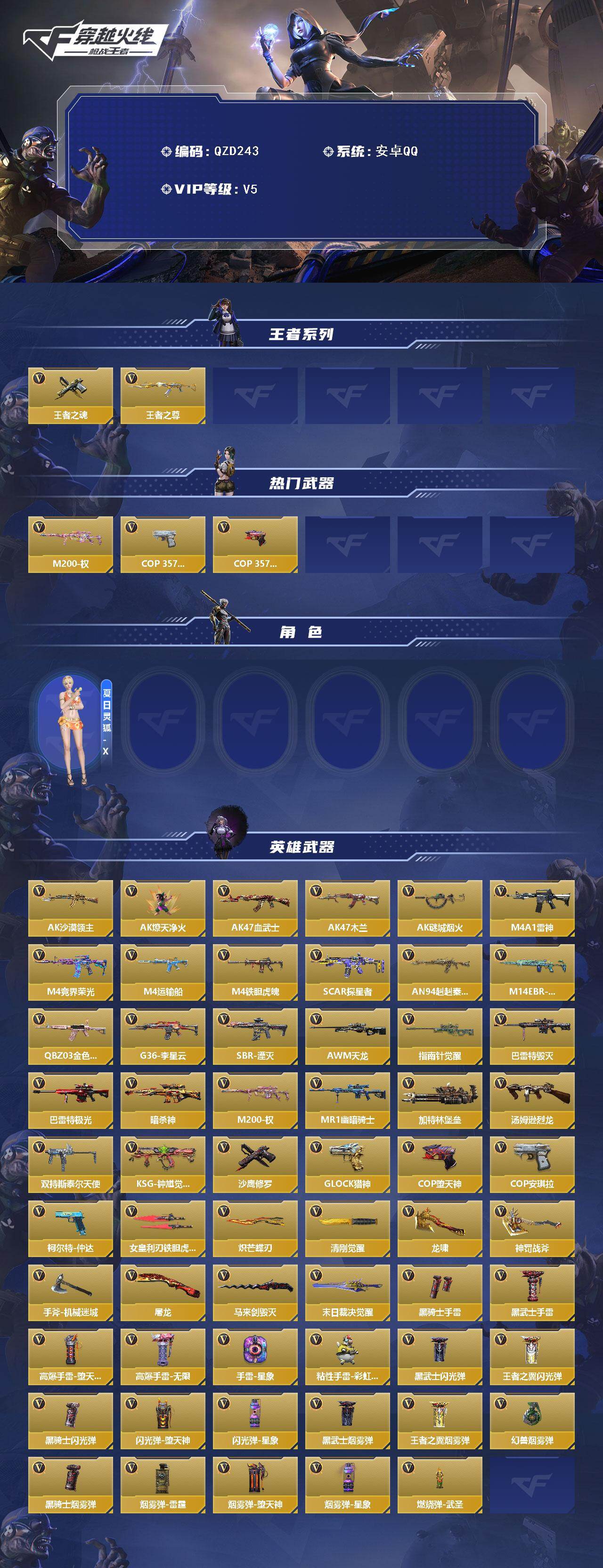 【qzd243】vip5/93v/2王者/王者之魂/王者之尊/m200-权/cop 357-安琪拉/cop 357-堕天神/夏日灵狐-x/ak47-沙漠领主/ak47-燎天净火/ak47-血武士/ak47-木兰/ak47-谜城烟火/m4a1-雷神/m4a1-竞界荣光/m4a1-运输船/m4a1-铁胆虎魄/scar-探星者/an94-赳赳秦师/m14ebr-葫芦山庄/q03-金色蔷薇/g36-李星云/sbr-湮灭/awm-天龙/awm-指南针觉醒/芭蕾特-毁灭/芭蕾特-极光/暗杀神/mr1-幽暗骑士/加特林-堡垒/汤姆逊-烈龙/双持斯泰尔-天使/ksg-钟馗觉醒/沙鹰-修罗/glock18-猎神/柯尔特-仲达/女皇利刃-铁胆虎魄/炽芒蝶刃/清刚-觉醒/龙啸/神罚战斧/手斧-机械迷城/屠龙/马来剑-毁灭/末日裁决觉醒/黑骑士手蕾/黑武士手蕾/高爆手蕾-堕天神/高爆手蕾-无限/手蕾-星象/粘性手蕾-彩虹小白马觉醒/黑武士闪光丹/王者之翼闪光丹/黑骑士闪光丹/闪光丹-堕天神/闪光丹-星象/黑武士盐雾蛋/王者之翼盐雾蛋/幻兽盐雾蛋/黑骑士盐雾蛋/盐雾蛋-雷霆/盐雾蛋-堕天神/盐雾蛋-星象/燃烧弹-武圣