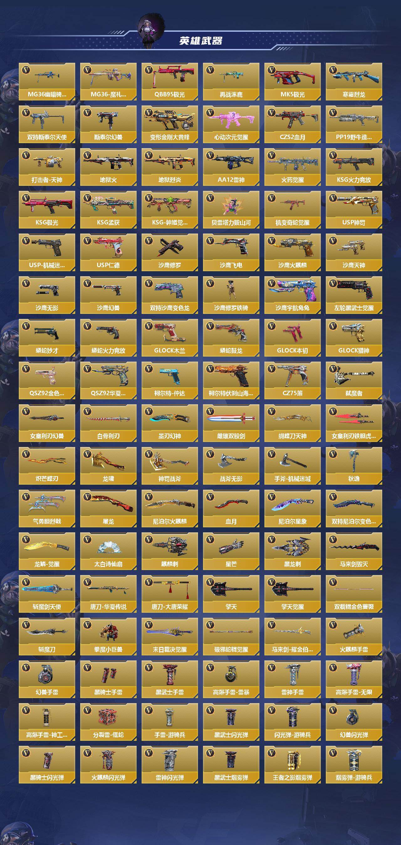 【qzsa794】vip7/260v/6王者/王者之影/王者之心/王者之狱/王者之魂/m12s-雷霆王者/王者之尊/ksg-孟获/81式-光明之神/m4a1-游骑兵/awm-妙才/葵/瞳/英雄兰/关小雨/妩媚妖姬/炽天使-x/零-新生/ak47-无影/ak47-火麒麟/ak47-黑武士觉醒/ak47-角斗士/ak47-rush-星速/ak47-樱斗士-二觉/ak47-机械迷城/ak47-无影-葵/ak47-亚龙/ak47-沙漠郡主-一觉/ak47-沙漠郡主-二觉/ak47-雷麒麟/ak47-华夏传说/ak47-黑鲨/ak47-木兰/ak47-塔罗牌觉醒/ak47-谜城烟火/m4a1-雷神/m4a1-黑骑士/m4a1-死神/m4a1-变色龙/m4a1-龙血/m4a1-机械迷城/m4a1-赛博雷神/m4a1-海骑士/m4a1-堕天神/m4a1-心动次元/m4a1-运输船/m4a1-猎神/m4a1-太白诗仙/m4a1-青龙/q95-幻兽/scar-幽暗骑士/scar light-白虎/scar-探星者/scar-心动pick/剑齿虎-炫彩/an94-赳赳秦师/aug-机械纪元/9a91-天神/9a91-魔蜥觉醒/m14ebr-暗夜/m14ebr-拂影/m14ebr-葫芦山庄/m16-恶魔/ak12-天启/q03-金色蔷薇/hk416-混世行者/q19-天使/g36-李星云/mk47-机械纪元/mk47-云舞/q191-金甲虎啸觉醒/awm-天龙/awm-裁决/awm-天使/awm-指南针觉醒/芭蕾特-毁灭/芭蕾特-极光/芭蕾特-呛娘/芭蕾特-变色龙/芭蕾特-冬灭觉醒/芭蕾特-朱雀/暗杀星/暗杀神/m200-心动次元觉醒/09式狙-天神/98k-星神/mr1-龙吟惊沧海/mr1-幽暗骑士/tac-晴舞/vsk-94-九黎兵主觉醒/加特林-堡垒/加特林-堡垒觉醒/刘易斯-天使/mg36-幽暗骑士/mg36-魔礼青/qbb95-极光/qbb95-再战涿鹿/mk5-极光/寒霜烈龙/双持斯泰尔-天使/斯泰尔-幻兽/qcw05-变形金刚·大黄蜂/czs2-心动次元觉醒/czs2-血月/pp19野牛-造纸术/打击者-天神/地狱火/地狱烈炎/aa12-雷神/aa12-火药觉醒/ksg-火力竞放/ksg-极光/ksg-钟馗觉醒/贝雷塔-力拔山河/igin12-机变奇蛇觉醒/usp-神罚/usp-机械迷城/usp-仁德/沙鹰-修罗/沙鹰-飞电/沙鹰-火麒麟/沙鹰-天神/沙鹰-无影/沙鹰-幻兽/双持沙鹰-变色龙/沙鹰-修罗-铁骑/沙鹰-宇航兔兔/左轮-黑武士觉醒/蟒蛇-妙才/蟒蛇-火力竞放/改装glock-木兰/蟒蛇-鼓龙/双持glock18-本初/glock18-猎神/qsz92-金色蔷薇/qsz92-华夏传说/柯尔特-仲达/柯尔特-伏刹山海觉醒/cz75-策/弑魔者/女皇利刃-幻兽/白骨利刃/墨刃-幻神/雌雄双股剑/蝴蝶刀-天神/女皇利刃-铁胆虎魄/炽芒蝶刃/龙啸/神罚战斧/战斧-无影/手斧-机械迷城/秋逸/气勇胆烈戟/屠龙/尼泊尔-火麒麟/血月/尼泊尔-星象/双持尼泊尔-变色龙/龙鳞-觉醒/太白诗仙扇/麒麟刺/星芒/黑龙刺/马来剑-毁灭/斩魔剑-天使/唐刀-华夏传说/唐刀-大唐荣耀/擎天/擎天觉醒/双截棍-金色蔷薇/斩魔刀/拳魔小巨兽/末日裁决觉醒/破邪蛇棍觉醒/马来剑-耀金伯爵/火麒麟手蕾/幻兽手蕾/黑骑士手蕾/黑武士手蕾/高爆手蕾-雷暴/雷神手蕾/高爆手蕾-无限/高爆手蕾-神工天巧/分裂雷-偃蛇/手蕾-游骑兵/黑武士闪光丹/闪光丹-游骑兵/幻兽闪光丹/黑骑士闪光丹/火麒麟闪光丹/雷神闪光丹/黑武士盐雾蛋/王者之影盐雾蛋/盐雾蛋-游骑兵/幻兽盐雾蛋/火麒麟盐雾蛋/雷神盐雾蛋/燃烧弹-游骑兵