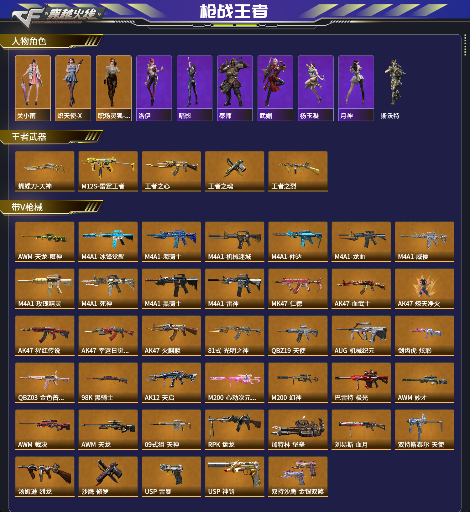 安卓qq,成人号:是,角色等级:97,4王者-仁德妙才幻神仲达7,王者武器数:5,万化数量:164,【人物角色】关小雨,洛伊,暗影,斯沃特,秦师,炽天使-x,炽天使,武媚,杨玉凝,月神,职场灵狐-赛事经理,【王者武器】蝴蝶刀-天神,m12s-雷霆王者,王者之心,王者之魂,王者之烈,【带v呛械】awm-天龙-