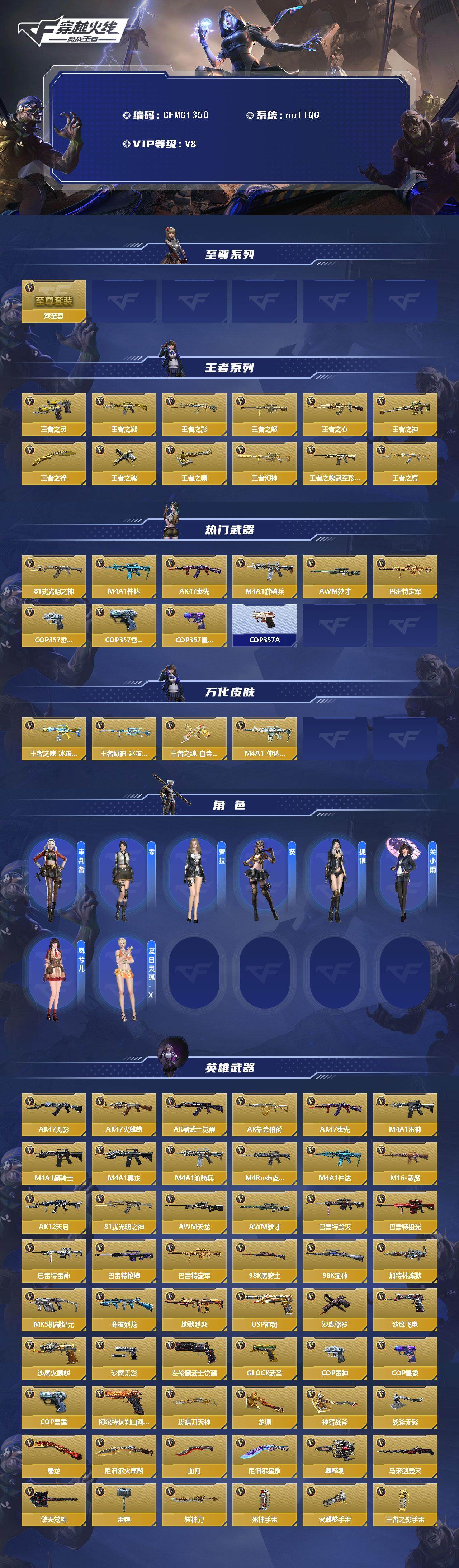 【cfmg1350】vip8/150v/王者之戮至尊套/王者之灵/王者之戮/王者之影/王者之怒/王者之心/王者之神/王者之锋/王者之魂/王者之啸/王者幻神/王者之魄-冠军珍藏/王者之尊/81式-光明之神/m4a1-仲达/ak47-奉先/m4a1-游骑兵/awm-妙才/芭蕾特-定军/cop 357-雷神/cop357-雷霆/cop357-星象/cop 357-a/王者之魄-冰霜奇迹/m4a1-仲
