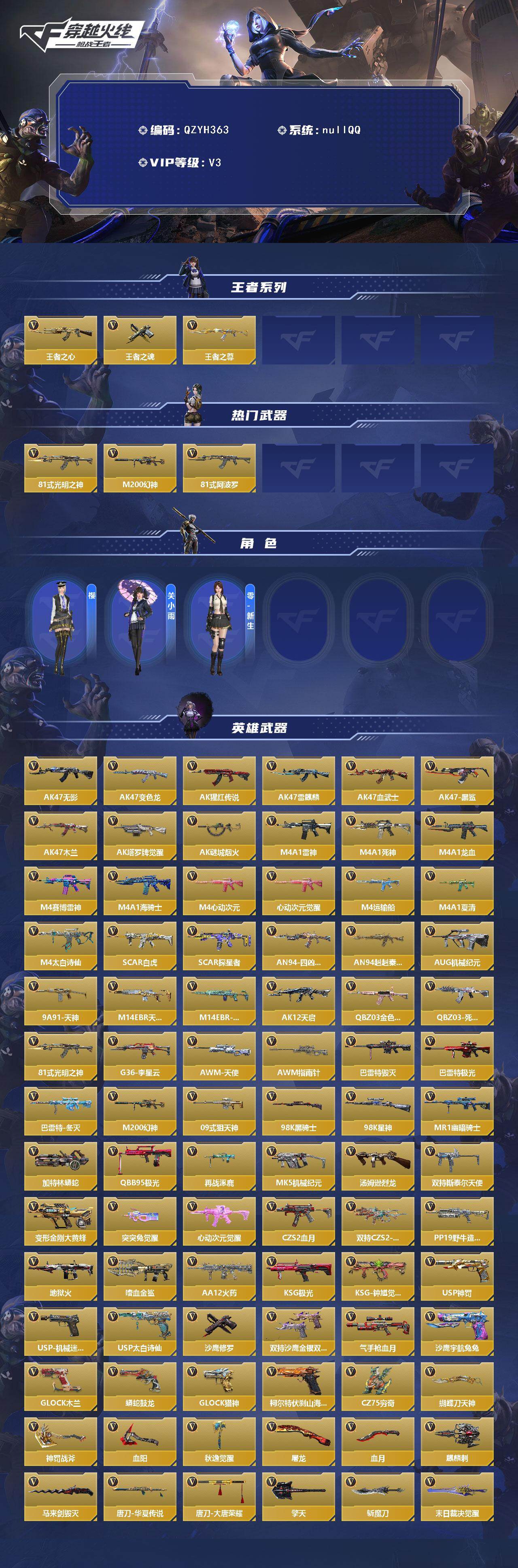【qzyh363】vip3/131v/王者之心/王者之魂/王者之尊/81式-光明之神/m200-幻神/81式-阿波罗/樱/关小雨/零-新生/ak47-无影/ak47-变色龙/ak47-猩红传说/ak47-雷麒麟/ak47-血武士/ak47-黑鲨/ak47-木兰/ak47-塔罗牌觉醒/ak47-谜城烟火/m4a1-雷神/m4a1-死神/m4a1-龙血/m4a1-赛博雷神/m4a1-海骑士/m4a