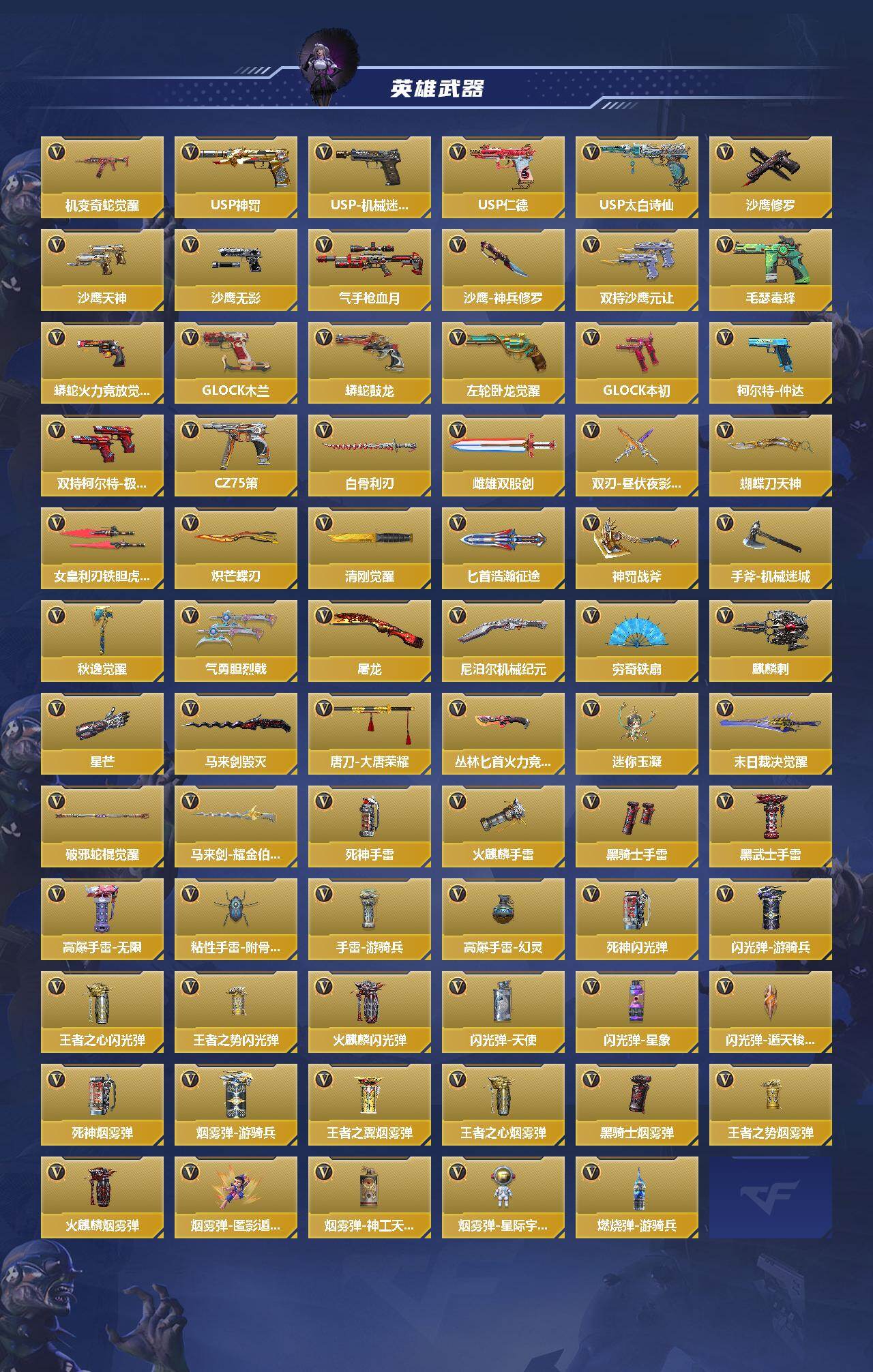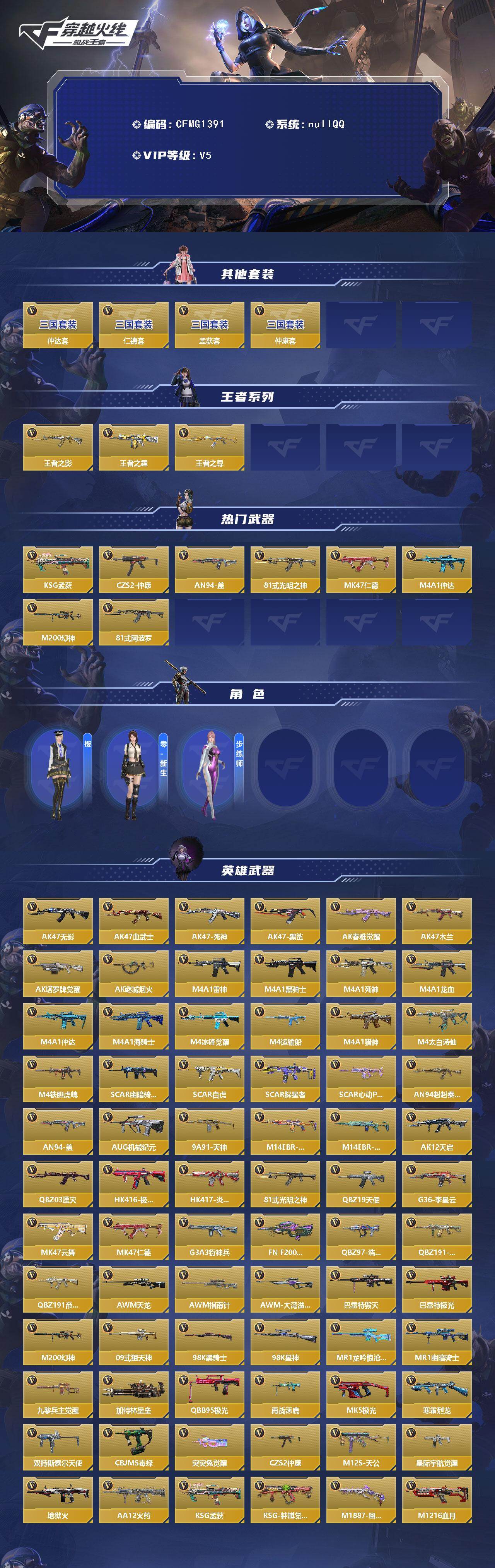 【cfmg1391】vip5/233v/3王者/仲达套/仁德套/孟获套/仲康套/王者之影/王者之霆/王者之尊/ksg-孟获/czs2-仲康/an94-盖/81式-光明之神/mk47-仁德/m4a1-仲达/m200-幻神/81式-阿波罗/樱/零-新生/步练师/ak47-无影/ak47-血武士/ak47-死神/ak47-黑鲨/ak47-春雅觉醒/ak47-木兰/ak47-塔罗牌觉醒/ak47-谜城烟火/m4a1-雷神/m4a1-黑骑士/m4a1-死神/m4a1-龙血/m4a1-海骑士/m4a1-冰锋觉醒/m4a1-运输船/m4a1-猎神/m4a1-太白诗仙/m4a1-铁胆虎魄/scar-幽暗骑士/scar light-白虎/scar-探星者/scar-心动pick/an94-赳赳秦师/aug-机械纪元/9a91-天神/m14ebr-拂影/m14ebr-葫芦山庄/ak12-天启/q03-湮灭/hk416-极光/hk417-炎龙铠甲/q19-天使/g36-李星云/mk47-云舞/g3a3-衍神兵/fn f2000-十绝阵觉醒/q97-浩瀚征途/q191-封神榜/q191-帝皇铠甲/awm-天龙/awm-指南针/awm-大湾溢彩/芭蕾特-毁灭/芭蕾特-极光/09式狙-天神/98k-黑骑士/98k-星神/mr1-龙吟惊沧海/mr1-幽暗骑士/vsk-94-九黎兵主觉醒/加特林-堡垒/qbb95-极光/qbb95-再战涿鹿/mk5-极光/寒霜烈龙/双持斯泰尔-天使/cbj-ms-毒蜂/p90-突突兔觉醒/m12s-天公/ddm4-pdw-星际宇航觉醒/地狱火/aa12-火药/ksg-钟馗觉醒/m1887-幽冥玄喵觉醒/m1216-血月/igin12-机变奇蛇觉醒/usp-神罚/usp-机械迷城/usp-仁德/usp-太白诗仙/沙鹰-修罗/沙鹰-天神/沙鹰-无影/气手呛-血月/沙鹰-神兵修罗/双持沙鹰-元让/毛瑟-毒蜂/蟒蛇-火力竞放觉醒/改装glock-木兰/蟒蛇-鼓龙/左轮-卧龙觉醒/双持glock18-本初/柯尔特-仲达/双持柯尔特-极光/cz75-策/白骨利刃/雌雄双股剑/双刃-昼伏夜影觉醒/蝴蝶刀-天神/女皇利刃-铁胆虎魄/炽芒蝶刃/清刚-觉醒/匕首-浩瀚征途/神罚战斧/手斧-机械迷城/秋逸觉醒/气勇胆烈戟/屠龙/尼泊尔-机械纪元/穷奇铁扇/麒麟刺/星芒/马来剑-毁灭/唐刀-大唐荣耀/丛林匕首-火力竞放觉醒/迷你玉凝/末日裁决觉醒/破邪蛇棍觉醒/马来剑-耀金伯爵/死神手蕾/火麒麟手蕾/黑骑士手蕾/黑武士手蕾/高爆手蕾-无限/粘性手蕾-附骨之虫觉醒/手蕾-游骑兵/高爆手蕾-幻灵/死神闪光丹/闪光丹-游骑兵/王者之心闪光丹/王者之势闪光丹/火麒麟闪光丹/闪光丹-天使/闪光丹-星象/闪光丹-遁天梭-飞行/死神盐雾蛋/盐雾蛋-游骑兵/王者之翼盐雾蛋/王者之心盐雾蛋/黑骑士盐雾蛋/王者之势盐雾蛋/火麒麟盐雾蛋/盐雾蛋-匿影遁形/盐雾蛋-神工天巧/盐雾蛋-星际宇航/燃烧弹-游骑兵