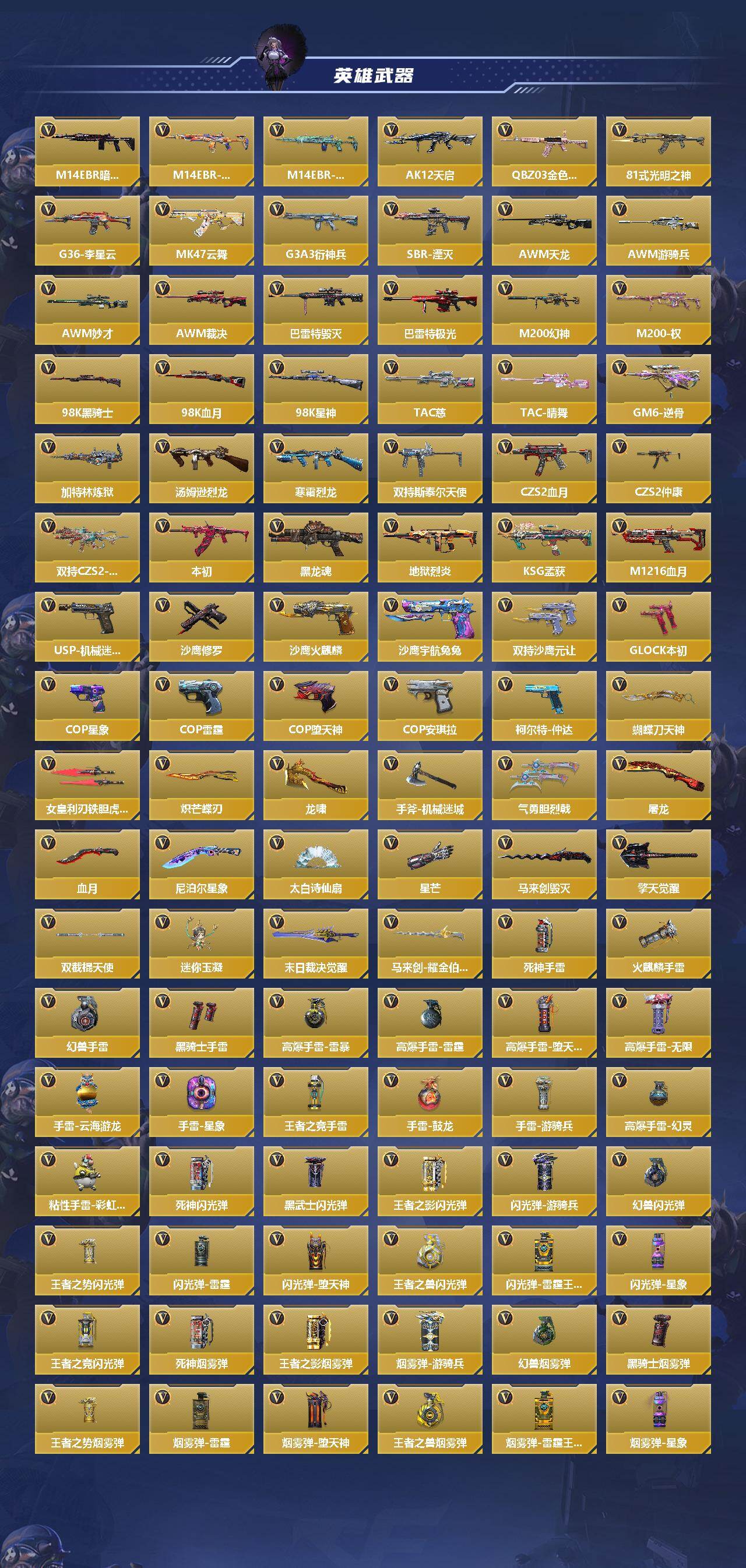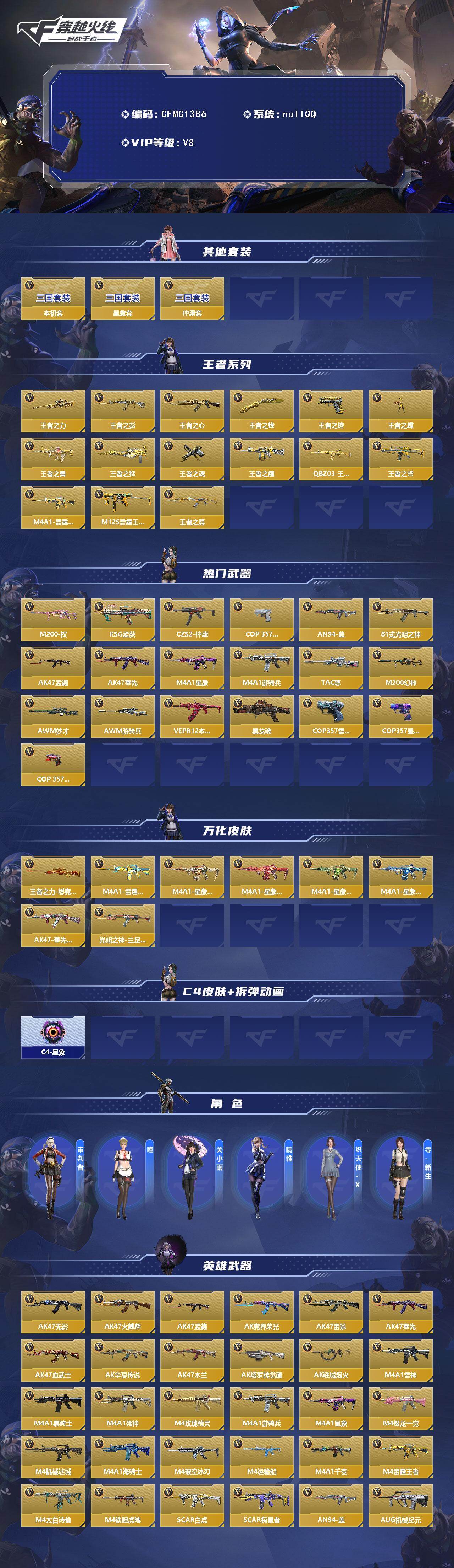 【cfmg1386】vip8/215v/星象套/本初套/仲康套/王者之力/王者之影/王者之心/王者之锋/王者之迹/王者之蝶/王者之兽/王者之狱/王者之魂/王者之霆/q03-王者蔷薇/王者之誉/m4a1-雷霆王者/m12s-雷霆王者/王者之尊/m200-权/ksg-孟获/czs2-仲康/cop 357-安琪拉/an94-盖/81式-光明之神/ak47-孟德/ak47-奉先/m4a1-星象/m4a1-游骑兵/tac-慈/m200-幻神/awm-妙才/awm-游骑兵/vepr12-本初/黑龙魂/cop 357-雷霆/cop 357-星象/cop 357-堕天神/ak47-奉先-无双/m4a1-星象-璀璨星辰·白虎/m4a1-星象-璀璨星辰·朱雀/m4a1-星象-璀璨星辰·玄武/m4a1-星象-璀璨星辰·青龙/m4a1-雷霆王者-冰霜奇迹/王者之力-燃竞之巅/81式-光明之神-三足金乌/c4-星象/审判者/瞳/关小雨/晴雅/炽天使-x/零-新生/ak47-无影/ak47-火麒麟/ak47-竞界荣光/ak47-雷暴/ak47-血武士/ak47-华夏传说/ak47-木兰/ak47-塔罗牌觉醒/ak47-谜城烟火/m4a1-雷神/m4a1-黑骑士/m4a1-死神/m4a1-玫瑰精灵/m4a1-樱龙·一觉/m4a1-机械迷城/m4a1-海骑士/m4a1-破空冰刃/m4a1-运输船/m4a1-千变/m4a1-太白诗仙/m4a1-铁胆虎魄/scar light-白虎/scar-探星者/aug-机械纪元/m14ebr-暗夜/m14ebr-拂影/m14ebr-葫芦山庄/ak12-天启/q03-金色蔷薇/g36-李星云/mk47-云舞/g3a3-衍神兵/sbr-湮灭/awm-天龙/awm-裁决/芭蕾特-毁灭/芭蕾特-极光/98k-黑骑士/98k-血月/98k-星神/tac-晴舞/gm6-逆骨/加特林-炼狱/汤姆逊-烈龙/寒霜烈龙/双持斯泰尔-天使/czs2-血月/双持czs2-魔礼寿/地狱烈炎/m1216-血月/usp-机械迷城/沙鹰-修罗/沙鹰-火麒麟/沙鹰-宇航兔兔/双持沙鹰-元让/双持glock18-本初/柯尔特-仲达/蝴蝶刀-天神/女皇利刃-铁胆虎魄/炽芒蝶刃/龙啸/手斧-机械迷城/气勇胆烈戟/屠龙/血月/尼泊尔-星象/太白诗仙扇/星芒/马来剑-毁灭/擎天觉醒/双截棍-天使/迷你玉凝/末日裁决觉醒/马来剑-耀金伯爵/死神手蕾/火麒麟手蕾/幻兽手蕾/黑骑士手蕾/高爆手蕾-雷暴/高爆手蕾-雷霆/高爆手蕾-堕天神/高爆手蕾-无限/手蕾-云海游龙/手蕾-星象/王者之竞手蕾/手蕾-鼓龙/手蕾-游骑兵/高爆手蕾-幻灵/粘性手蕾-彩虹小白马觉醒/死神闪光丹/黑武士闪光丹/王者之影闪光丹/闪光丹-游骑兵/幻兽闪光丹/王者之势闪光丹/闪光丹-雷霆/闪光丹-堕天神/王者之兽闪光丹/闪光丹-雷霆王者/闪光丹-星象/王者之竞闪光丹/死神盐雾蛋/王者之影盐雾蛋/盐雾蛋-游骑兵/幻兽盐雾蛋/黑骑士盐雾蛋/王者之势盐雾蛋/盐雾蛋-雷霆/盐雾蛋-堕天神/王者之兽盐雾蛋/盐雾蛋-雷霆王者/盐雾蛋-星象/王者之竞盐雾蛋/盐雾蛋-星际宇航/盐雾蛋-遁天梭-重山盾/盐雾蛋-幻灵/燃烧弹-星象/燃烧弹-武圣/燃烧弹-游骑兵