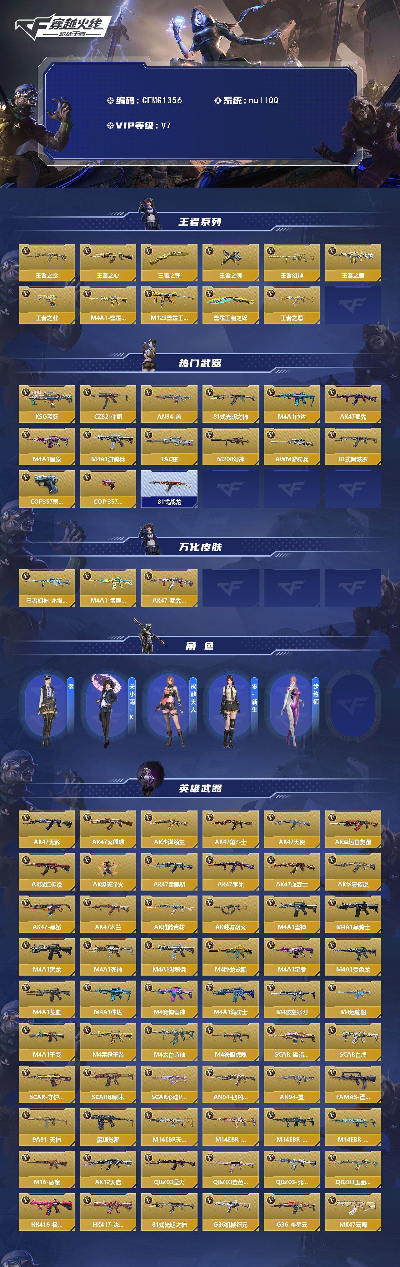 【cfmg1356】vip7/357v/王者之影/王者之心/王者之锋/王者之魂/王者幻神/王者之霆/王者之业/m4a1-雷霆王者/m12s-雷霆王者/雷霆王者之锋/王者之尊/ksg-孟获/czs2-仲康/an94-盖/81式-光明之神/m4a1-仲达/ak47-奉先/m4a1-星象/m4a1-游骑兵/tac-慈/m200-幻神/awm-游骑兵/81式-阿波罗/cop357-雷霆/cop 357