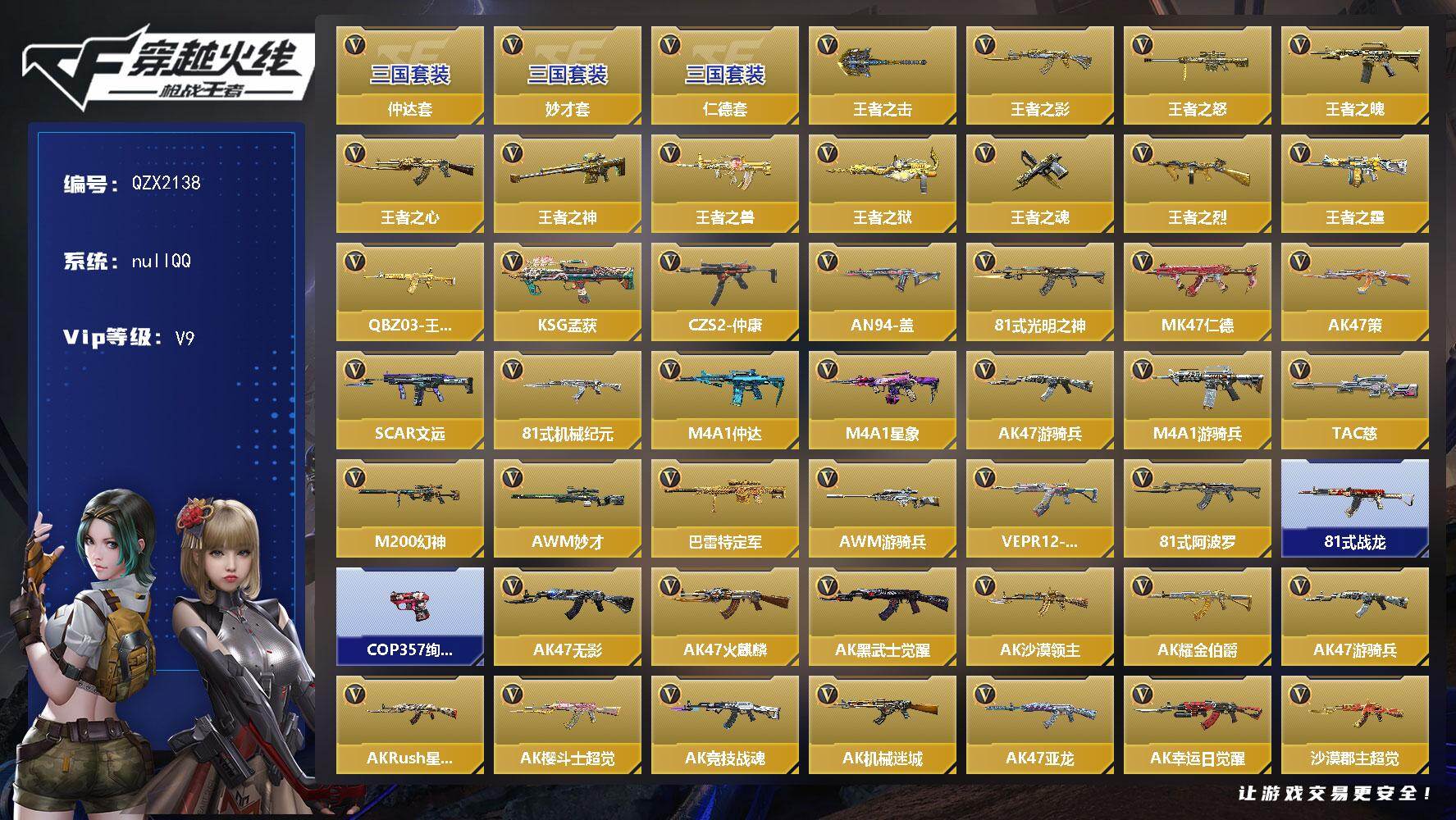 【qzx2138】vip9/444v/仲达套/仁德套/妙才套/王者之击/王者之影/王者之怒/王者之魄/王者之心/王者之神/王者之兽/王者之狱/王者之魂/王者之烈/王者之霆/q03-王者蔷薇/ksg-孟获/czs2-仲康/an94-盖/81式-光明之神/mk47-仁德/ak47-策/scar-文远/81式-机械纪元/m4a1-仲达/m4a1-星象/ak47-游骑兵/m4a1-游骑兵/tac-慈/m200-幻神/awm-妙才/芭蕾特-定军/awm-游骑兵/vepr12-宙斯/81式-阿波罗/81式-战龙/cop 357-绚樱/葵/樱/子涵/关小雨/云悠悠/雅典娜/零-水下丽影/妩媚妖姬/祝融夫人/零-新生/ak47-无影/ak47-火麒麟/ak47-黑武士觉醒/ak47-沙漠领主/ak47-耀金伯爵/ak47-rush-星速/ak47-樱斗士-超觉/ak47-竞技战魂/ak47-机械迷城/ak47-亚龙/ak47-幸运日觉醒/ak47-沙漠郡主-超觉/ak47-竞界荣光/ak47-燎天净火/ak47-雷麒麟/ak47-心动次元觉醒/ak47-雷暴/ak47-血武士/ak47-华夏传说/ak47-黑鲨/ak47-春雅觉醒/ak47-木兰/ak47-轮回/ak47-塔罗牌觉醒/ak47-谜城烟火/m4a1-雷神/m4a1-黑骑士/m4a1-黑龙/m4a1-死神/m4a1-玫瑰精灵/m4a1-君威gs/m4a1-竞技战魂/m4a1-rush-夜袭/m4a1-变色龙/m4a1-雷神-萝拉/m4a1-龙血/m4a1-机械迷城/m4a1-赛博雷神/m4a1-雷霆/m4a1-海骑士/m4a1-冰锋觉醒/m4a1-堕天神/m4a1-心动次元/m4a1-心动次元觉醒/m4a1-运输船/m4a1-猎神/m4a1-千变/m4a1-太白诗仙/m4a1-铁胆虎魄/scar-幽暗骑士/scar-幽暗骑士觉醒/scar light-白虎/scar-探星者/scar-印刷术/scar-印刷术觉醒/剑齿虎/an94-超新星/an94-卷帘大将军/an94-赳赳秦师/aug-机械纪元/9a91-天神/m14ebr-天神/m14ebr-拂影/m16-恶魔/ak12-天启/q03-湮灭/q03-金色蔷薇/q03-死神/q03-玉面羞花/hk417-炎龙铠甲/mk47-云舞/g3a3-五色琉璃觉醒/g3a3-衍神兵/q97-岚舞/q97-浩瀚征途/awm-天龙/awm-裁决/awm-指南针/awm-大湾溢彩/芭蕾特-毁灭/芭蕾特-极光/芭蕾特-雷神/芭蕾特-呛娘/芭蕾特-金色蔷薇/芭蕾特-雷霆/芭蕾特-冬灭觉醒/芭蕾特-朱雀/m200-心动次元觉醒/09式狙-天神/09式狙-魔音长歌觉醒/98k-黑骑士/98k-血月/98k-星神/mr1-龙吟惊沧海/tac-晴舞/gm6-战争风云觉醒/vsk-94-九黎兵主觉醒/vsk-94-金蚀/加特林-堡垒/加特林-炼狱/加特林-堡垒觉醒/加特林-蟒蛇/刘易斯-血月/刘易斯-天使/mg36-黑骑士/qbb95-极光/qbb95-再战涿鹿/mk5-机械纪元/mk5-极光/汤姆逊-烈龙/寒霜烈龙/双持斯泰尔-天使/qcw05-变形金刚·大黄蜂/a180-地狱凤凰/cbj-ms-毒蜂/czs2-善财童子/czs2-心动次元觉醒/czs2-血月/m12s-雷霆/pp19野牛-造纸术/打击者-天神/地狱火/嗜血金鲨/地狱烈炎/aa12-雷神/aa12-火药觉醒/亡命之徒-鬼魅双生/ksg-火力竞放觉醒/ksg-极光/ksg-钟馗觉醒/m1887-幽冥玄喵觉醒/m1216-血月/usp-神罚/usp-雷暴/usp-机械迷城/usp-仁德/usp-太白诗仙/usp-耀金伯爵/沙鹰-修罗/沙鹰-飞电/沙鹰-火麒麟/沙鹰-天神/沙鹰-无影/沙鹰-幻兽/气手呛-炼狱/双持沙鹰-亚龙/双持沙鹰-金银双煞/沙鹰-冰锋觉醒/沙鹰-神兵修罗/沙鹰-宇航兔兔/双持沙鹰-元让/猎弩-虫族女王/左轮-黑武士觉醒/蟒蛇-妙才/蟒蛇-火力竞放/改装glock-木兰/蟒蛇-鼓龙/左轮-卧龙觉醒/glock18-武圣/改装glock-黑龙/glock18-宙斯/glock18-猎神/qsz92-天使/qsz92-华夏传说/双管猎呛-黑骑士/双管猎呛-威侯/柯尔特-仲达/cz75-策/mk23-机械纪元/激光短刃-黑骑士/白骨利刃/墨刃-幻神/雌雄双股剑/蝴蝶刀-天神/女皇利刃-铁胆虎魄/炽芒蝶刃/匕首-浩瀚征途/龙啸/神罚战斧/战斧-无影/血阳/手斧-机械迷城/秋逸觉醒/气勇胆烈戟/屠龙/尼泊尔-火麒麟/血月/尼泊尔-星象/双持尼泊尔-亚龙/尼泊尔-机械纪元/尼泊尔-雷霆/穷奇铁扇/龙鳞-觉醒/麒麟刺/星芒/马来剑-毁灭/斩魔剑-天使/丈八蛇矛/虎头湛金呛/唐刀-华夏传说/唐刀-大唐荣耀/擎天/擎天觉醒/铁锹-孟德/虚空之槌-妙才/丛林匕首-火力竞放/丛林匕首-庆龙觉醒/斩神刀-雷暴/迷你究极泰坦/末日裁决觉醒
