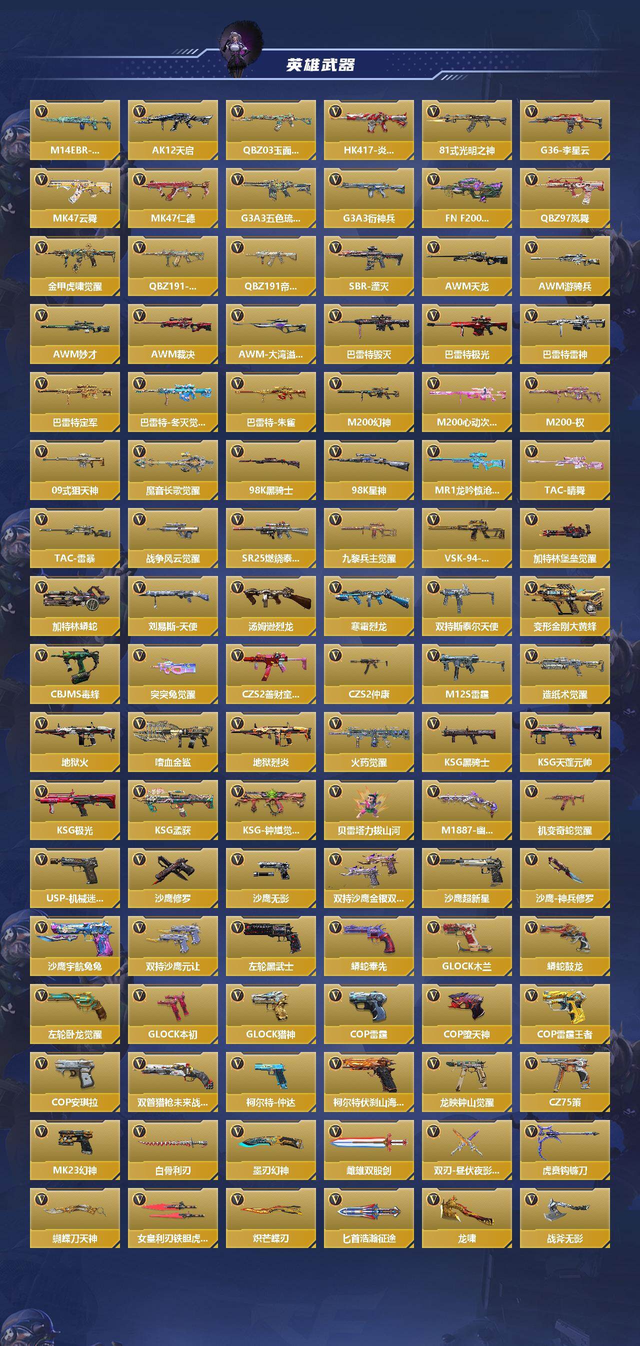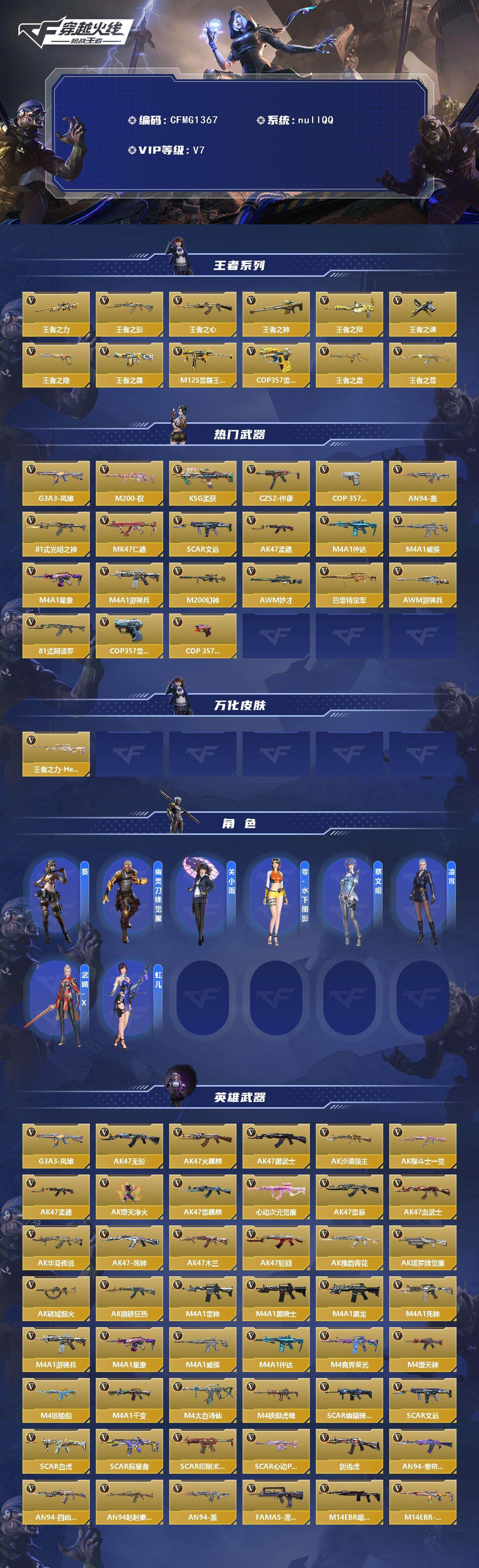 【cfmg1367】vip7/365v/王者之力/王者之影/王者之心/王者之神/王者之狱/王者之魂/王者之隐/王者之霆/m12s-雷霆王者/cop 357-雷霆王者/王者之盘/王者之尊/g3a3-凤雏/m200-权/ksg-孟获/czs2-仲康/cop-357-安琪拉/an94-盖/81式-光明之神/47-仁德/scar-文远/ak47-孟德/m4a1-仲达/m4a1-威侯/m4a1-星象