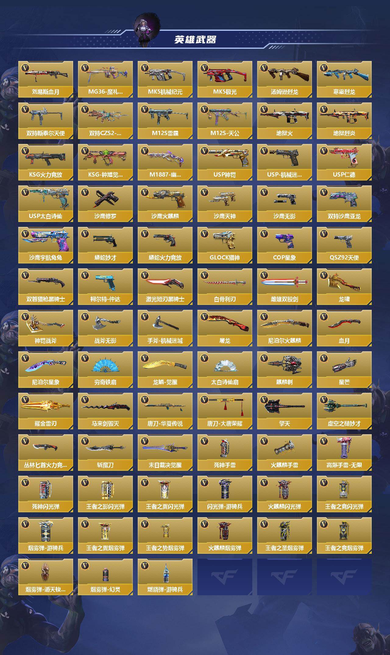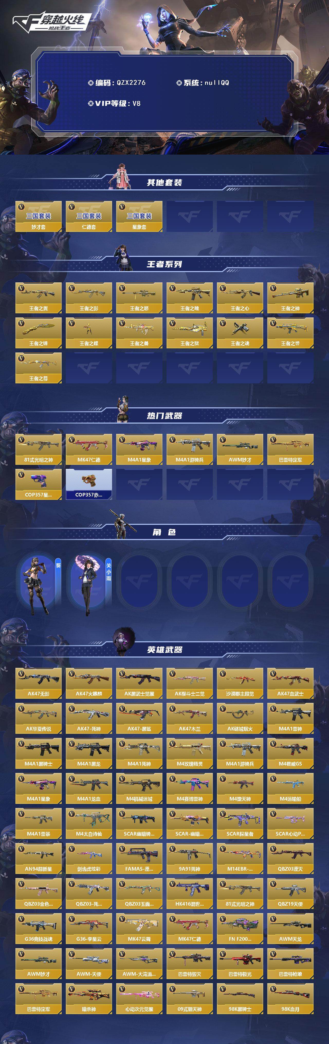 【qzx2276】vip8/236v/仁德套/星象套/妙才套/王者之翼/王者之影/王者之怒/王者之魄/王者之心/王者之神/王者之锋/王者之蝶/王者之兽/王者之狱/王者之魂/王者之誉/王者之尊/81式-光明之神/47-仁德/m4a1-星象/m4a1-游骑兵/awm-妙才/芭蕾特-定军/cop357-星象/cop 357-赤龙/葵/关小雨/ak47-无影/ak47-火麒麟/ak47-黑武士觉醒