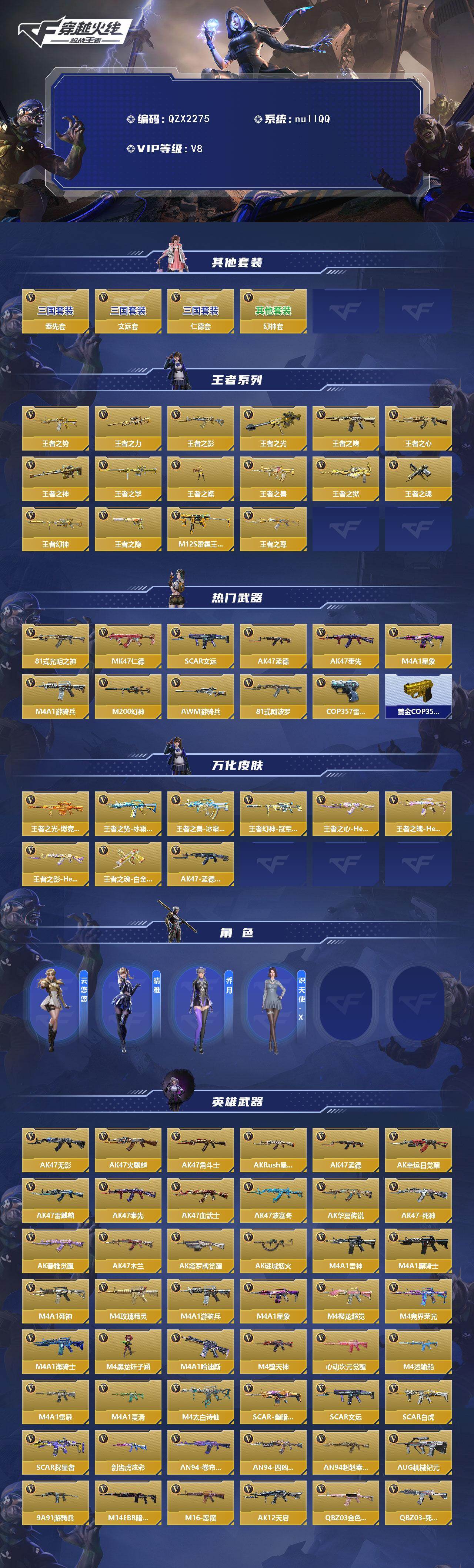 【qzx2275】vip8/349v/文远套/奉先套/仁德套/幻神套/王者之势/王者之力/王者之影/王者之光/王者之魄/王者之心/王者之神/王者之掣/王者之蝶/王者之兽/王者之狱/王者之魂/王者幻神/王者之隐/m12s-雷霆王者/王者之尊/81式-光明之神/47-仁德/scar-文远/ak47-孟德/ak47-奉先/m4a1-星象/m4a1-游骑兵/m200-幻神/awm-游骑兵/81式-