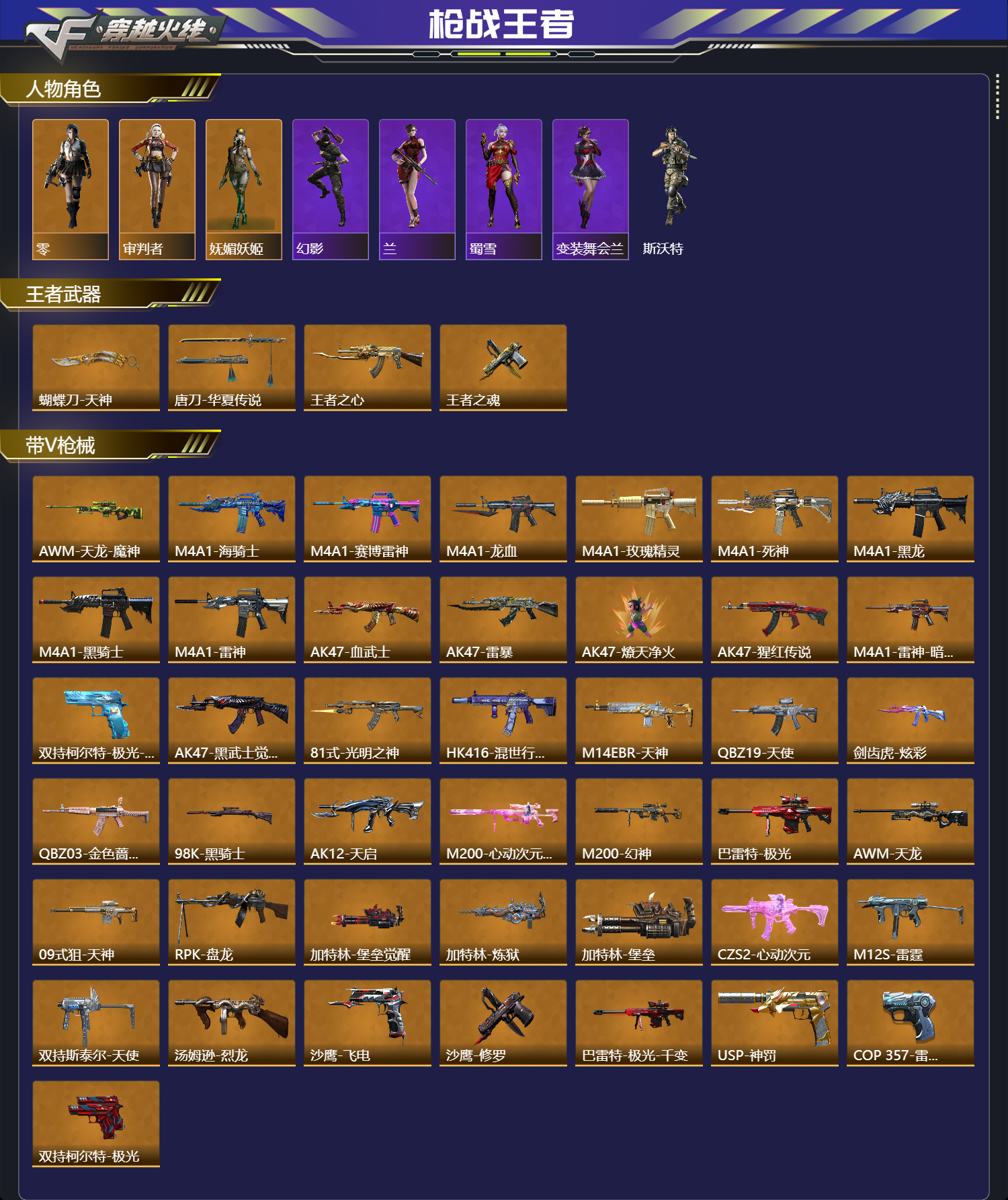 幻神-cop-3王者-角色等级:93,实名:有修改人脸机会/实名是本人,段位:呛皇,vip等级:v4,v武器数量:208,v角色数量:3,v总数量:143,王者武器数:4,万化数量:177,【人物角色】大老师,零,审判者,幻影,兰,赛斯,斯沃特,蜀雪,妩媚妖姬,变装舞会兰,【王者武器】蝴蝶刀-天神,唐刀-华夏传说,王者之心,王者之魂,【带v呛械】awm-天龙-魔神,m4a1-海骑士,m4a1-赛博