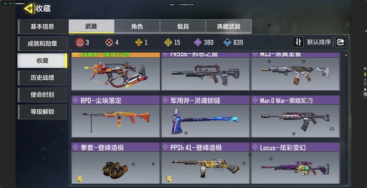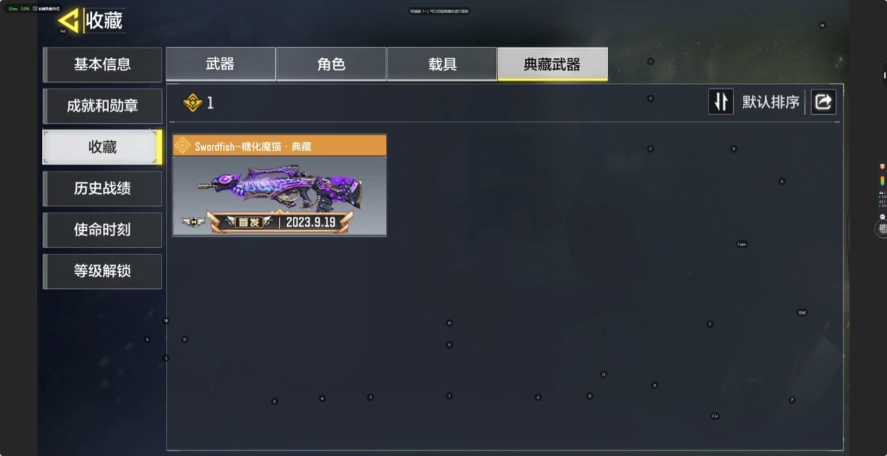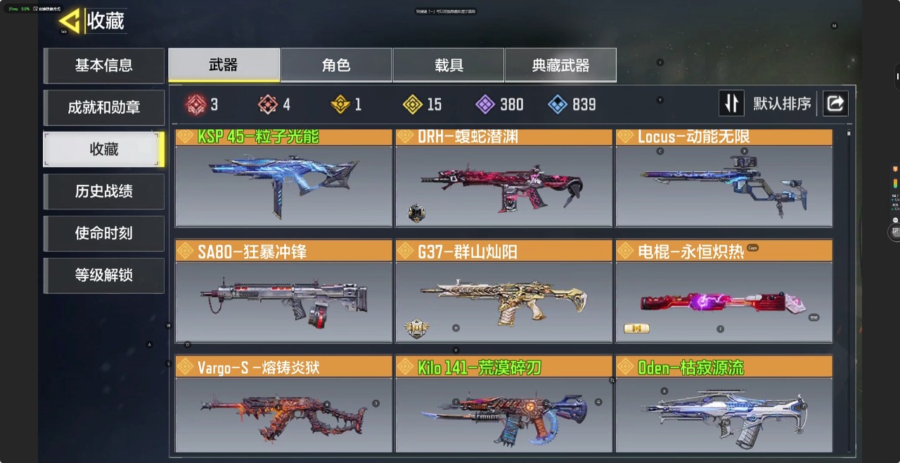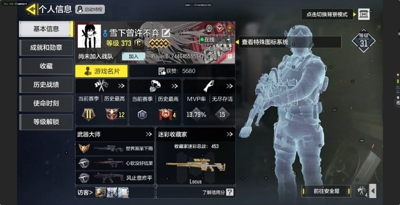 373等级 可二次 段位:大师 满级神话3 神话4 典藏1 传说15 典藏呛械:swdfish-糖化魔猫·典藏 神话呛械:cx-9-希尔芙的庇佑ffar 1-无境空刃fennec-无畏em2-苍穹 传说呛械:sa80-狂暴冲锋type25-赤焰复仇m4-皇家黑魂g3