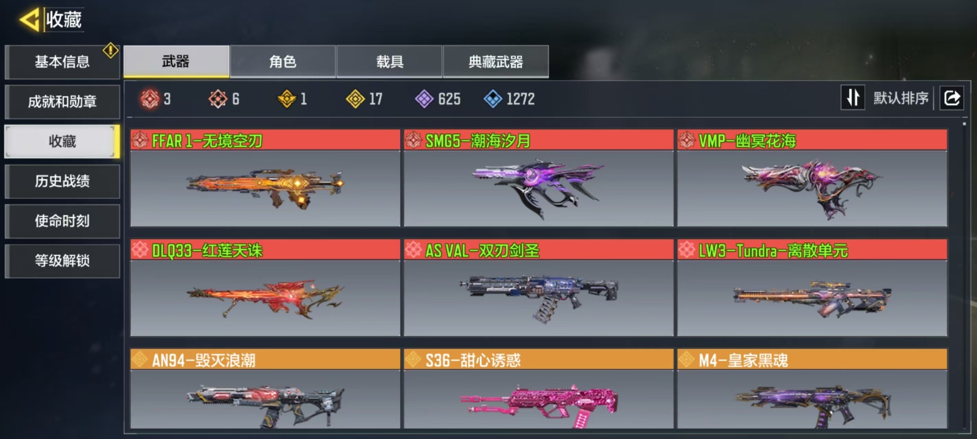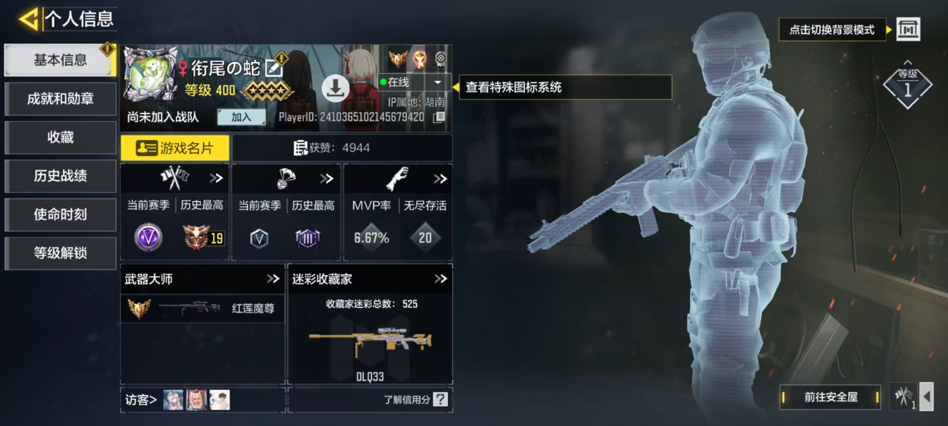 400级 6神话 1典藏 16传说 段位钻石 可二次 可修改实名 神话呛械:smg5-潮海汐月lw3-tundra-离散单元ffar 1-无境空刃dlq33-红莲天诛as val-双刃剑圣vmp-幽冥花海 传说呛械:kn44-寒鸦type25-赤焰复仇sa80-狂暴冲锋an94-毁