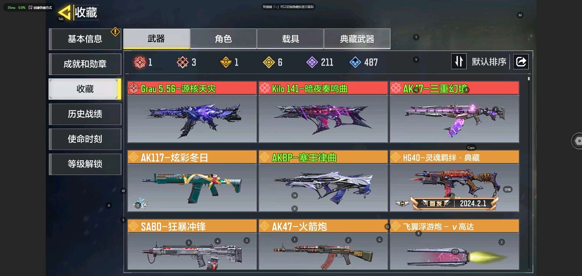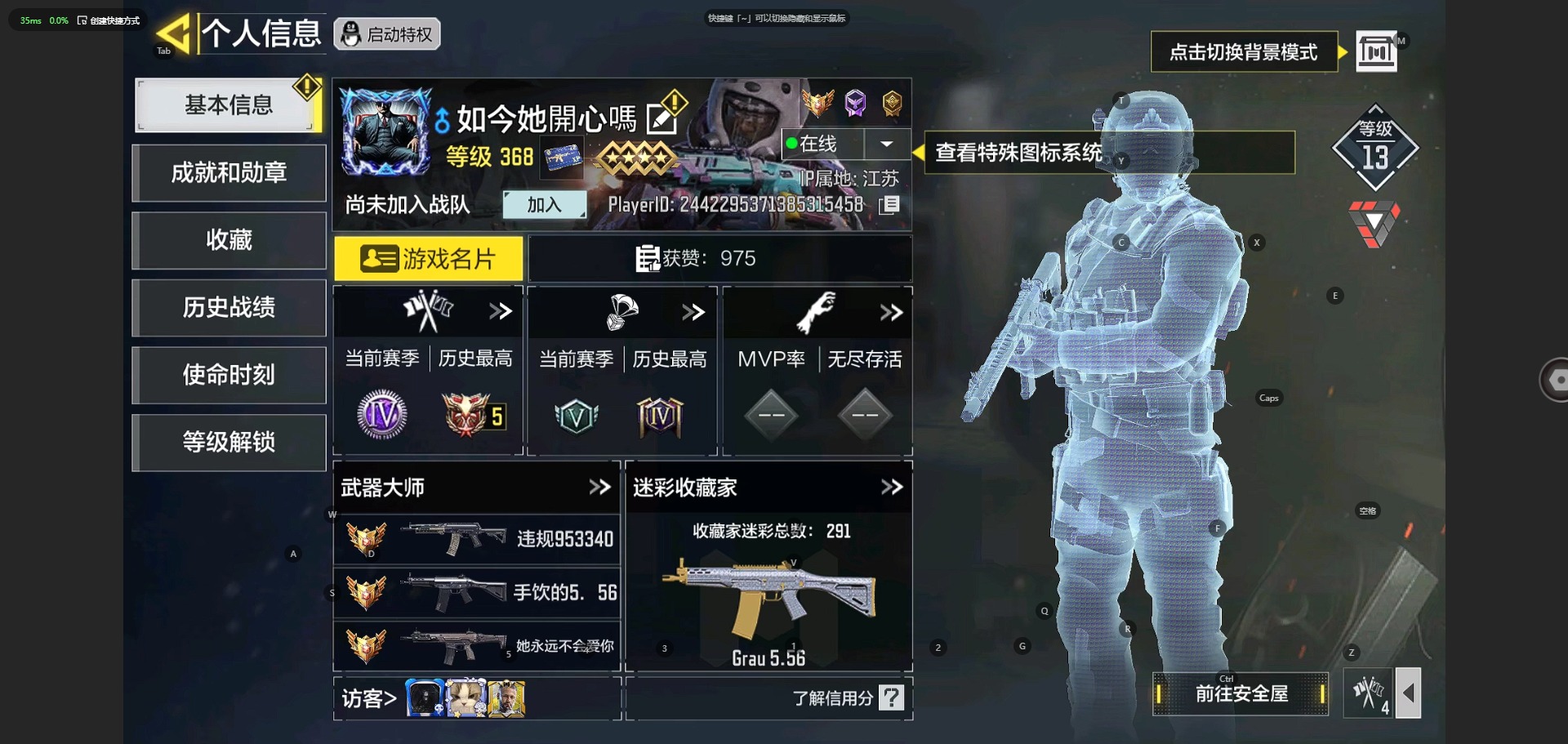 368等级 可二次 可修改实名 段位:钻石 满级神话1 神话3 典藏1 传说6 史诗211 神话角色:海灵-覆海的灵音 典藏呛械:hg40-灵魂羁绊·典藏 神话呛械:grau 5.56-源核天灾kilo141-暗夜奏鸣曲ak47-三重幻境 传说呛械:sa80-狂暴冲锋akbp-塞壬