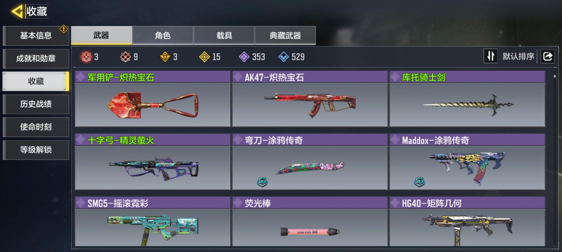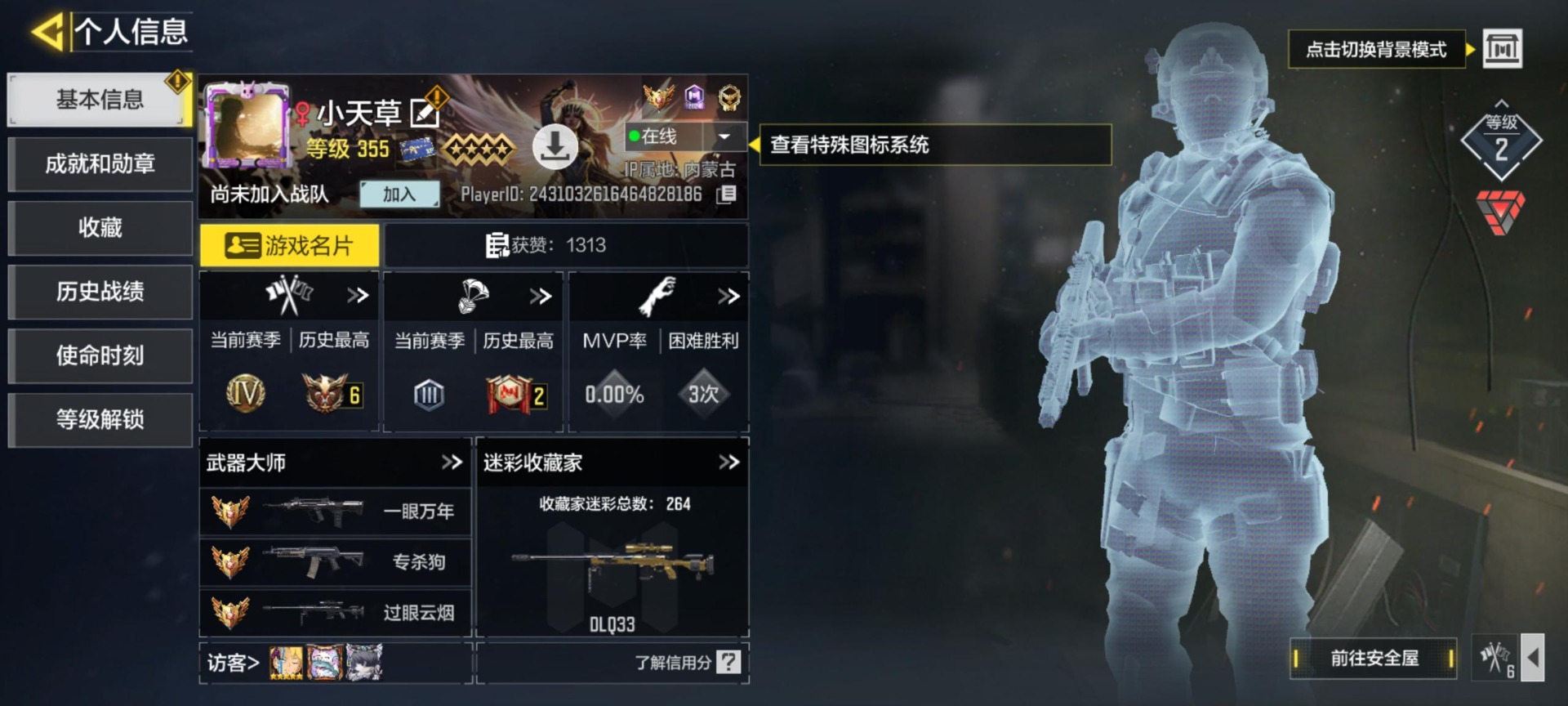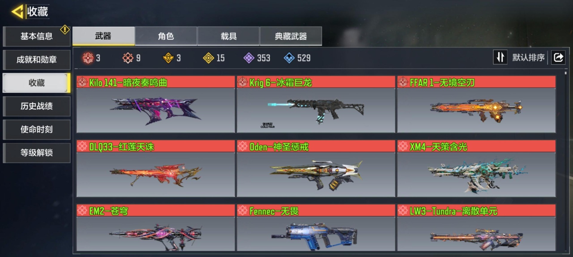 355级 9神话 3典藏 12传说 353史诗 神话角色:幽灵-无终的战域 段位黄金 可二次 可修改实名 优质装备:dlq33-红莲天诛em2-苍穹oden-神圣惩戒kilo141-暗夜奏鸣曲fennec-无畏ffar 1-无境空刃krig 6-冰霜巨龙lw3-tundra-离散