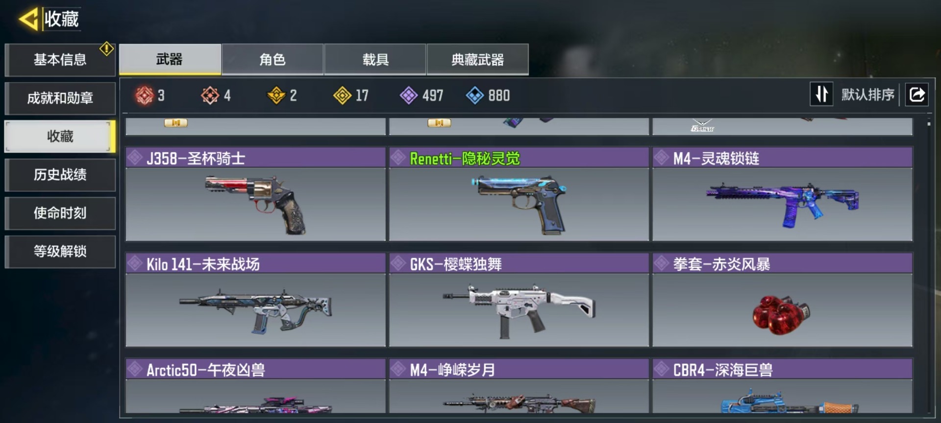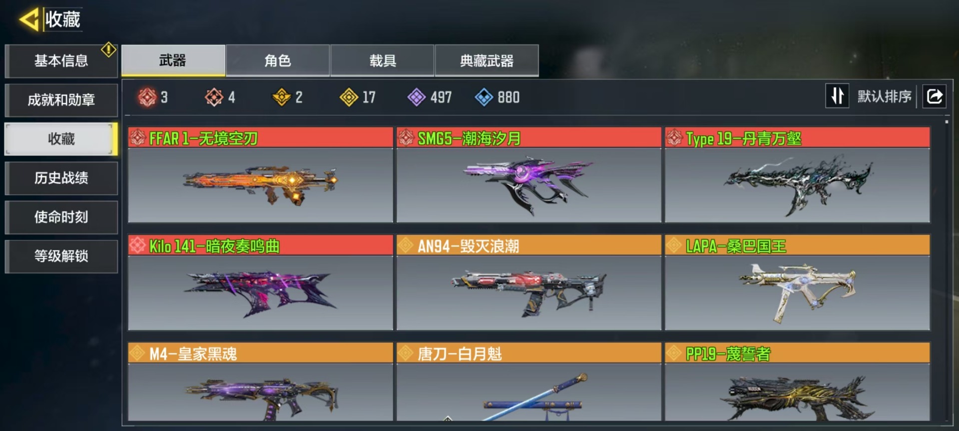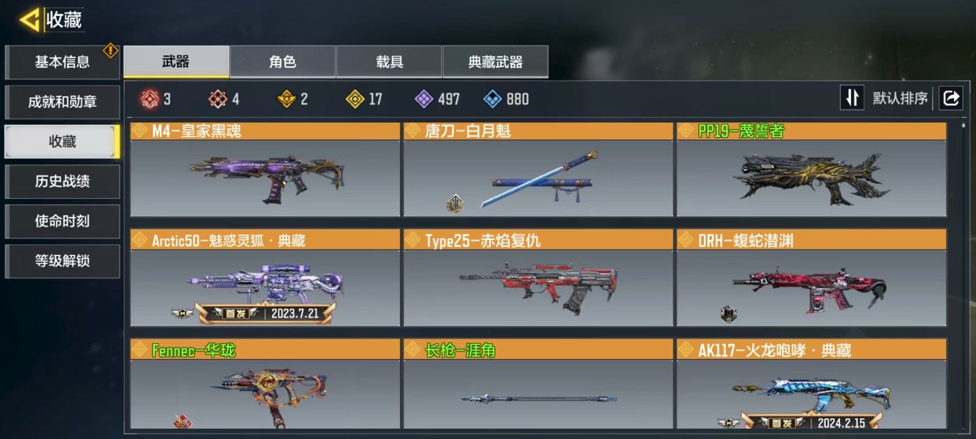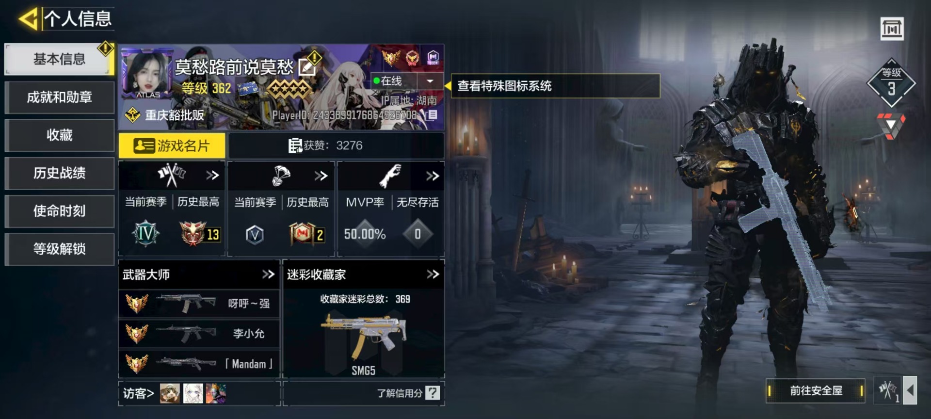 362级 4神话 2典藏 15传说 段位铂金 可二次 可修改实名 典藏呛械:ak117-火龙咆哮·典藏arctic50-魅惑灵狐·典藏 神话呛械:smg5-潮海汐月type19-丹青万壑ffar 1-无境空刃kilo141-暗夜奏鸣曲 传说呛械:type25-赤焰复仇sa80-狂暴冲锋a