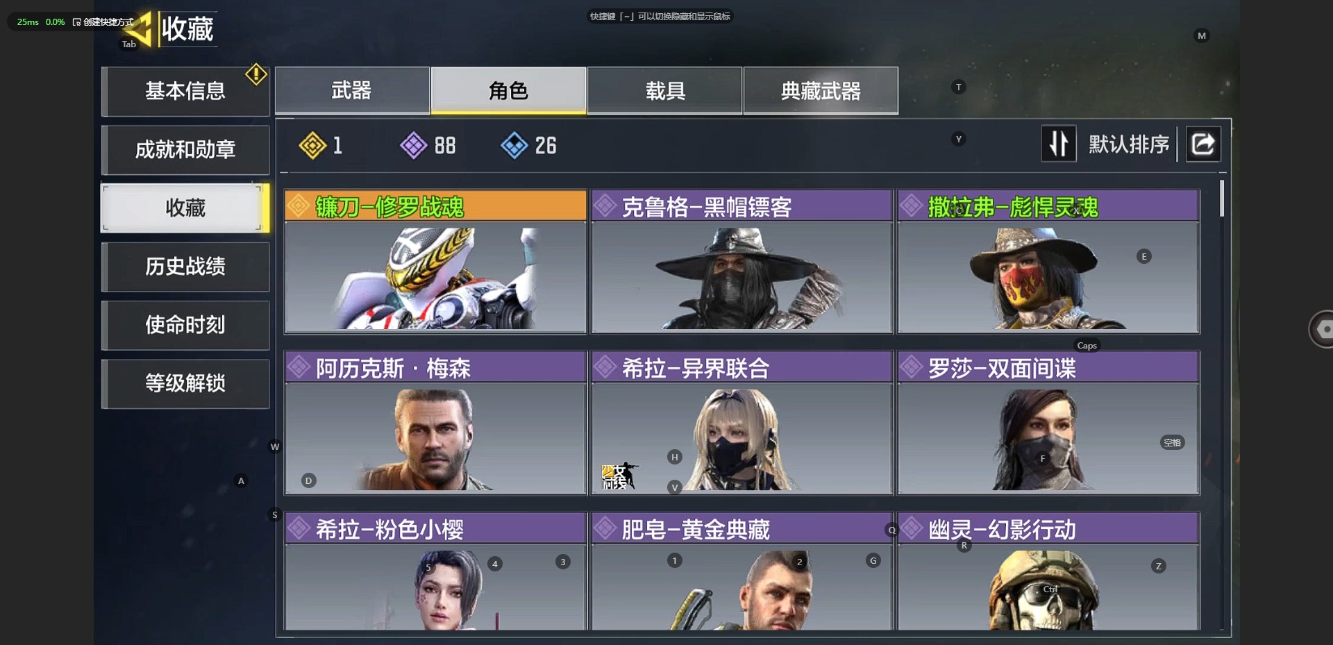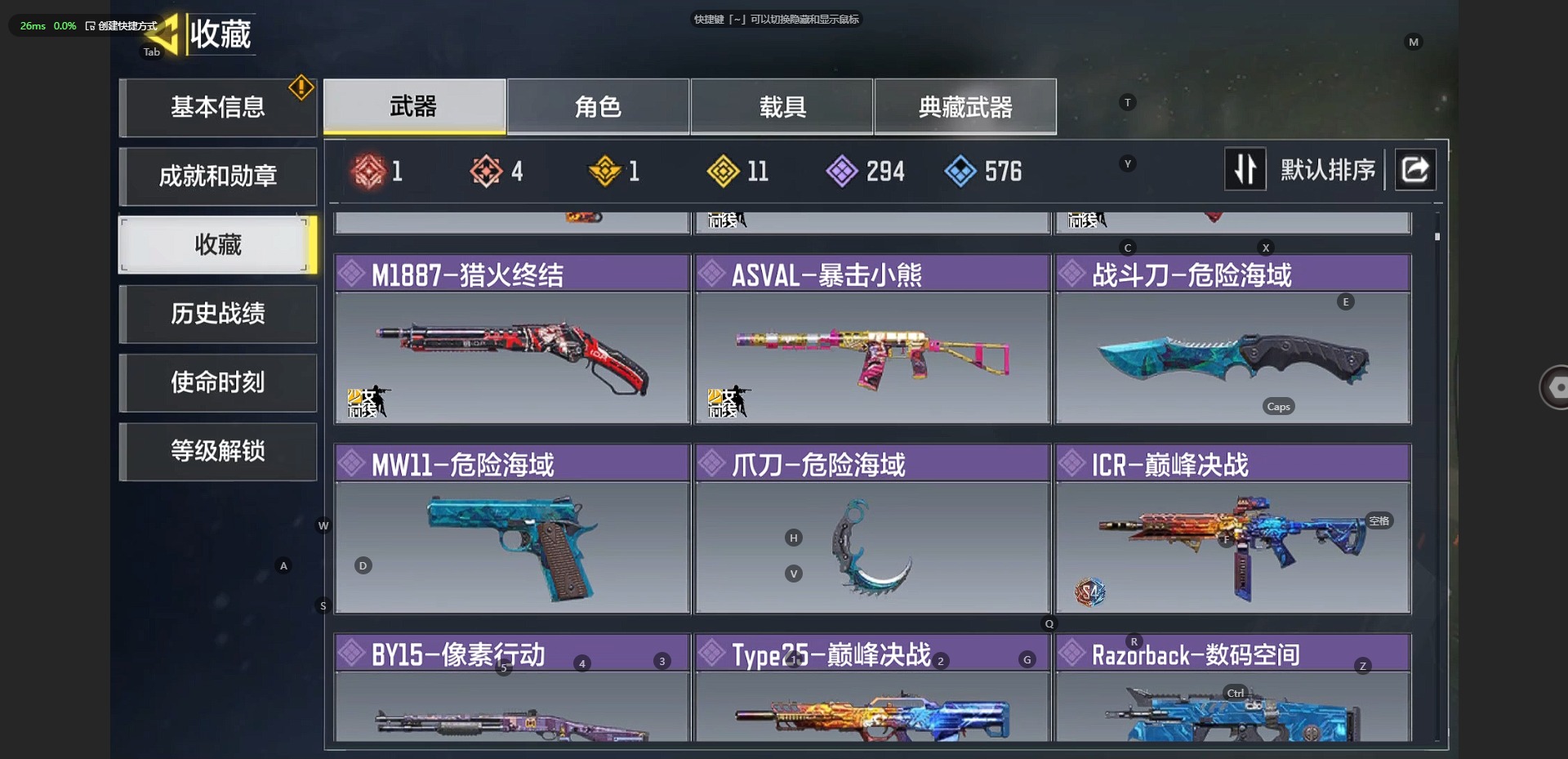 [11432597]实名: 可修改 段位: 无 等级: 277 满级神话1 神话4 典藏1 传说11 史诗294 呛械皮肤: m13-黑耀星辰 holger26-黑暗曙光 kilc141-暗夜奏鸣曲 ak47-三重幻境 mac 10-跃动之星 0utlaw-艳阳时刻 唐刀-白月魁 man0 war-灵魂低语·典藏 an94-毀灭浪潮 an94-异界银狼 spr208-机要特工 冲锋手呛-相位破碎