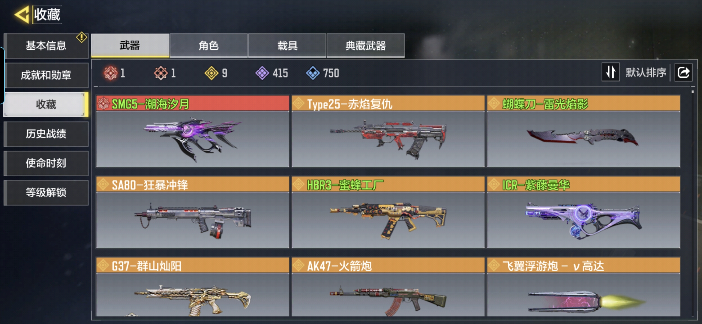 【1红满级9金】安卓q-等级365-史诗呛械415 【1神话】 smg5-潮海汐月(满级)【9传说】 type-赤焰复仇 蝴蝶刀-雷光焰影 sa80-狂暴冲锋 hbr3-蜜蜂工厂 icr-紫藤曼华