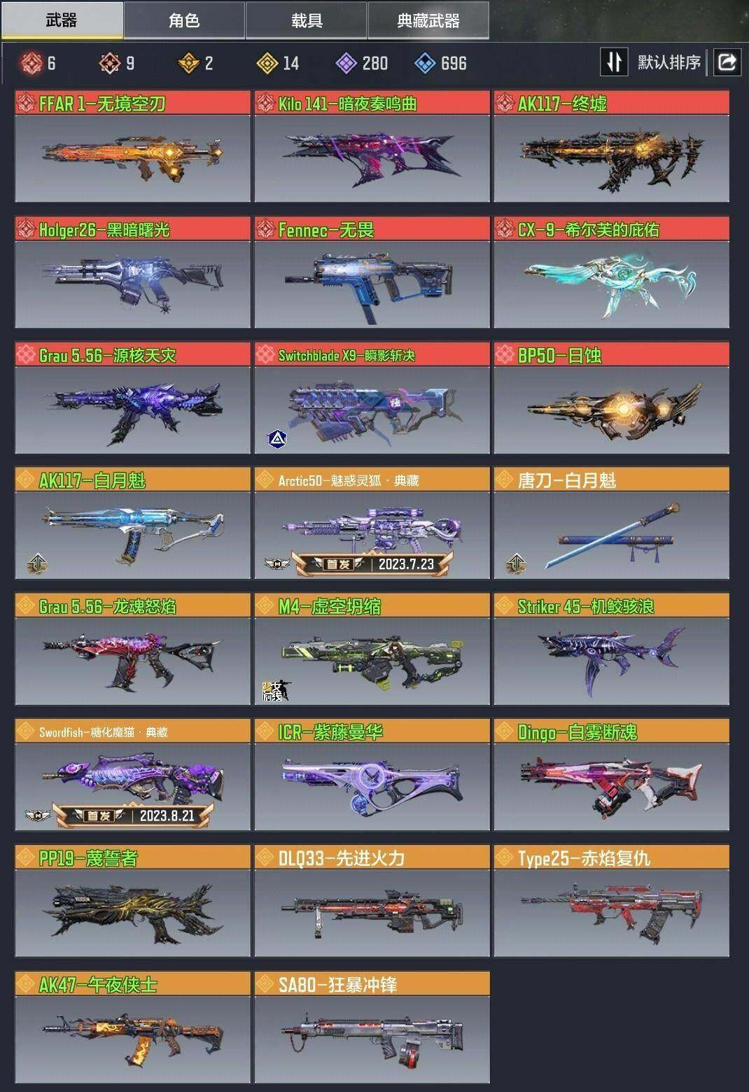 [14106608]【编号68782 可秒换绑】店长推荐特价处理精品号 神话角色数:1/神话武器数:9/典藏数:2/传说武器数:14 arctic50-魅惑灵狐·典藏swdfish-糖化魔猫·典藏holger26-黑暗曙光switchblade x9-瞬影斩决ak117-终墟fennec-无畏ffar 1-无境空刃cx-9-希尔芙的庇佑grau 5.56-源核天灾bp50-日蚀圣殿骑士-库托的誓约唐刀-白月魁ak117-白月魁dingo-白雾断魂dlq33-先进火力ak47-午夜侠士striker 45-机鲛骇浪sa80-狂暴冲锋type25-赤焰复仇pp19-蔑誓者m4-虚空坍缩icr-紫藤曼华