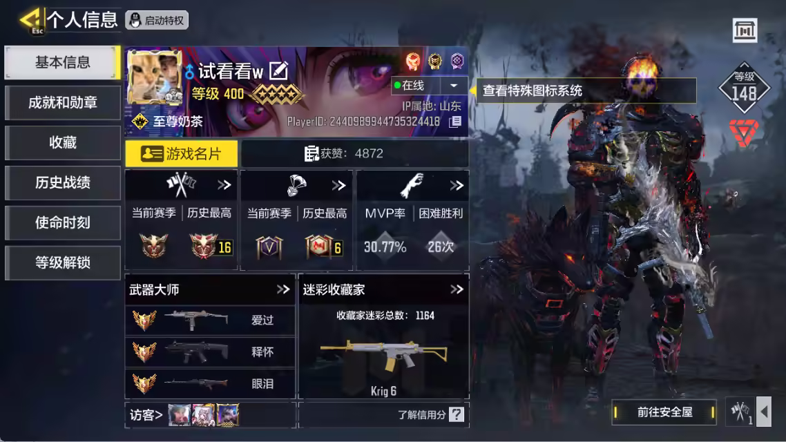 xly4900 亮点:18神话武器2神话角色 游戏区服:苹果qq 实名情况:可二次实名 神话武器数量:18 神话角色数量:2 传说武器数量:51 传说角色数量:1 传说载具数量:1 神话武器:xm4-天策含光满级uss9-焕光跃迁满级jak12-涅槃炎凤满级bp50-日蚀3级mg42-永别满级type19-丹青万壑满级grau556-源核天灾3级cx9-希尔芙的庇佑满级ak117-终墟3级smg5-潮海汐月满级krig6-冰霜巨龙满级oden-神圣惩戒2级ak47-三重幻境4级kilo141-暗夜奏鸣曲2级m13-黑曜星辰3级amr-亚特兰蒂斯满级fennec-无畏4级 神话角色:索菲亚-砺锋的希冀(觉醒)幽灵-无终的战域(觉醒) 传说典藏武器:ak47-炎舞慕雪mx9-无心一击agr-圣骑之刃swdfish-糖化魔猫sks-粒子震击ak117-火龙咆哮hades-永夜黑骑hvk30-街机霸王 传说辉光武器: 传说武器:an94-毁灭浪潮s36-甜心诱惑50gs-路阻且长十字弓-动能电流an94-异界银狼ak117-炫彩冬日cdite-零度吞噬spr208-斗转星移kar98k-雷鸣光束m4-皇家黑魂sks-光之神域fennec-终焉之光dobvra-渊影浮光ak47-月华星辉0ts-深渊业火pp19-蔑誓者icr-紫藤曼华m16-翎雀泣type25-赤焰复仇钗-火神乐m1887-闪耀明星maddox-晶流梦魇drh-蝮蛇潜渊sa80-狂暴冲锋aks74u-凛冬盛典akbp-塞壬律曲蝴蝶刀-雷光焰影kn44-灼火xpr50-白狼牙type63-掠星号bruenmk9-月球巡航蛇刃-银蛇舞manowar-狱海焰火g37-群山灿阳电棍-永恒炽热cr56-回音律动ak47-火箭炮飞翼浮游炮v高达ffar1星彩乐手aks74u神灯灵愿rpd-一路悠扬 传说角色:蔷薇刺客-碧海瑶光 热门角色: 传说载具:滑雪板-沙蚀边界