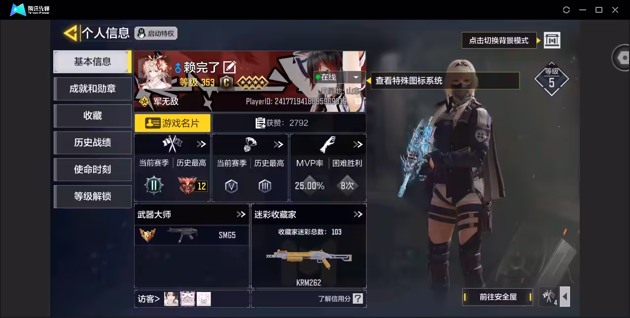 xly4905 亮点:6神话-满级冰龙-涡轮 游戏区服:安卓qq 实名情况:可二次实名 神话武器数量:6 神话角色数量:0 传说武器数量:11 传说角色数量:0 传说载具数量: 神话武器:cx9-希尔芙的庇佑1级smg5-潮海汐月3级krig6-冰霜巨龙满级oden-神圣惩戒2级m13-黑曜星辰2级amr-亚特兰蒂斯2级 神话角色: 传说典藏武器:ak117-火龙咆哮 传说辉光武器: 传说武器:reti-钢铁幻影an94-毁灭浪潮arctic50-青眸白虎s36-甜心诱惑type25-赤焰复仇sa80-狂暴冲锋dobvra-渊影浮光krm262-巨擎涡轮龙泉剑-七星龙渊hdr-狂笑终章 传说角色: 热门角色:希拉-异界联合 传说载具: