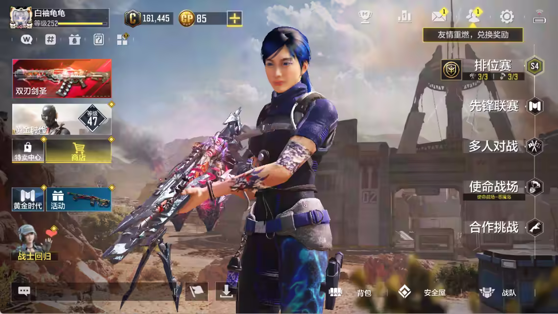 xly4919 亮点:5神话/星瞳 游戏区服:安卓qq 实名情况:可二次实名 神话武器数量:5 神话角色数量: 传说武器数量:16 传说角色数量: 传说载具数量:1 神话武器:vmp-幽冥花海2级bp50-日蚀type19-丹青万壑kilo141-暗夜奏鸣曲2级 神话角色: 传说典藏武器:hades-永夜黑骑chopper-地狱猎犬 传说辉光武器: 传说武器:m4-皇家黑魂type25-赤焰复仇sa80-狂暴冲锋pp19-星乐章an94-暗影封禁电棍-永恒炽热cr56-回音律动ak47-火箭炮ffar1星彩乐手飞翼浮游炮v高达rpd-一路悠扬aks74u神灯灵愿 传说角色: 热门角色:霄羽-星瞳 传说载具:兰博基尼-achlp400
