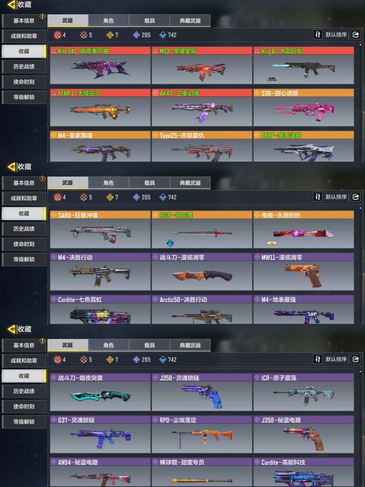 【6红4满7金】安卓q-等级359-史诗呛械265【6神话】 覆海灵音 kilo141-暗夜奏鸣曲满级 m13-黑耀星辰满级 krig6-冰霜巨龙满级 ak47-三重幻境满级 ffar 1-无境空刃 【7传说】 s36-甜心诱惑 akbp-塞王律曲 type25-赤焰复仇 m4-皇家黑魂 sa80-狂暴冲锋 蛇刃-银蛇舞 电棍-永恒炽热