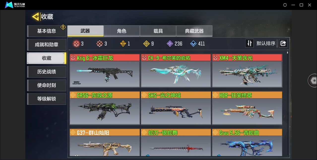 [14347405][9762176]【保证金商户】【编号69841】【3满级神话武器 9传说(1典藏)】 krig 6-冰霜巨龙 cx-9-希尔芙的庇佑 xm4-天策含光 cr56-灰寂之源 sks-光之神域 hdr-狂笑终章 g37-群山灿阳 蛇刃-银蛇舞 grau 5.56-青蛇曲 hvk30-街机霸王·典藏 电棍-永恒炽热 cr56-回音律动