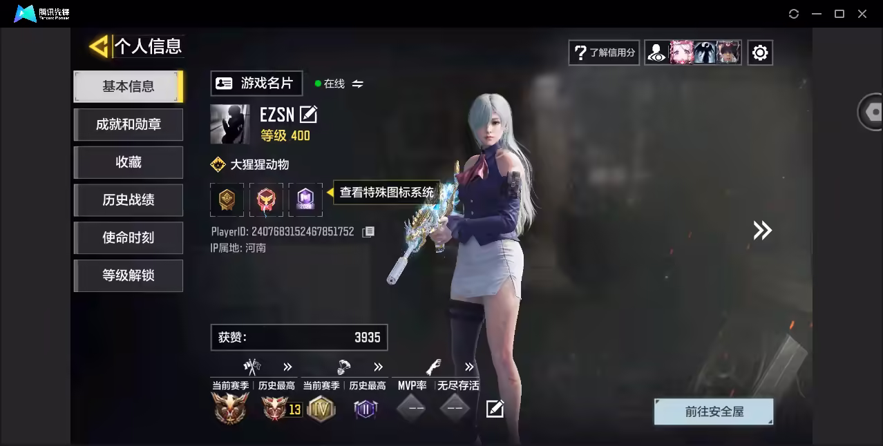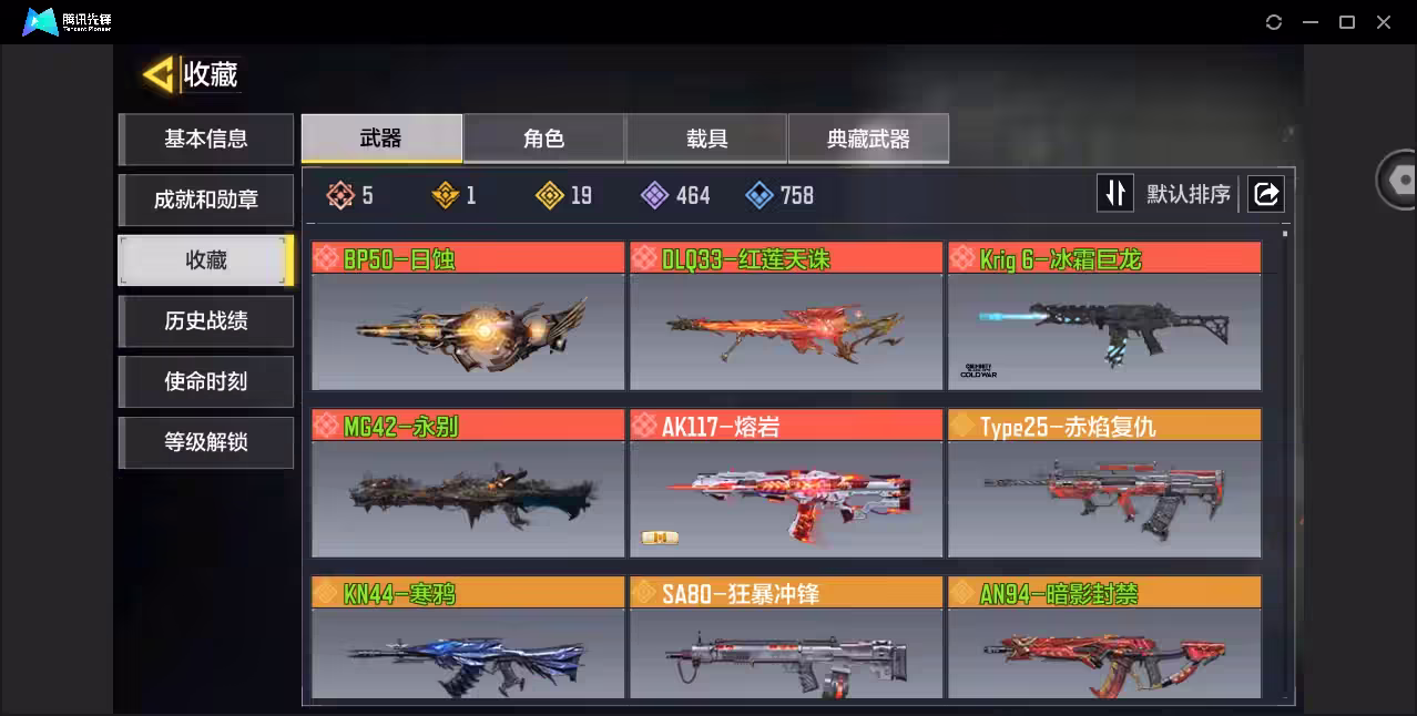 xly5908 亮点:4神话/动能 游戏区服:安卓qq 实名情况:可二次实名 神话武器数量:4 神话角色数量:0 传说武器数量:19 传说角色数量:0 传说载具数量:0 神话武器:bp50-日蚀2级mg42-永别4级dlq33-红莲天诛2级krig6-冰霜巨龙3级 神话角色: 传说典藏武器:hades-永夜黑骑 传说辉光武器: 传说武器:kn44-寒鸦an94-暗影封禁sa80-狂暴冲锋type25-赤焰复仇m4-皇家黑魂dlq33-先进火力hdr-狂笑终章locus-动能无限g37-群山灿阳电棍-永恒炽热cr56-回音律动ak47-火箭炮ffar1星彩乐手rpd-一路悠扬aks74u神灯灵愿striker一源代码0l033-狂热祈愿 传说角色: 热门角色: 传说载具: