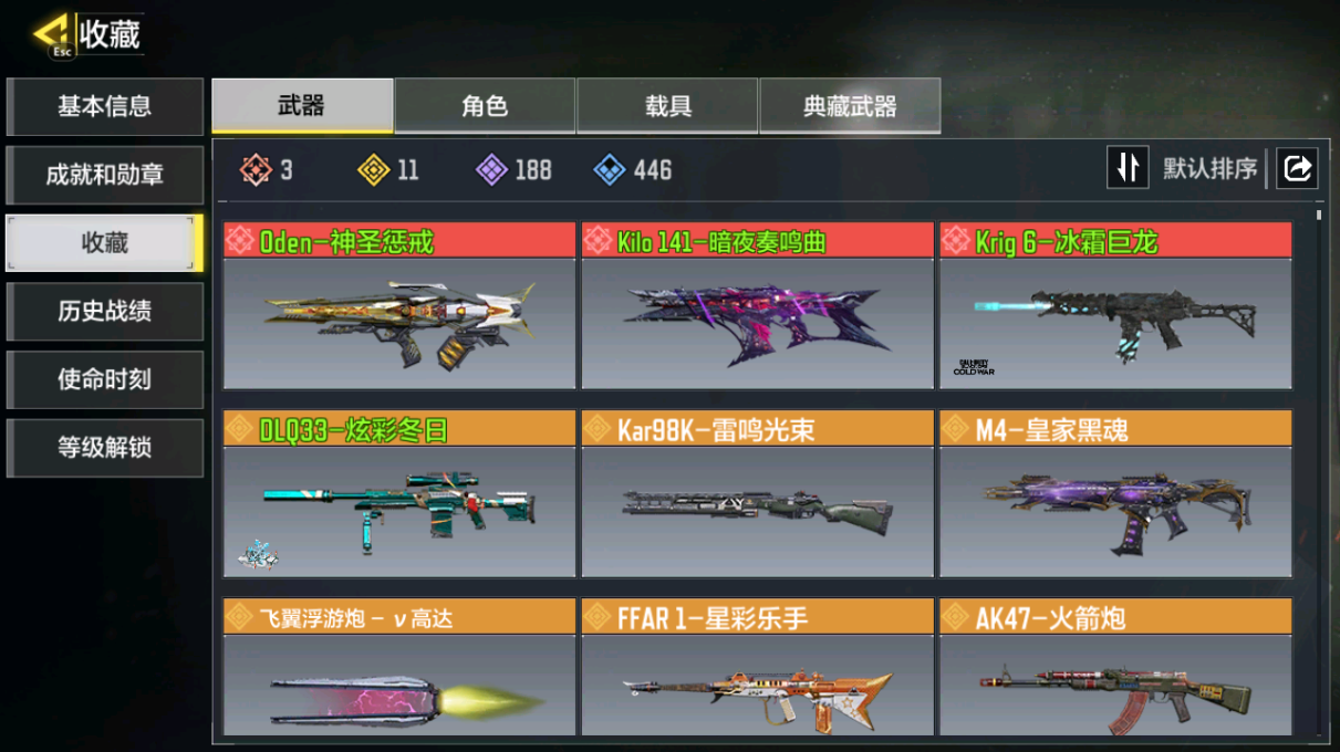 3神话11传说安卓qq,实名状态:可改实名,段位:战神,神话武器数量:3,传说武器数量:11,【神话武器】krig6-冰霜巨龙,oden-神圣惩戒,kilo141-暗夜奏鸣曲,【传说武器】ak47-火箭炮,飞翼浮游炮-v高达,aks 74u-神灯灵愿,ffar 1-星彩乐手,rpd-一路悠扬,m4-皇家黑魂,dlq33-炫彩冬日,cbr4-潘帕斯雄鹰,lapa-桑巴国王,kar98k-雷鸣光束,