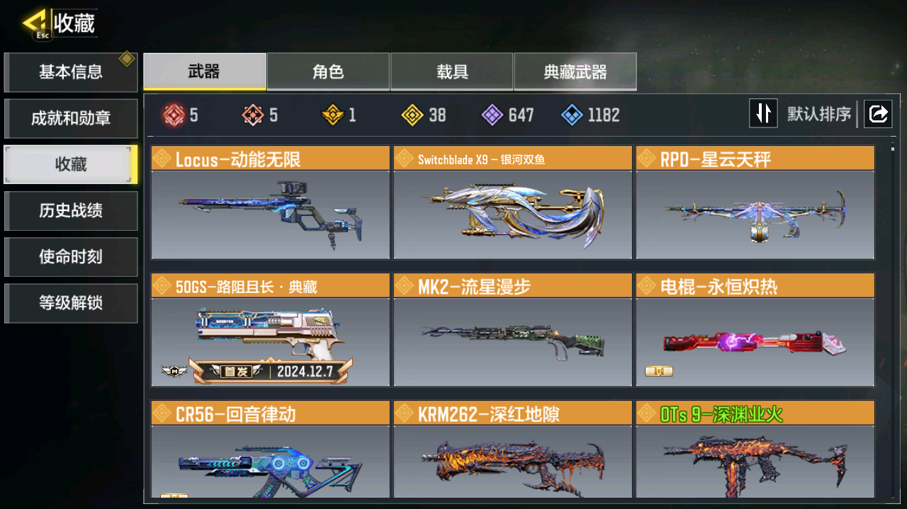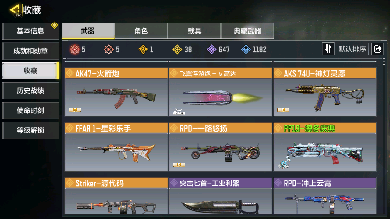 5神话5满级38传说动能-各种热门角色-神话武器数量:5,传说武器数量:38,【典藏武器】50gs-路阻且长·典藏,【神话武器】ak47-三重幻境,kilo141-暗夜奏鸣曲,ffar 1-无境空刃,ak117-熔岩,mg42-永别,【传说武器】电棍-永恒炽热,ak47-火箭炮,cr56-回音律动,飞翼浮游炮-v高达,aks 74u-神灯灵愿,ffar 1-星彩乐手,rpd-一路悠扬,thump