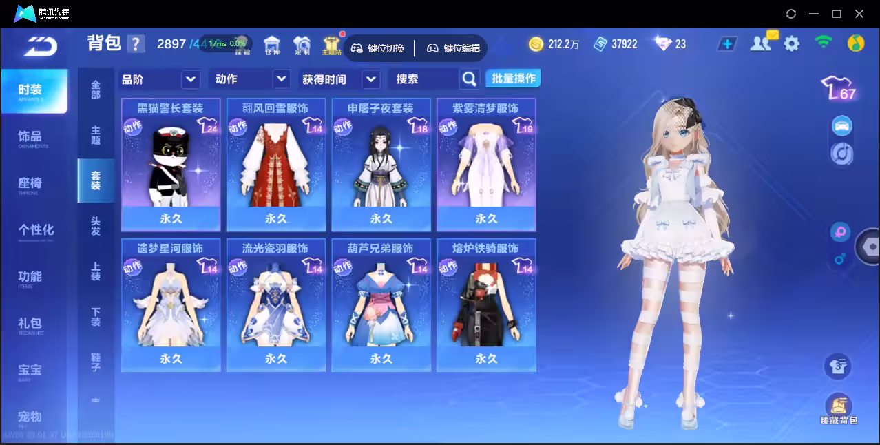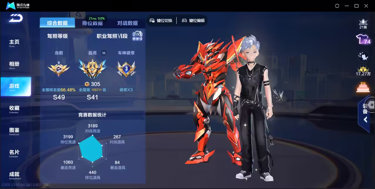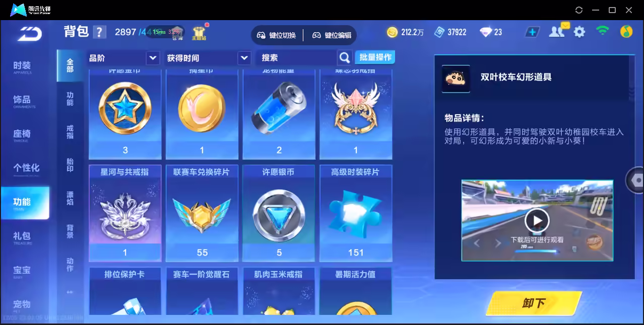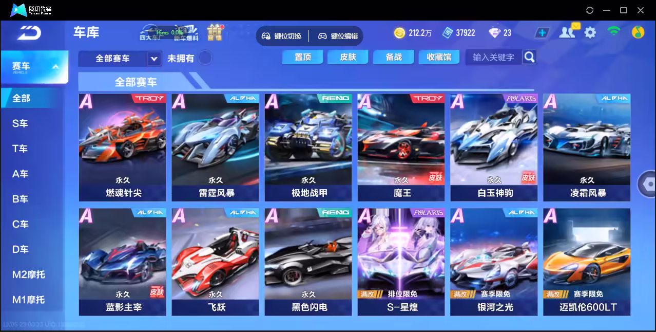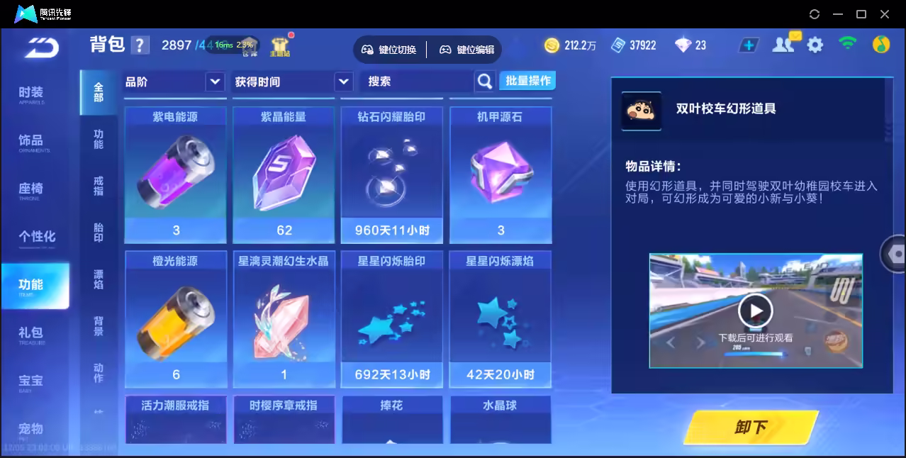 xly4928 亮点:3t云逍哈雷特鸭宝超人/2联赛幻星冰魄 实名情况:可二次实名 游戏区服:安卓qq vip等级:10 t车数量:3 a车数量:53 永久t车:哈雷特鸭宝超人云逍 t车皮肤:炽焰龙骑 联赛车:s-冰魄s-幻星 幻生套: 魔法套:今生不渝鲸徊夜梦皓月霜华星之王冠 竞速宠物:玉玺神虎金铠傲甲 道具宠物:
