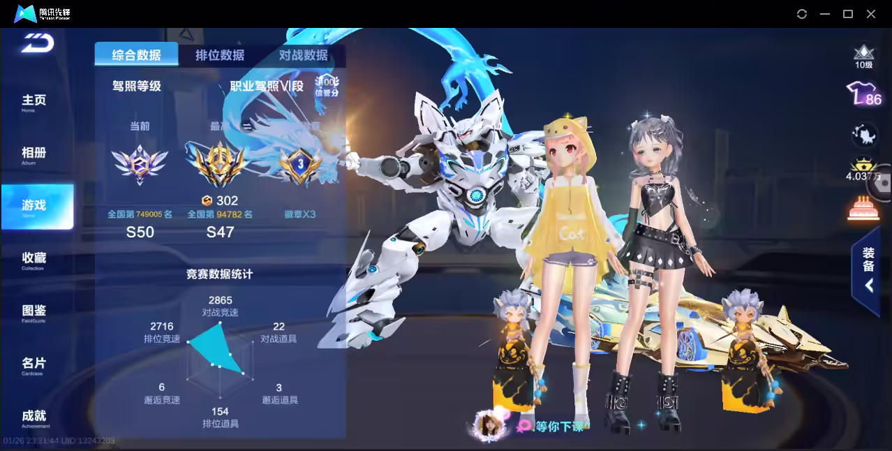 xly5747 亮点:青龙敖丙/幻星 实名情况:不可二次实名 游戏区服:安卓qq vip等级:8 t车数量:1 a车数量:20 永久t车:墨影青龙 t车皮肤:敖丙墨影青龙 联赛车:s-幻星 幻生套: 魔法套: 竞速宠物:玉玺神虎 道具宠物: