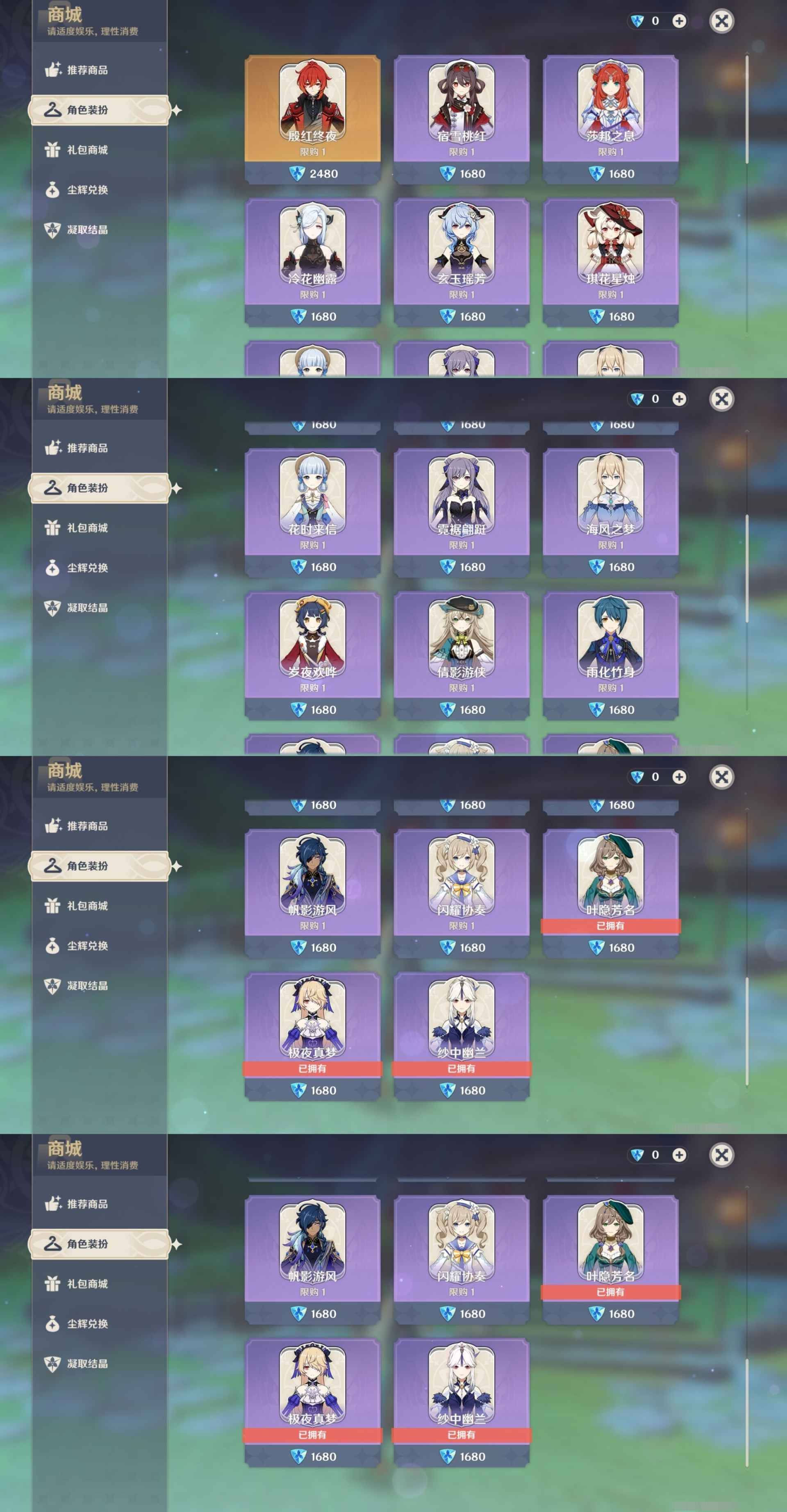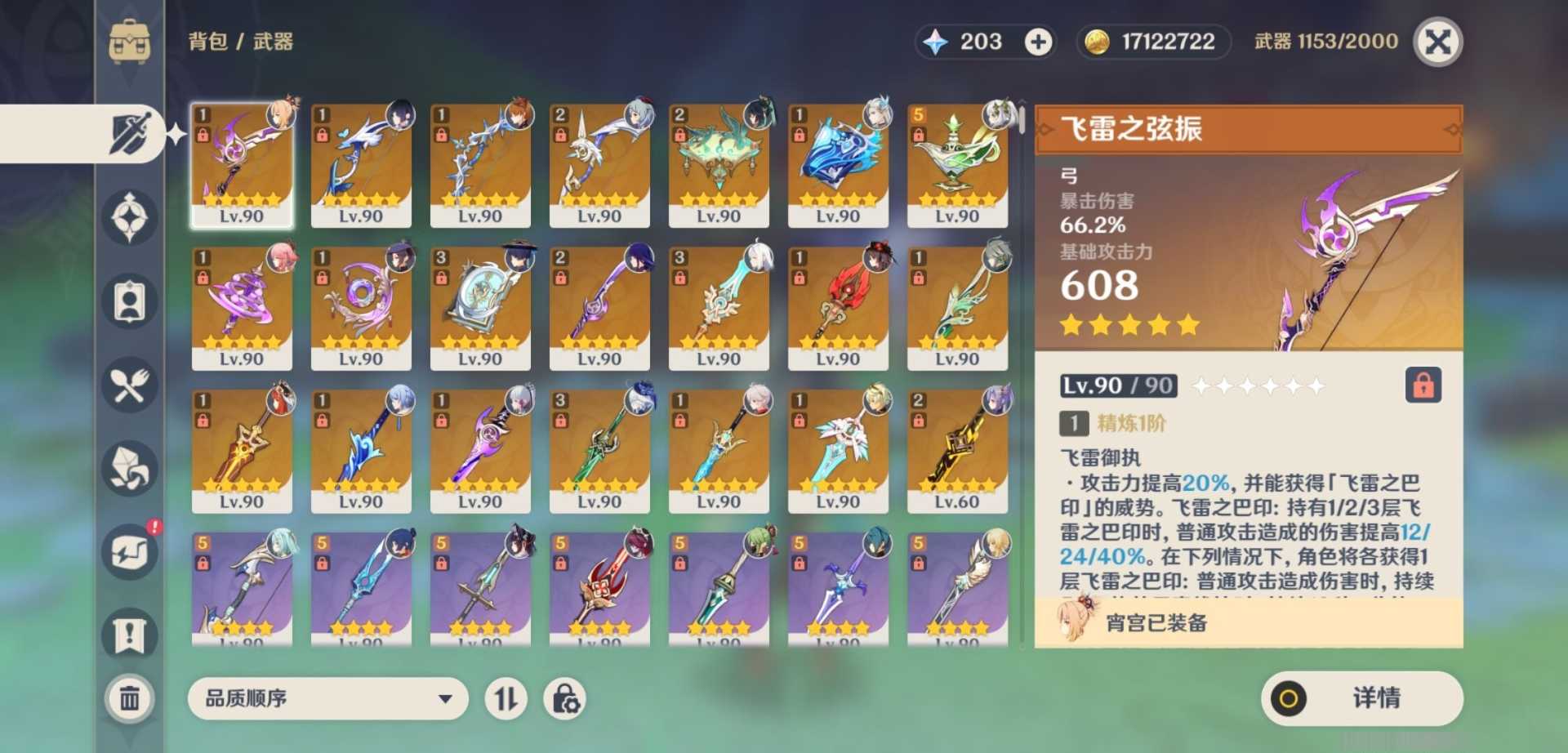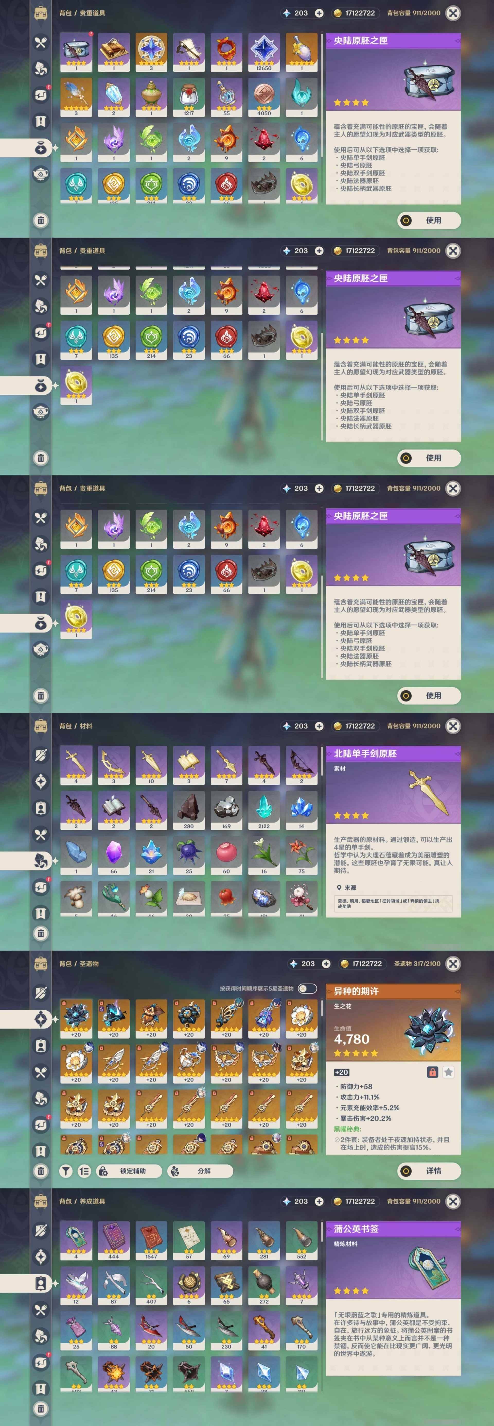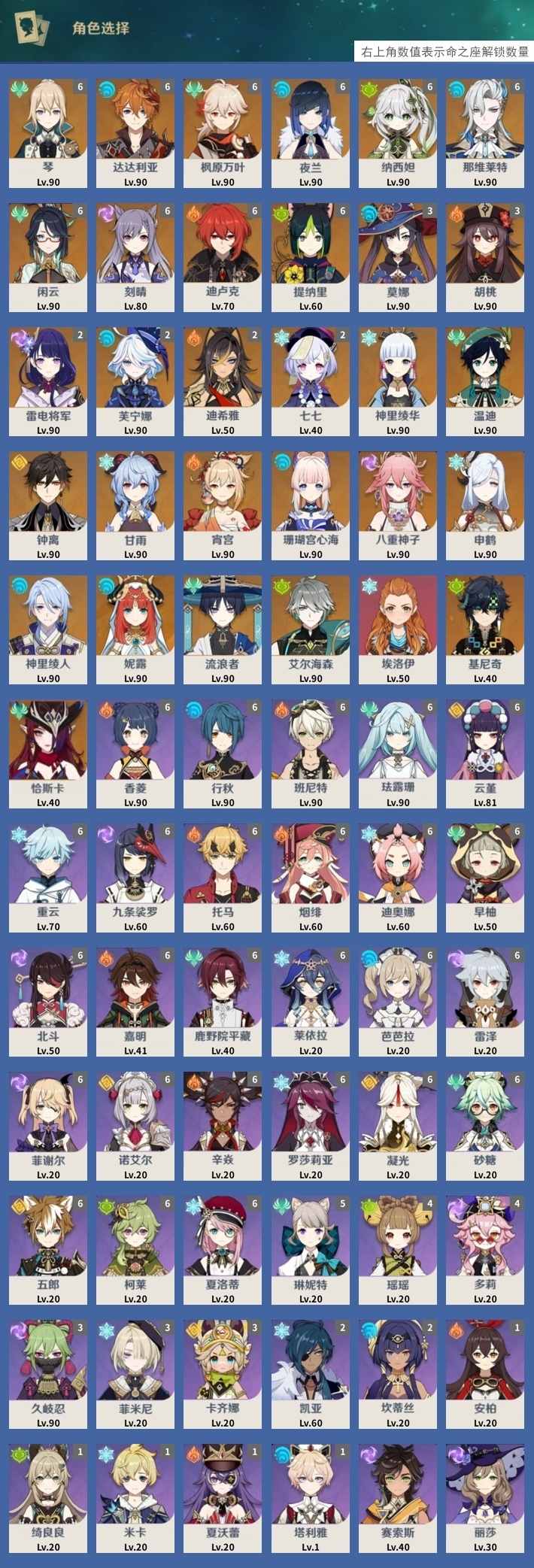 [9675875]140黄 风:6命闲云,6命枫原万叶,0命恰斯卡,0命流浪者,0命温迪,6命琴 火:0命宵宫,3命胡桃,6命迪卢克,2命迪希雅 水:6命那维莱特,6命夜兰,6命达达利亚,2命芙宁娜,0命妮露,0命神里绫人,0命珊瑚宫心海,3命莫娜 冰:0命申鹤,0命甘雨,0命神里绫华,0命埃洛伊,2命七七 岩:0命钟离 雷:0命八重神子,2命雷电将军,6命刻晴 草:0命基尼奇,6命纳西妲,0命艾尔海森,6命提纳里 弓:精1飞雷之弦振,精1若水,精1冬极白星,精2阿莫斯之弓 法器:精2鹤鸣余音,精1万世流涌大典,精5千夜浮梦,精1神乐之真意,精1不灭月华,精3四风原典 单手剑:精1裁叶萃光,精1圣显之钥,精1波乱月白经津,精1雾切之回光,精3磐岩结绿,精1苍古自由之誓,精1天空之刃,精2斫峰之刃 长柄武器:精2薙草之稻光,精3天空之脊,精1护摩之杖 【角色皮肤】 四星角色:丽莎-叶隐芳名,菲谢尔-极夜真梦,凝光-纱中幽兰