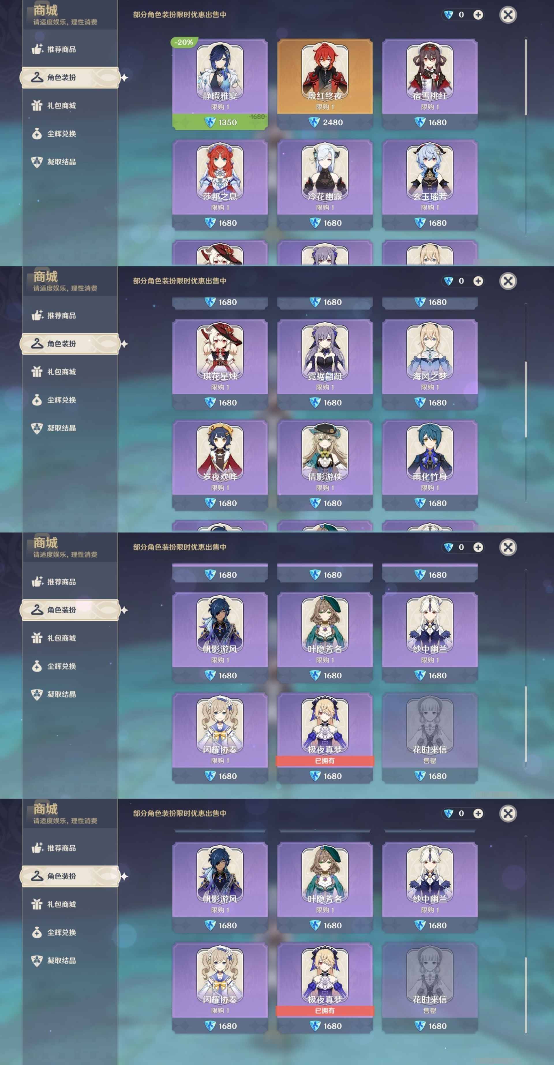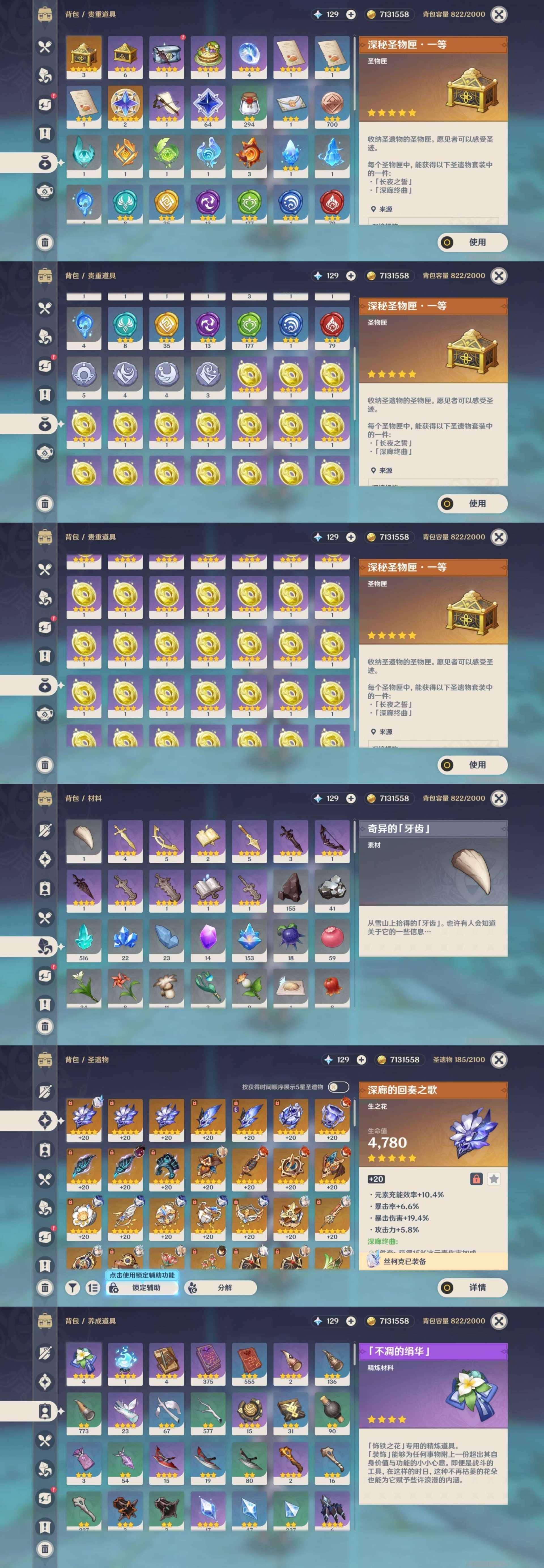 [10693193]36黄 风:0命枫原万叶,0命恰斯卡,2命琴 火:0命玛薇卡,0命迪卢克 水:0命莫娜,0命那维莱特,0命芙宁娜 冰:6命神里绫华,2命申鹤,0命丝柯克,1命七七,0命甘雨 岩:0命钟离 雷:0命雷电将军,1命刻晴 草:0命纳西妲,0命提纳里 弓:精1阿莫斯之弓,精1天空之翼,精1天空之翼 法器:精1金流监督 单手剑:精1雾切之回光 长柄武器:精1息灾 【角色皮肤】 五星角色:神里绫华-花时来信 四星角色:菲谢尔-极夜真梦