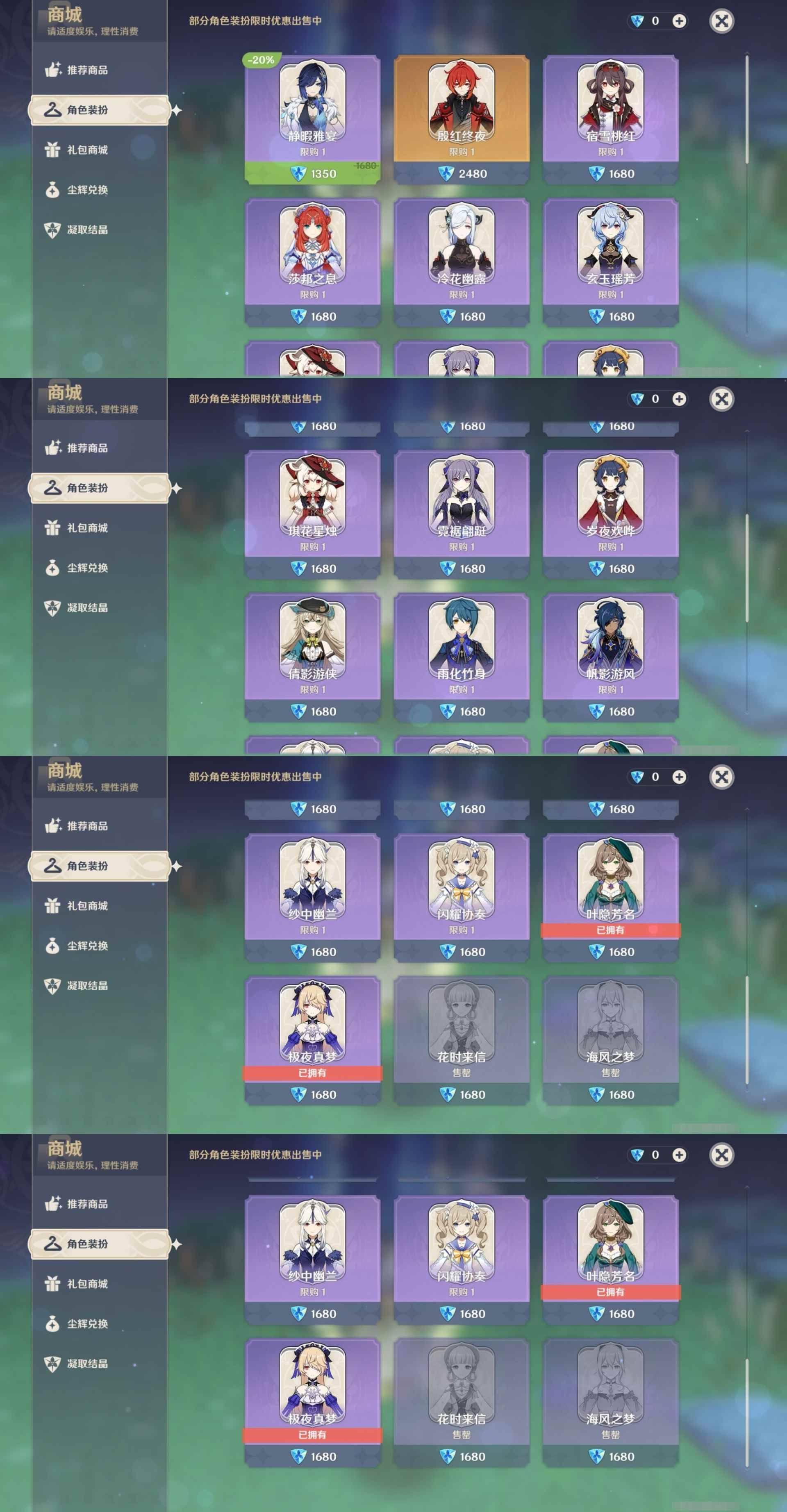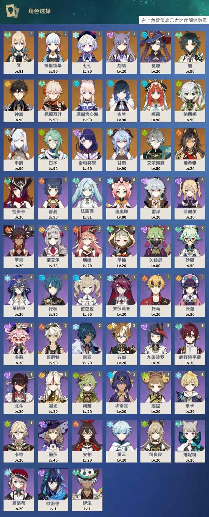 [11057714]33黄 风:0命枫原万叶,0命魈,3命琴,0命恰斯卡 火:0命迪希雅 水:0命妮露,0命夜兰,0命珊瑚宫心海,1命莫娜 冰:0命申鹤,0命甘雨,2命神里绫华,1命七七 岩:0命钟离 雷:0命雷电将军,1命刻晴 草:0命纳西妲,0命白术,0命艾尔海森 法器:精1千夜浮梦 单手剑:精1雾切之回光,精1苍古自由之誓 长柄武器:精1和璞鸢,精1和璞鸢,精1天空之脊 【角色皮肤】 五星角色:神里绫华-花时来信,琴-海风之梦 四星角色:丽莎-叶隐芳名,菲谢尔-极夜真梦