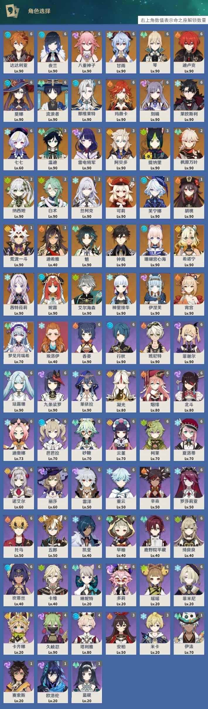 [11420225]231黄 风:6命流浪者,2命枫原万叶,0命魈,3命温迪,6命琴,0命梦见月瑞希 火:6命玛薇卡,0命宵宫,1命胡桃,1命可莉,6命迪卢克,1命迪希雅 水:1命芙宁娜,6命那维莱特,0命妮露,6命夜兰,0命珊瑚宫心海,6命莫娜,6命达达利亚 冰:0命茜特菈莉,2命丝柯克,6命莱欧斯利,6命甘雨,0命神里绫华,6命七七,0命埃洛伊 岩:0命希诺宁,1命荒泷一斗,3命阿贝多,0命钟离 雷:0命伊涅芙,6命八重神子,3命雷电将军,6命刻晴 草:2命白术,0命艾尔海森,2命纳西妲,3命提纳里 弓:精5飞雷之弦振,精1若水,精5阿莫斯之弓,精4天空之翼,精1终末嗟叹之诗 法器:精1祭星者之望,精1祭星者之望,精5万世流涌大典,精1金流监督,精5图莱杜拉的回忆,精5神乐之真意,精5不灭月华,精2碧落之珑,精1尘世之锁,精2四风原典,精4天空之卷 单手剑:精1苍耀,精1岩峰巡歌,精1静水流涌之辉,精1裁叶萃光,精1圣显之钥,精1苍古自由之誓,精5天空之刃,精2天空之刃,精2风鹰剑 双手剑:精5狼的末路,精4狼的末路,精5天空之傲,精2天空之傲,精1无工之剑 长柄武器:精1薙草之稻光,精1薙草之稻光,精1息灾,精1和璞鸢,精2天空之脊,精4护摩之杖 【角色皮肤】 五星角色:琴-海风之梦 四星角色:香菱-岁夜欢哗,丽莎-叶隐芳名,菲谢尔-极夜真梦,凝光-纱中幽兰,芭芭拉-闪耀协奏