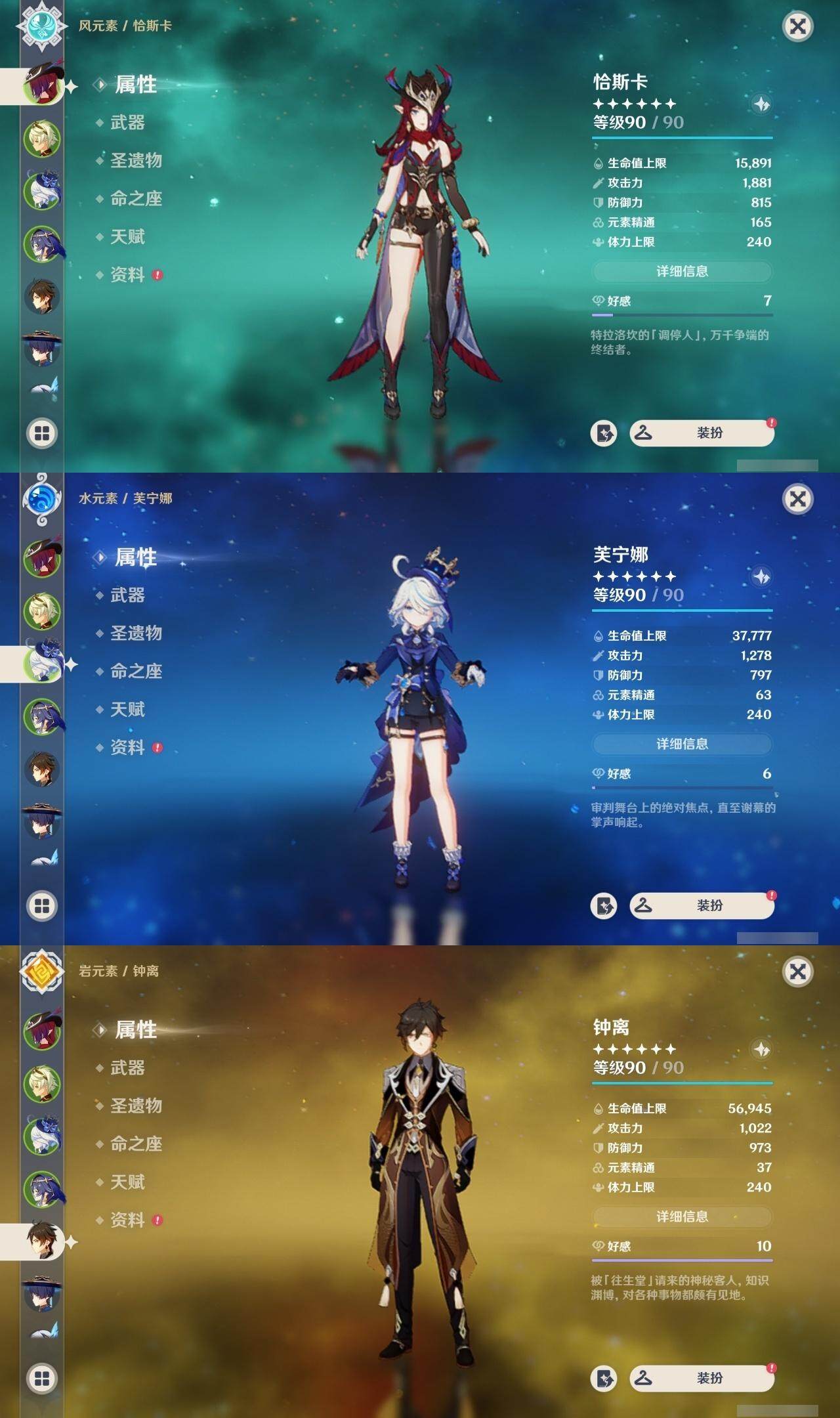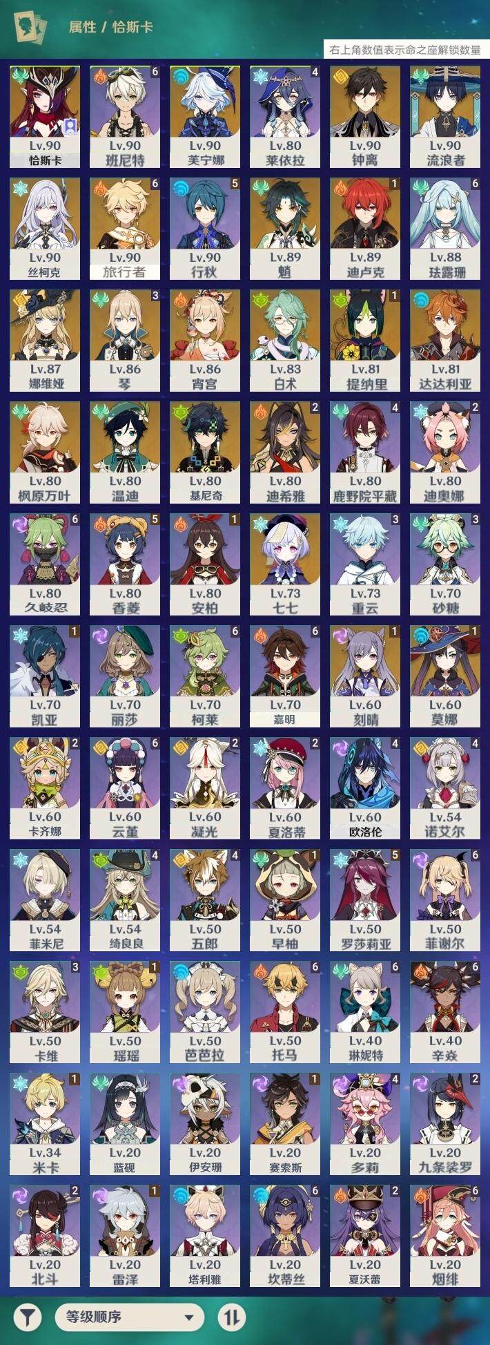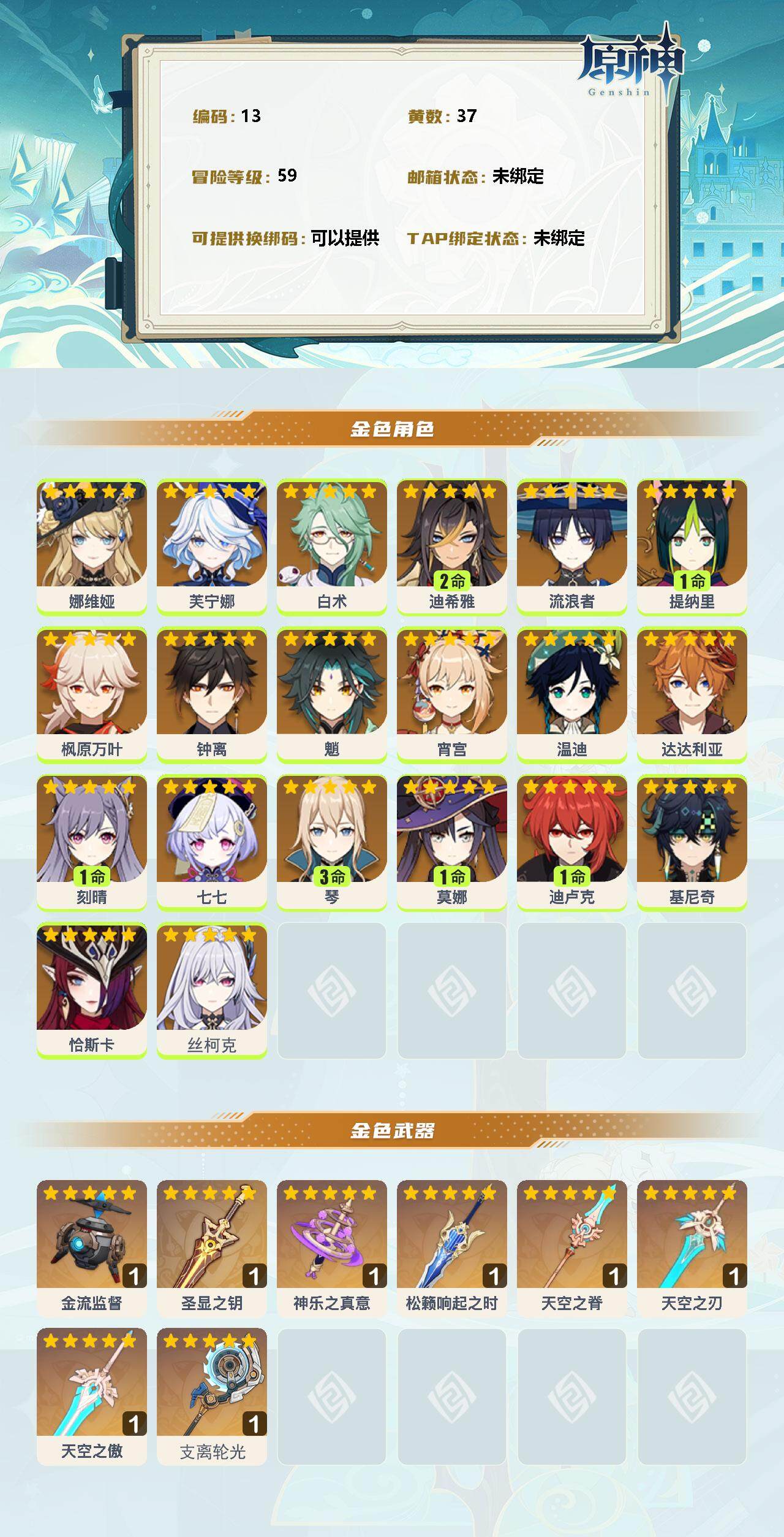 59级/37黄/男主/20个五星角色 0命娜维娅0命芙宁娜0命白术2命迪希雅0命流浪者1命提纳里0命枫原万叶0命钟离0命魈0命宵宫0命温迪0命达达利亚1命刻晴0命七七3命琴1命莫娜1命迪卢克0命基尼奇0命恰斯卡0命丝柯克精1金流监督精1圣显之钥精1神乐之真意精1松籁响起之时精1天空之脊精1天空之刃精1天空之傲精1支离轮光