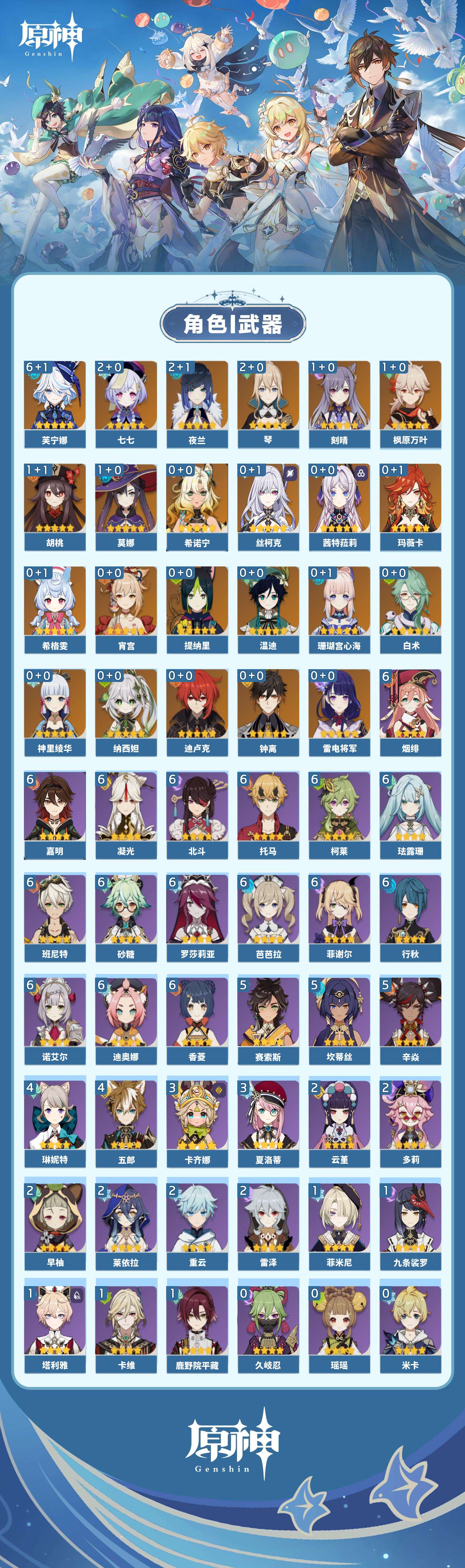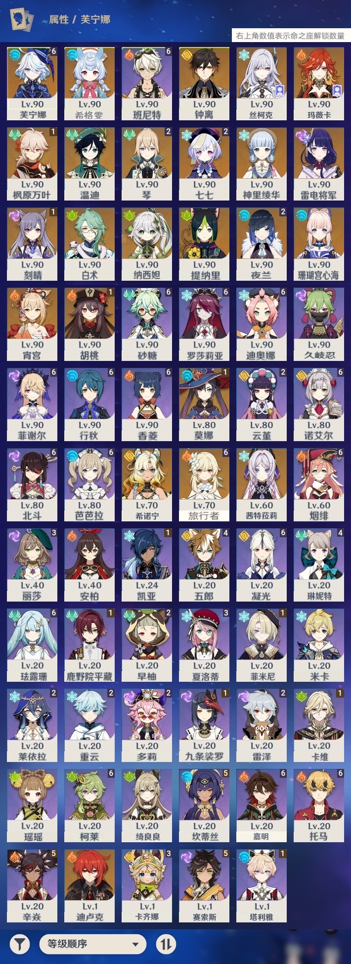 【原神】【lyys5510】冒险等级:60,五星数量:36,五星角色:芙宁娜 6命七七 2命琴 2命夜兰 2命枫原万叶 1命胡桃 1命刻晴 1命莫娜 1命珊瑚宫心海希诺宁白术神里绫华温迪玛薇卡茜特菈莉宵宫钟离提纳里丝柯克纳西妲迪卢克希格雯雷电将军__五星武器:柔灯挽歌焚曜千阳静水流涌之辉苍耀不灭月华风鹰剑护摩之杖天空之傲天空之刃天空之翼息灾若水白雨心弦__四星角色:班尼特 6命行秋 6命香菱 6命珐露珊 6命凝光 6命迪奥娜 6命砂糖 6命柯莱 6命芭芭拉 6命托马 6命烟绯 6命诺艾尔 6命罗莎莉亚 6命菲谢尔 6命北斗 6命嘉明 6命坎蒂丝 5命辛焱 5命赛索斯 5命五郎 4命琳妮特 4命卡齐娜 3命夏洛蒂 3命莱依拉 2命多莉 2命云堇 2命早柚 2命重云 2命雷泽 2命九条裟罗 1命鹿野院平藏 1命卡维 1命菲米尼 1命塔利雅 1命久岐忍绮良良瑶瑶米卡