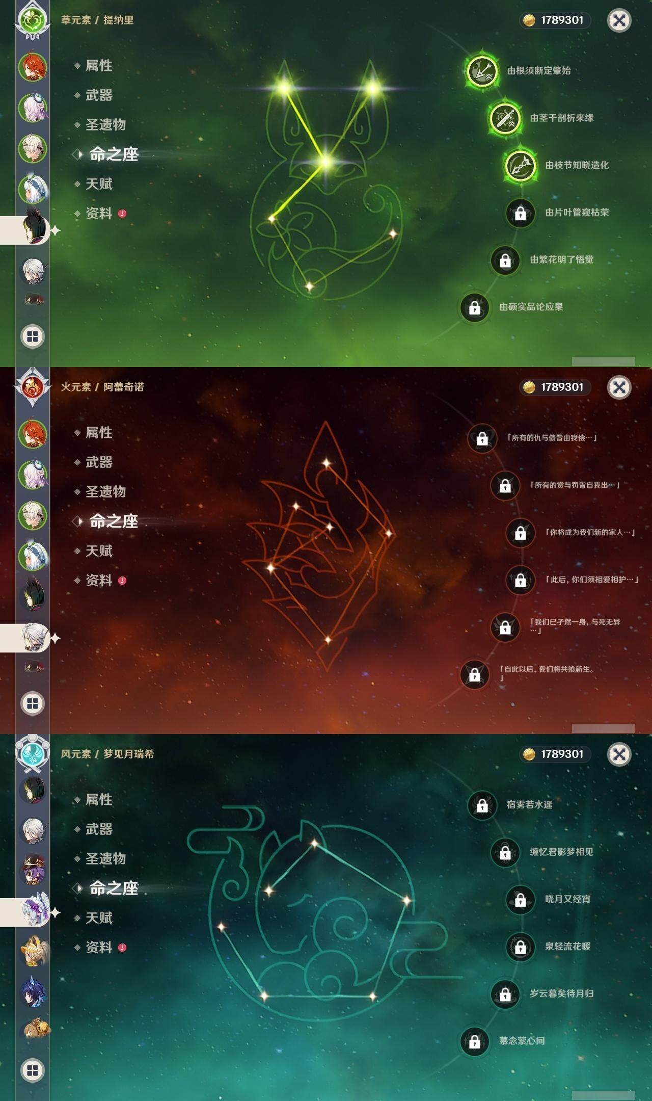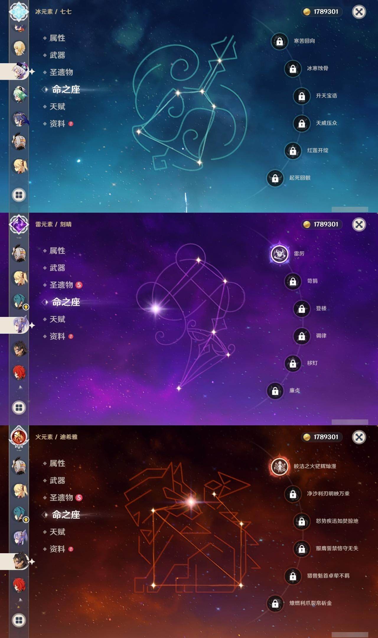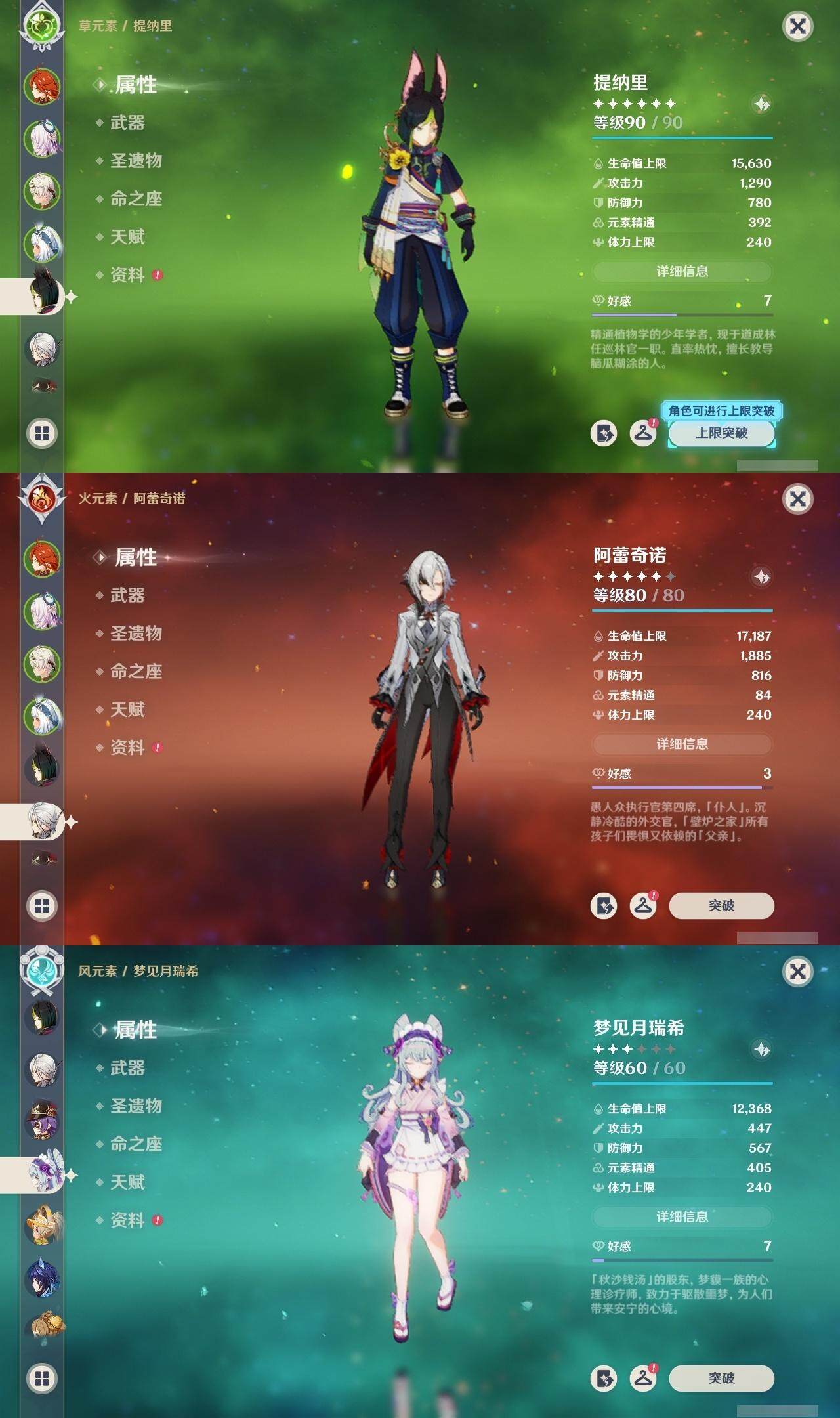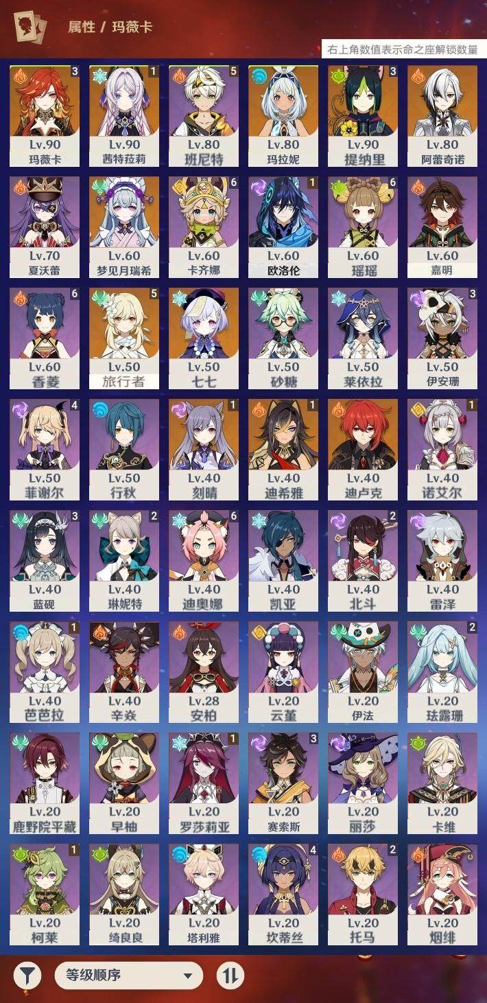 56级/21黄/女主/10个五星角色/2个五星武器 0命阿蕾奇诺1命迪希雅3命提纳里1命刻晴0命七七0命迪卢克0命玛拉妮3命玛薇卡1命茜特菈莉0命梦见月瑞希精1天空之卷精1焚曜千阳