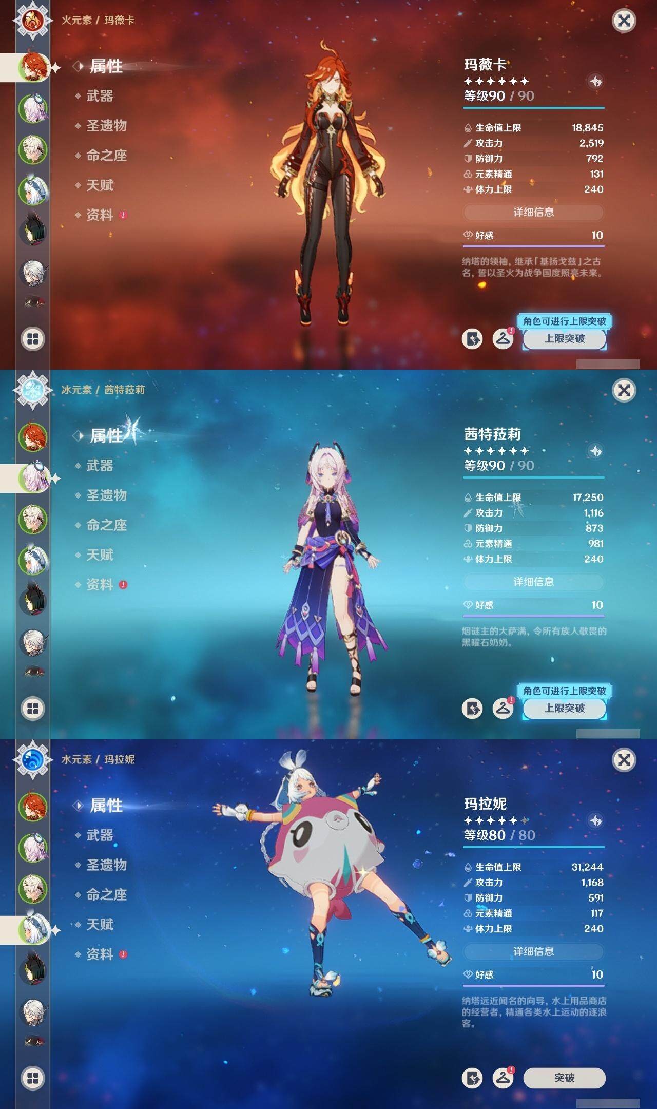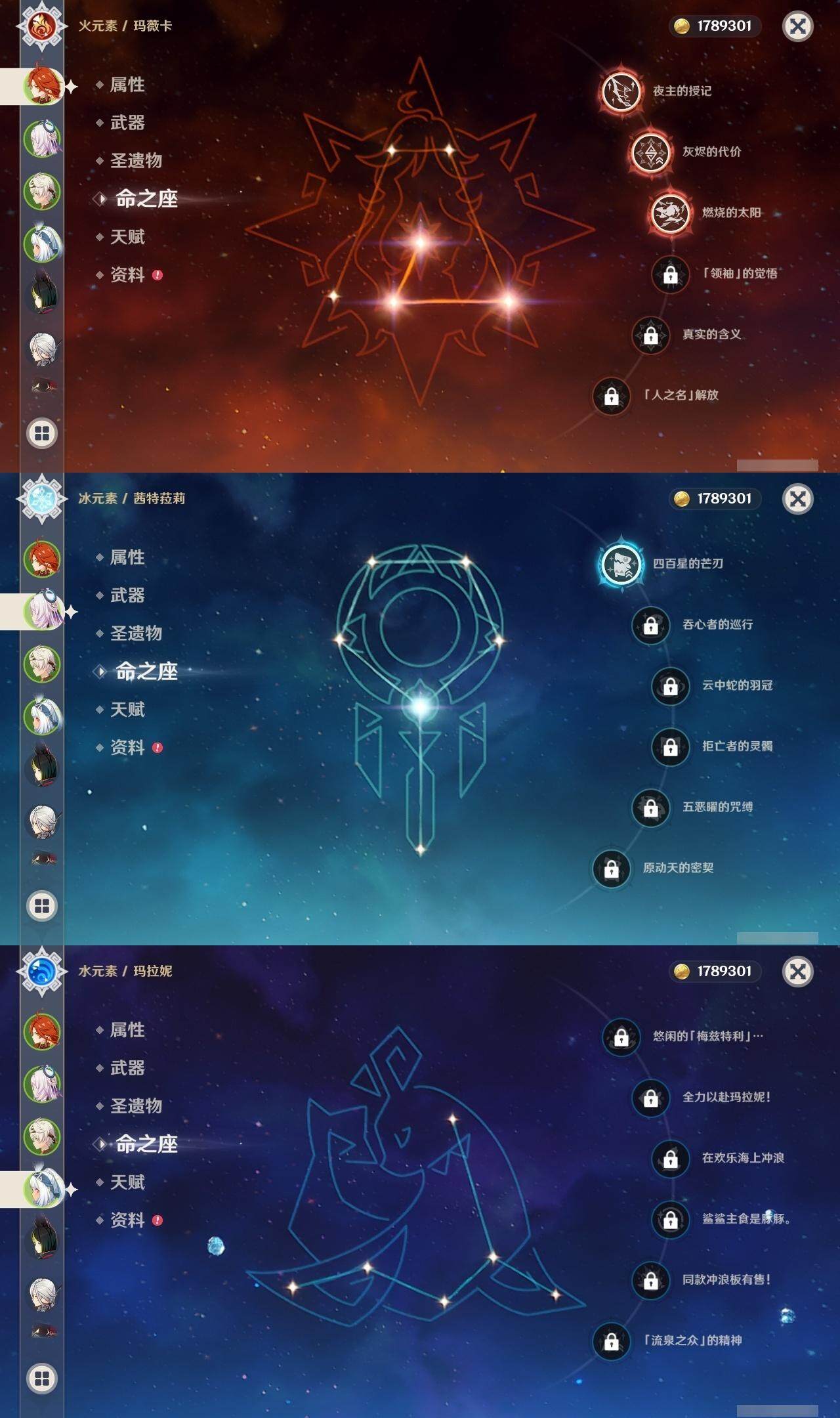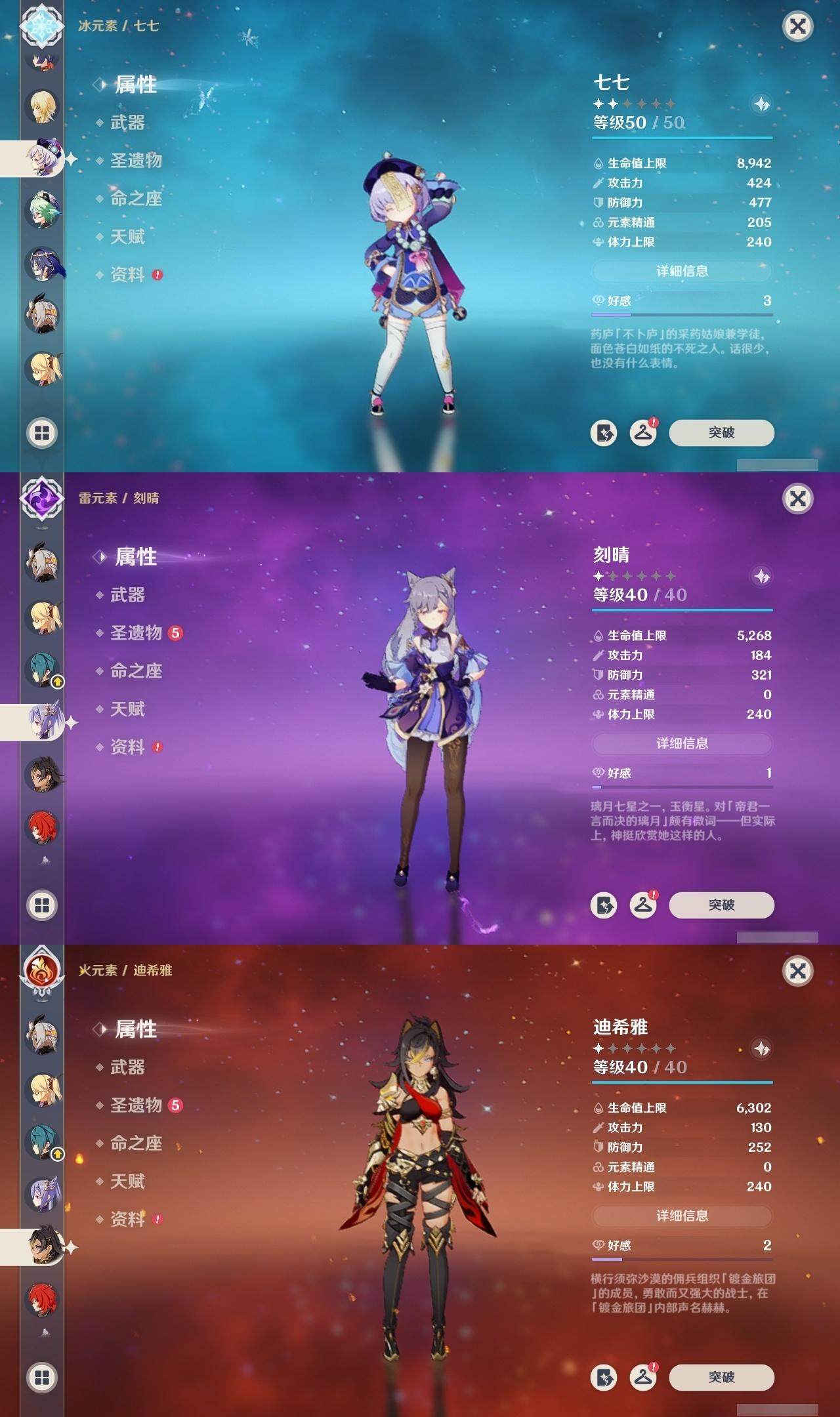 56级/21黄/女主/10个五星角色/2个五星武器 0命阿蕾奇诺1命迪希雅3命提纳里1命刻晴0命七七0命迪卢克0命玛拉妮3命玛薇卡1命茜特菈莉0命梦见月瑞希精1天空之卷精1焚曜千阳