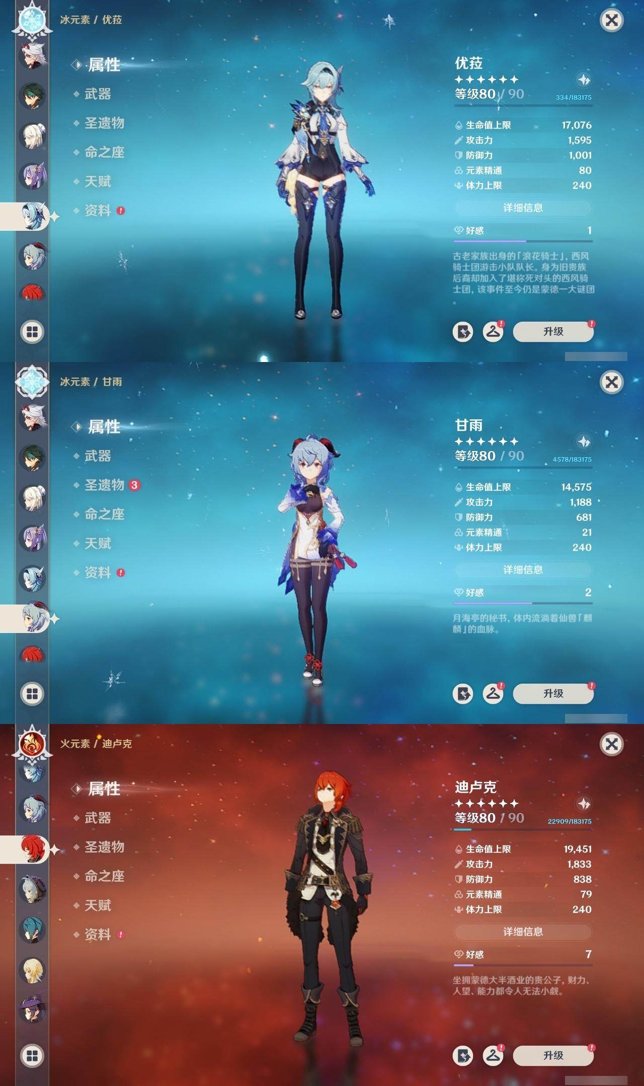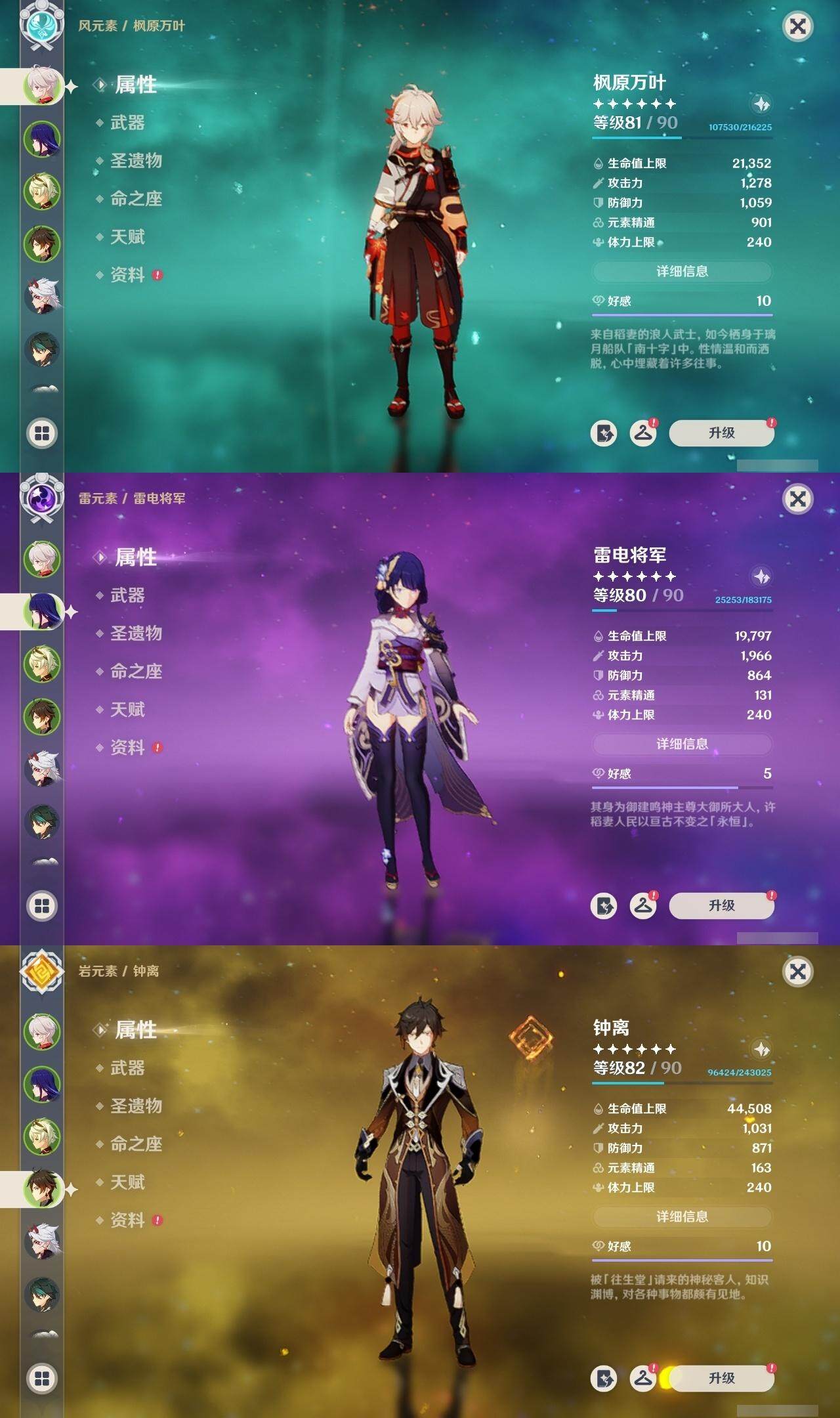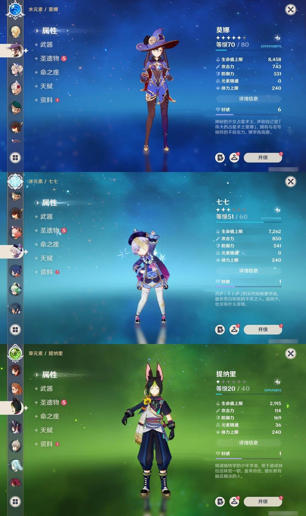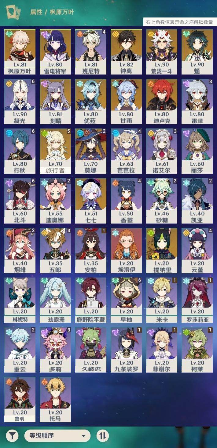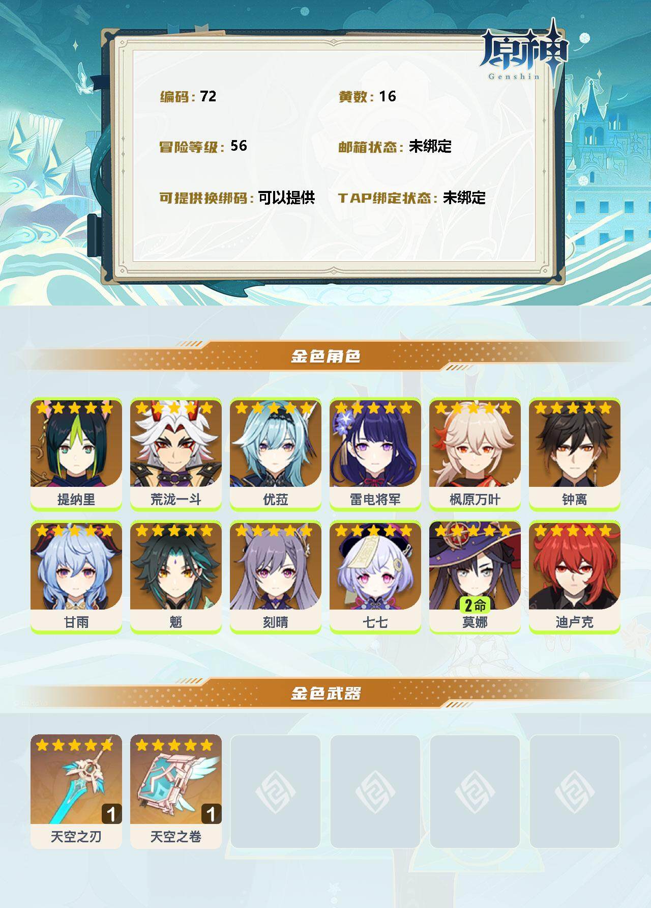 56级/16黄/女主/12个五星角色/2个五星武器 0命提纳里0命荒泷一斗0命优菈0命雷电将军0命枫原万叶0命钟离0命甘雨0命魈0命刻晴0命七七2命莫娜0命迪卢克精1天空之刃精1天空之卷