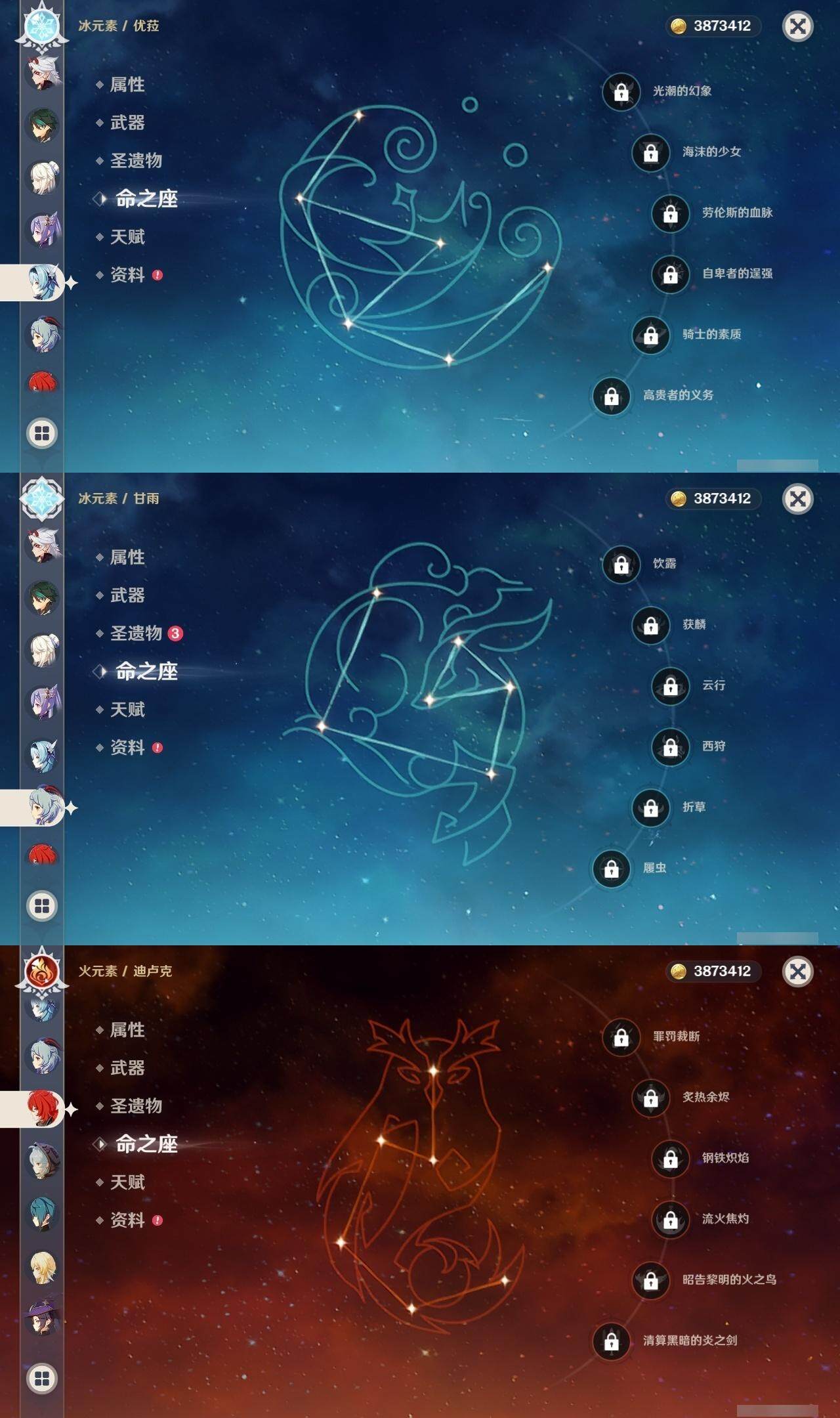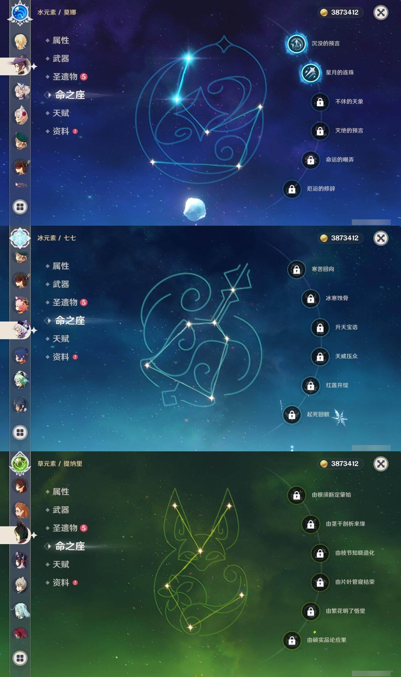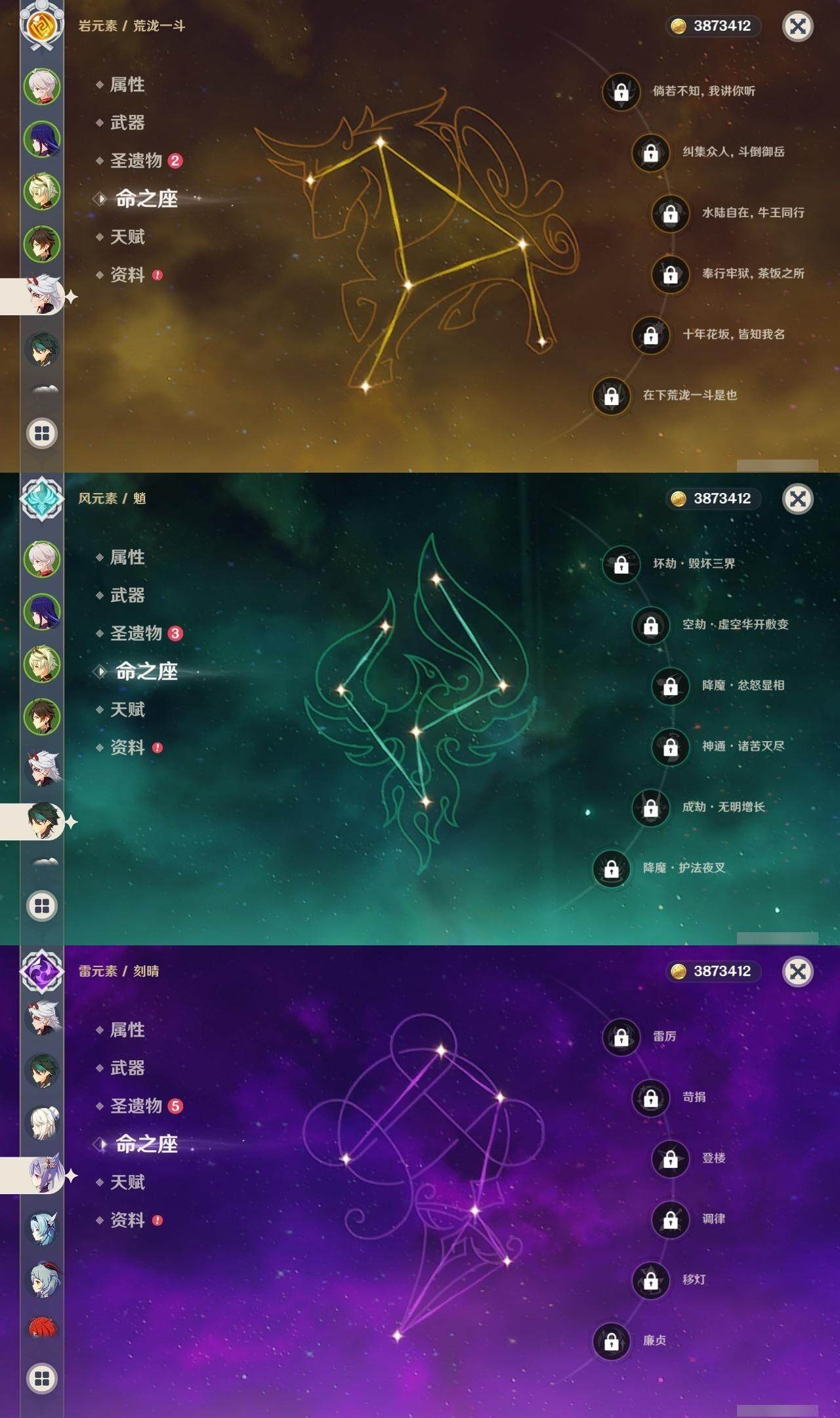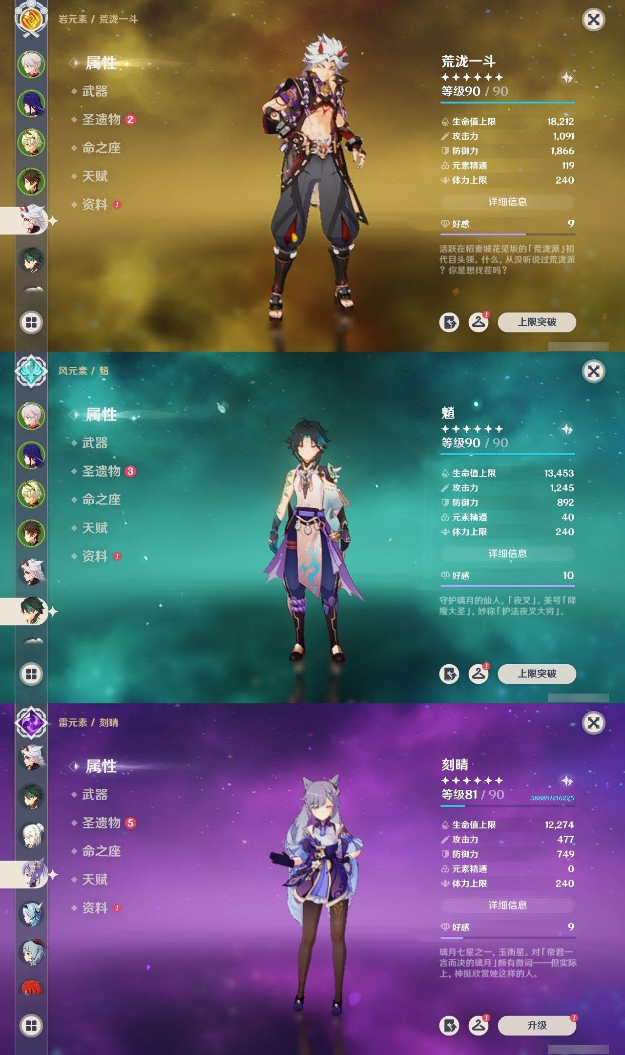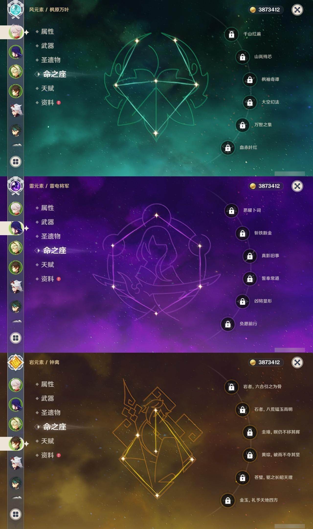 56级/16黄/女主/12个五星角色/2个五星武器 0命提纳里0命荒泷一斗0命优菈0命雷电将军0命枫原万叶0命钟离0命甘雨0命魈0命刻晴0命七七2命莫娜0命迪卢克精1天空之刃精1天空之卷