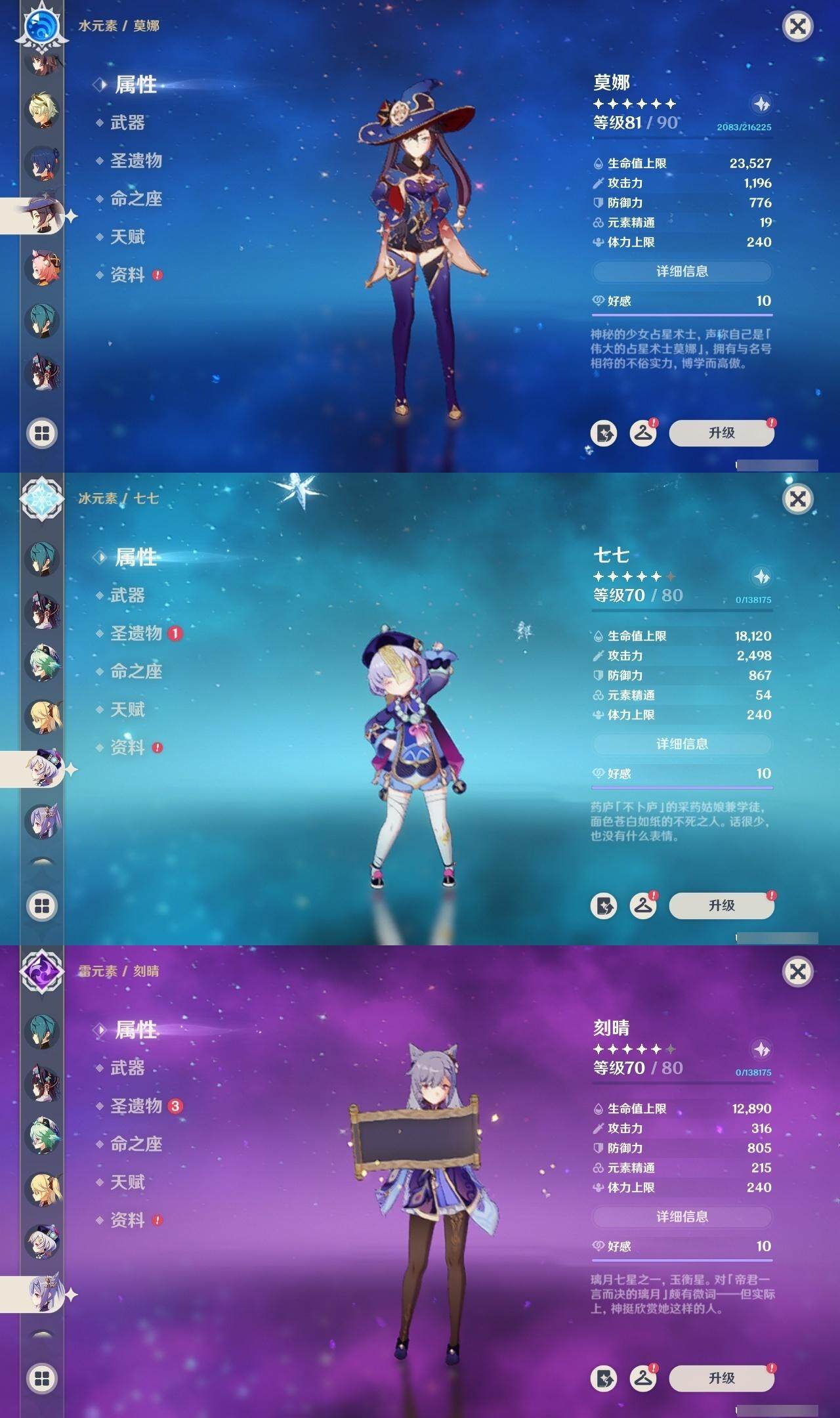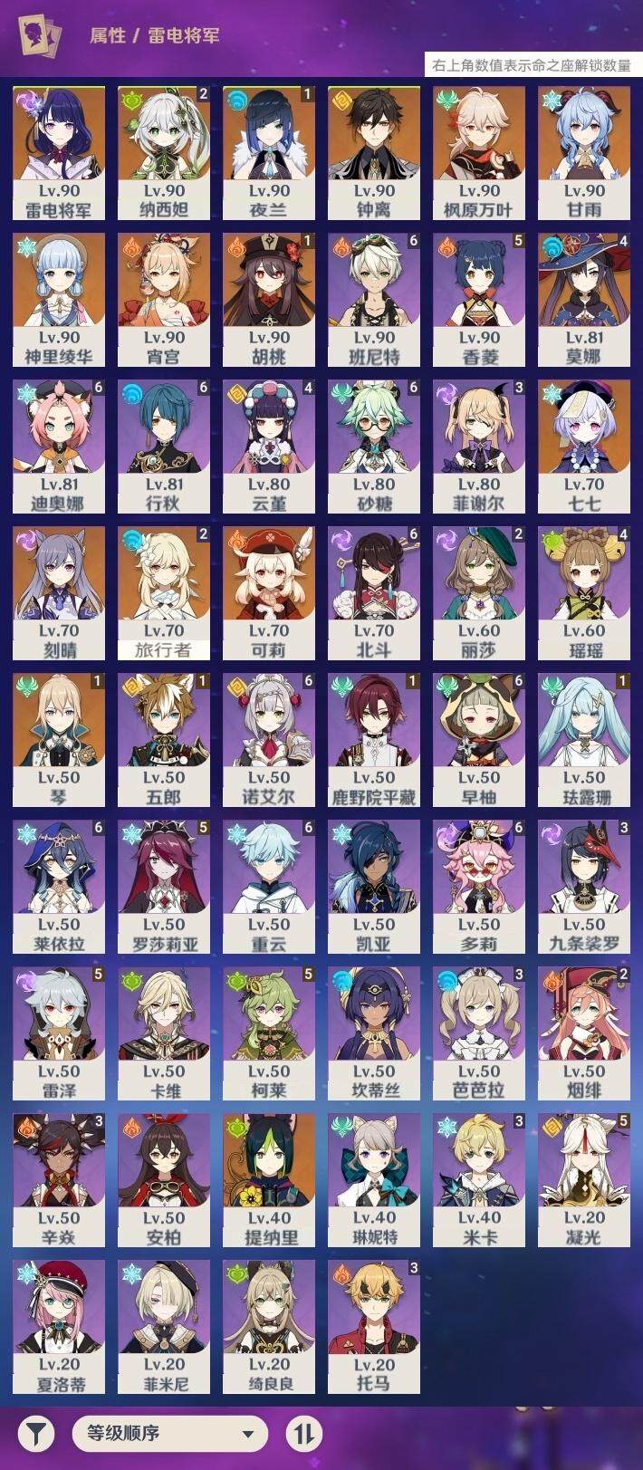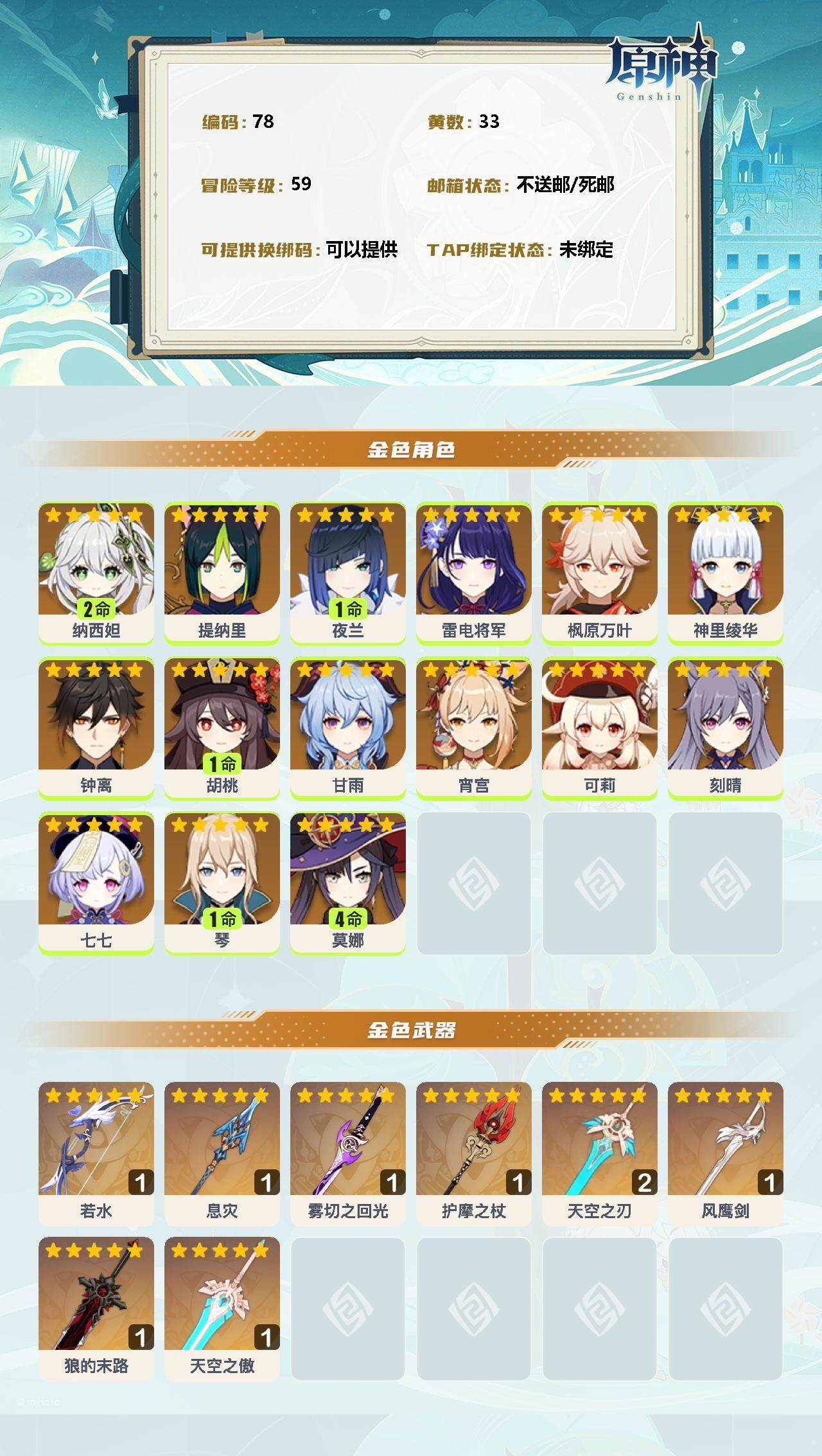59级/33黄/女主/15个五星角色/8个五星武器 2命纳西妲0命提纳里1命夜兰0命雷电将军0命枫原万叶0命神里绫华0命钟离1命胡桃0命甘雨0命宵宫0命可莉0命刻晴0命七七1命琴4命莫娜精1若水精1息灾精1雾切之回光精1护摩之杖精2天空之刃精1风鹰剑精1狼的末路精1天空之傲