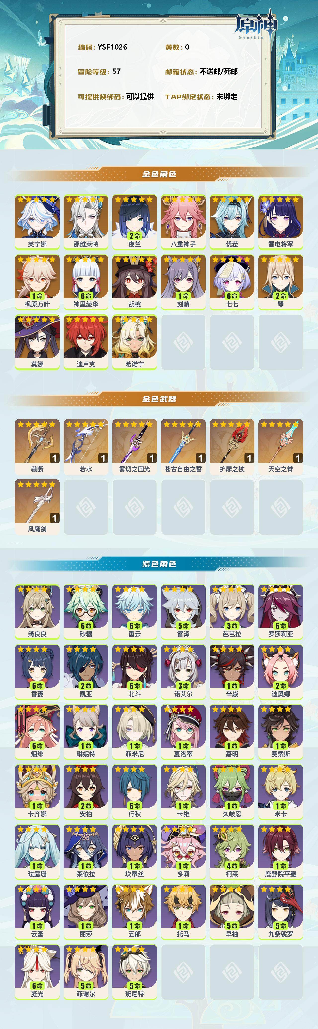 【ysf1026】57级/男主/17个五星角色/0命希诺宁/0命芙宁娜/0命那维莱特/2命夜兰/0命八重神子/0命雷电将军/满命神里绫华/1命枫原万叶/0命优菈/0命胡桃/2命琴/1命刻晴/0命迪卢克/0命莫娜/满命七七/精1裁断/精1若水/精1雾切之回光/精1苍古自由之誓/精1护摩之杖/精1风鹰剑/精1天空之脊/0命卡齐娜/0命赛索斯/0命嘉明/0命夏洛蒂/0命菲米尼/1命琳妮特/0命绮良良/1命卡维/0命米卡/0命珐露珊/0命莱依拉/1命坎蒂丝/0命多莉/4命柯莱/1命鹿野院平藏/0命久岐忍/0命云堇/0命五郎/1命托马/5命九条裟罗/5命早柚/满命烟绯/满命罗莎莉亚/0命辛焱/2命迪奥娜/满命砂糖/5命雷泽/5命菲谢尔/0命丽莎/满命北斗/满命香菱/2命安柏/5命班尼特/满命行秋/3命芭芭拉/满命凝光/3命诺艾尔/2命凯亚/满命重云