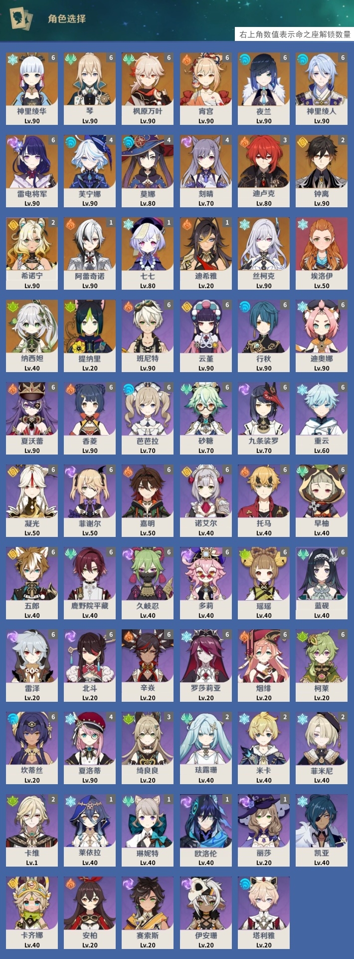 [12585688]110黄 风:6命枫原万叶,6命琴 火:6命宵宫,1命阿蕾奇诺,3命迪卢克,1命迪希雅 水:6命夜兰,6命神里绫人,4命芙宁娜,4命莫娜 冰:6命神里绫华,0命丝柯克,1命七七,0命埃洛伊 岩:2命钟离,2命希诺宁 雷:6命雷电将军,4命刻晴 草:0命纳西妲,0命提纳里 弓:精4飞雷之弦振,精2若水,精1终末嗟叹之诗,精1最初的大魔术 法器:精3天空之卷,精1四风原典 单手剑:精1岩峰巡歌,精1静水流涌之辉,精1波乱月白经津,精2雾切之回光,精1苍古自由之誓,精1天空之刃,精2风鹰剑 长柄武器:精1赤月之形,精1薙草之稻光,精2和璞鸢,精1天空之脊 【角色皮肤】 五星角色:神里绫华-花时来信,琴-海风之梦 四星角色:班尼特-炽绘奇旅,香菱-岁夜欢哗,绮良良-倩影游侠,丽莎-叶隐芳名,菲谢尔-极夜真梦,芭芭拉-闪耀协奏