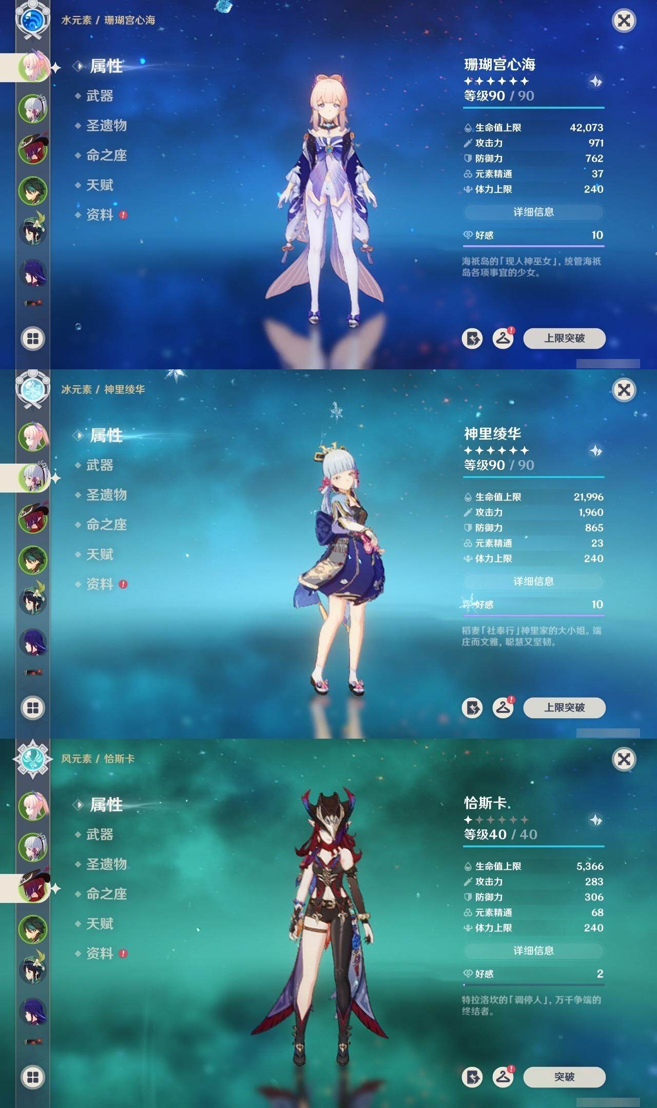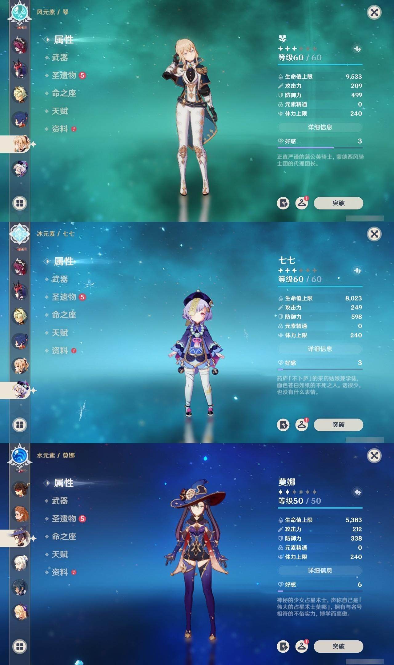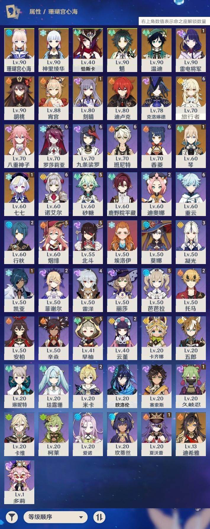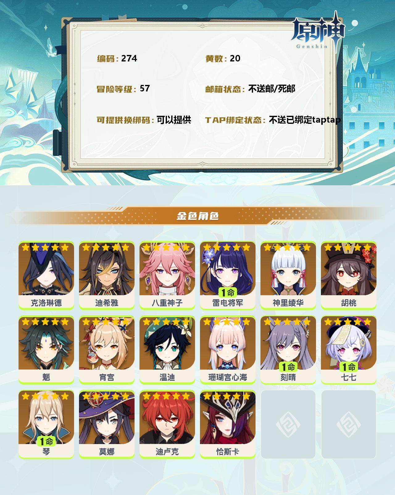 57级/20黄/女主/16个五星角色 0命克洛琳德0命迪希雅0命八重神子1命雷电将军0命神里绫华0命胡桃0命魈0命宵宫0命温迪0命珊瑚宫心海1命刻晴1命七七1命琴0命莫娜0命迪卢克0命恰斯卡