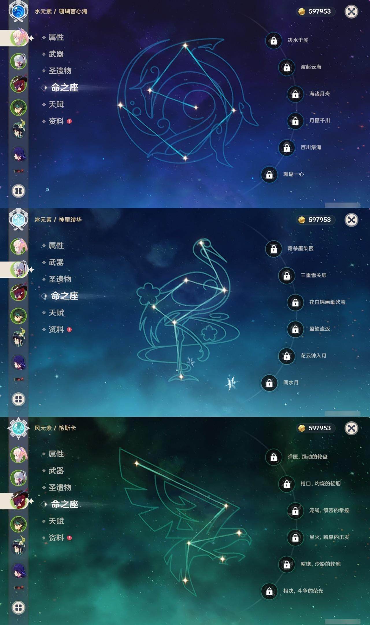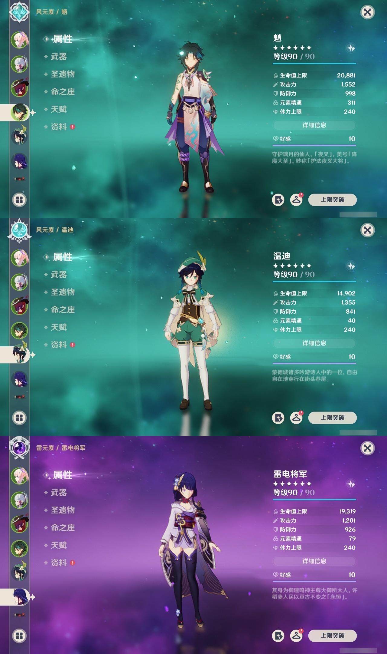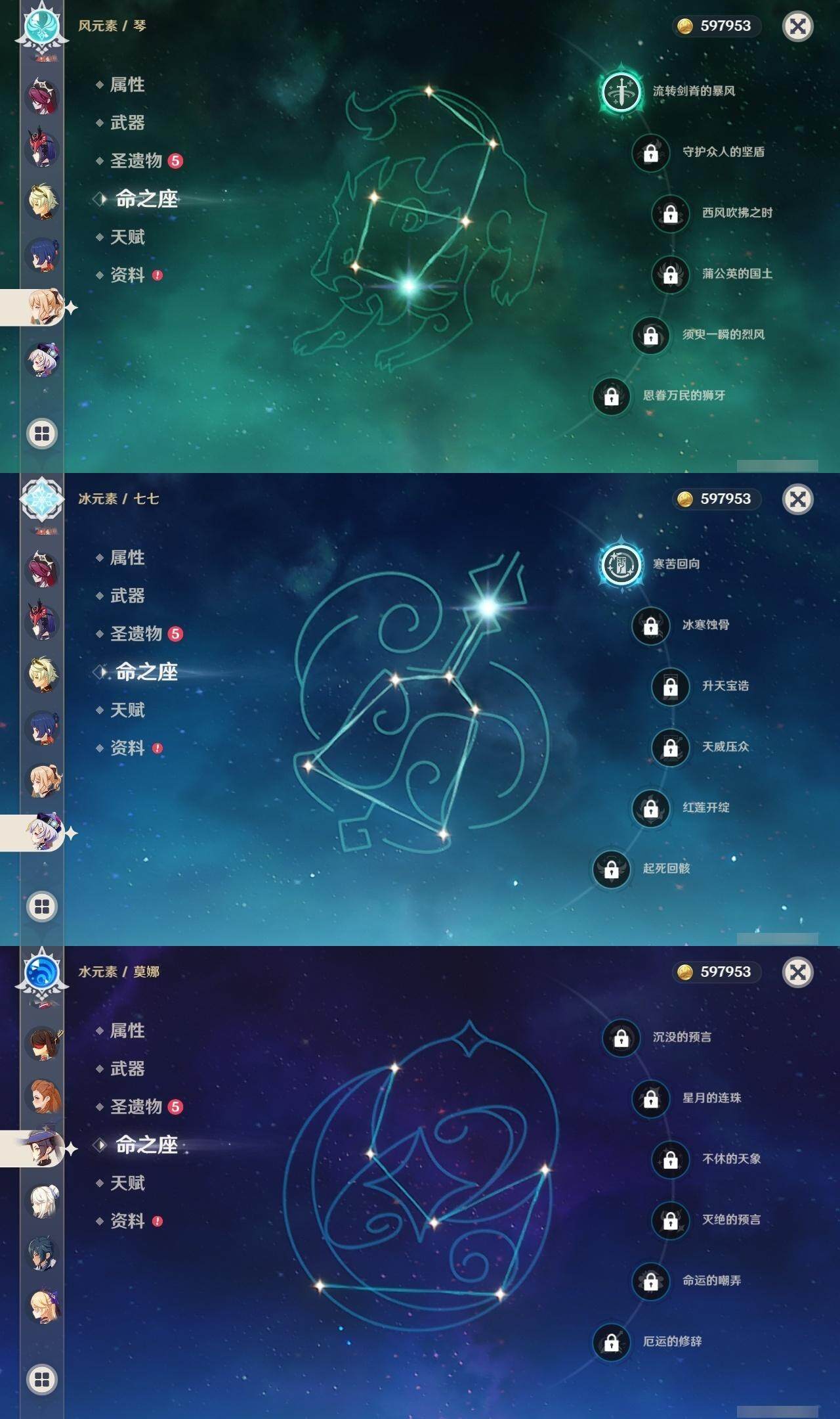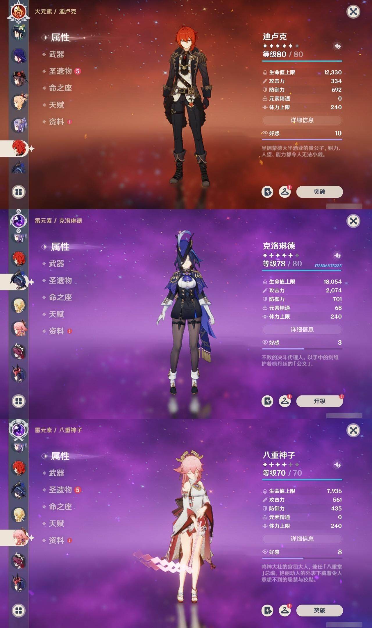 57级/20黄/女主/16个五星角色 0命克洛琳德0命迪希雅0命八重神子1命雷电将军0命神里绫华0命胡桃0命魈0命宵宫0命温迪0命珊瑚宫心海1命刻晴1命七七1命琴0命莫娜0命迪卢克0命恰斯卡