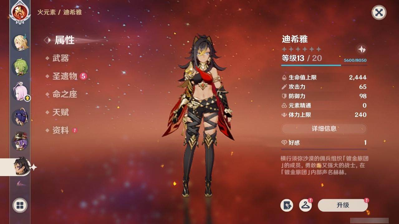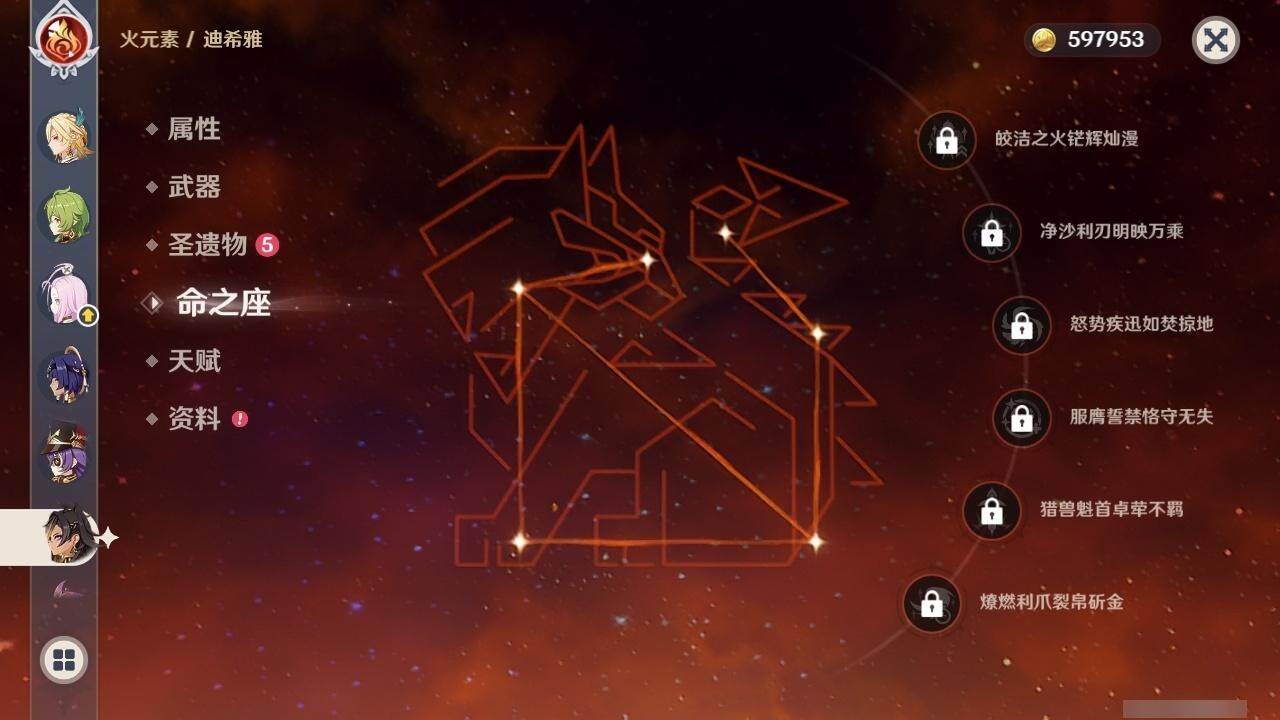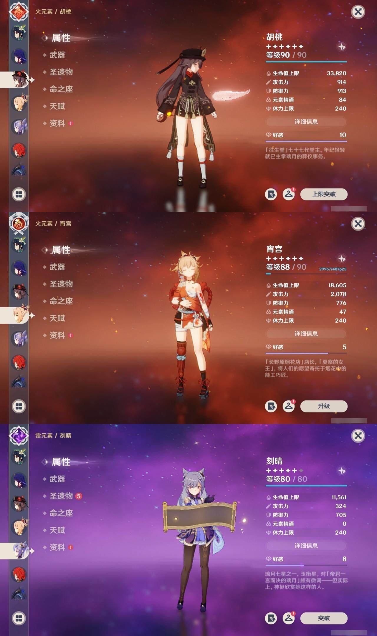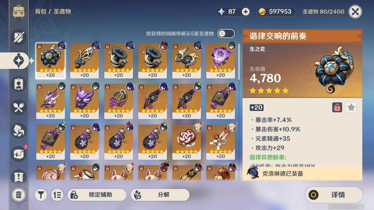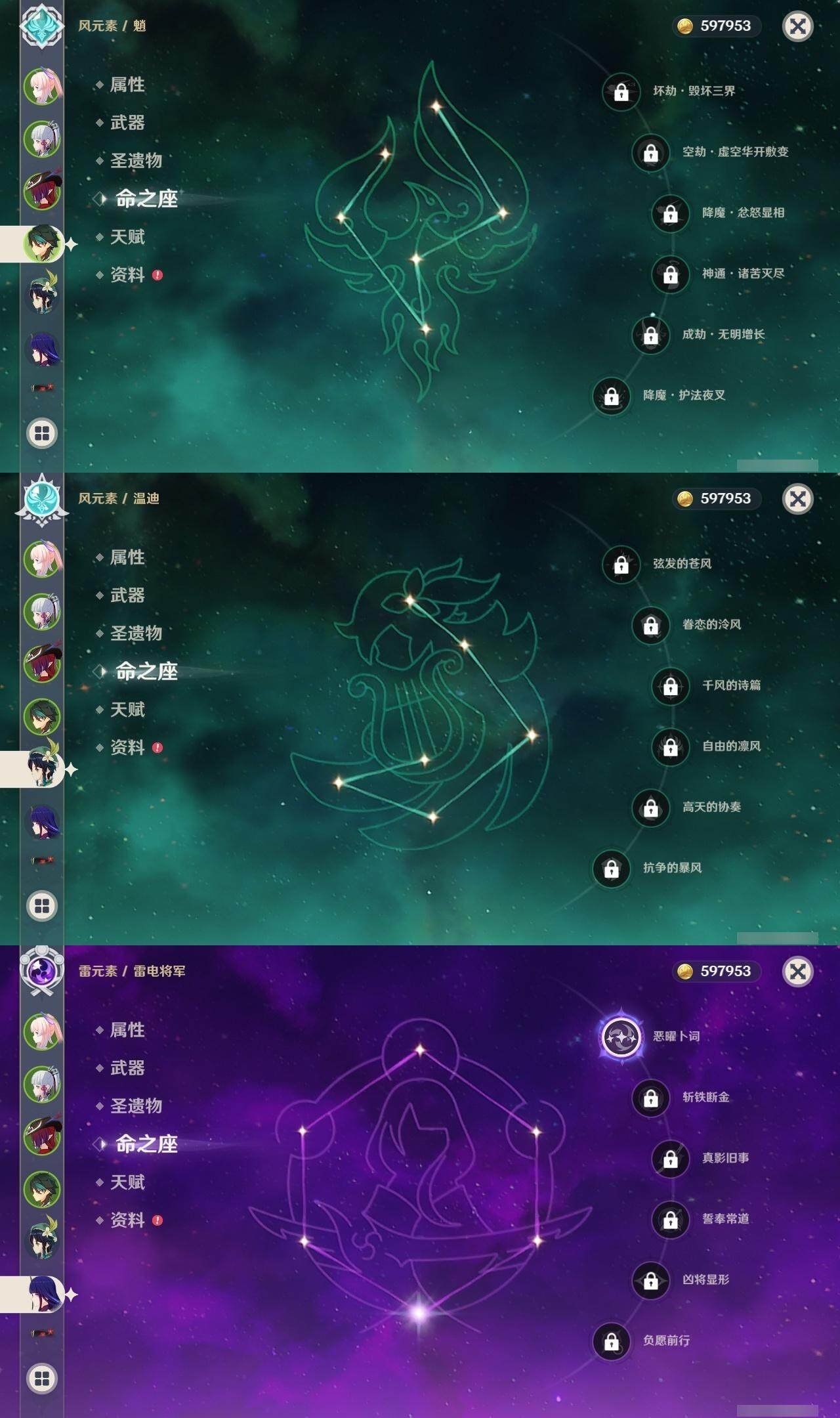 57级/20黄/女主/16个五星角色 0命克洛琳德0命迪希雅0命八重神子1命雷电将军0命神里绫华0命胡桃0命魈0命宵宫0命温迪0命珊瑚宫心海1命刻晴1命七七1命琴0命莫娜0命迪卢克0命恰斯卡