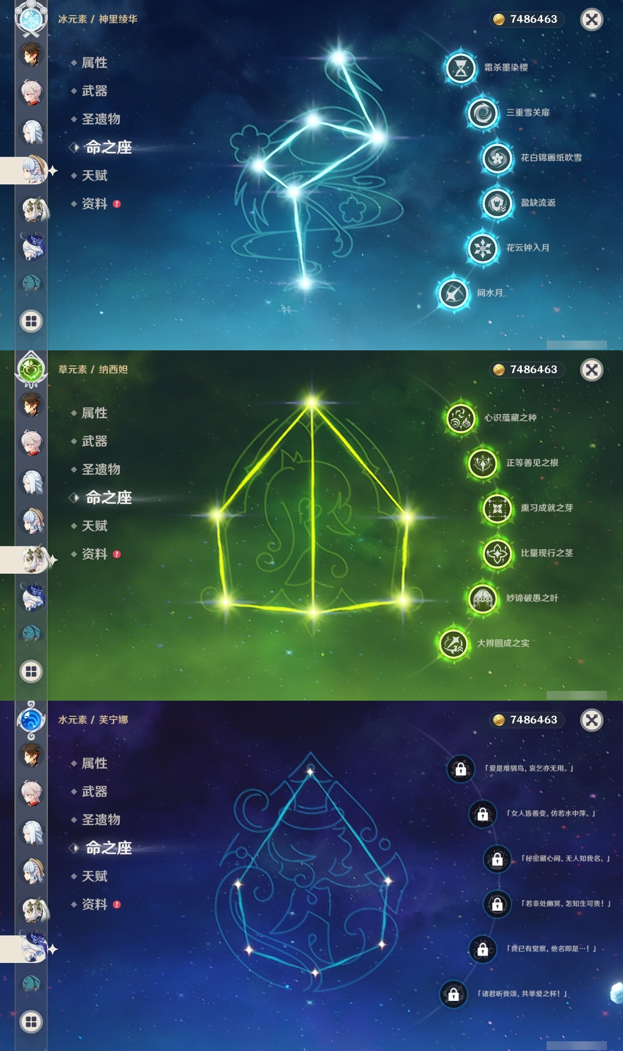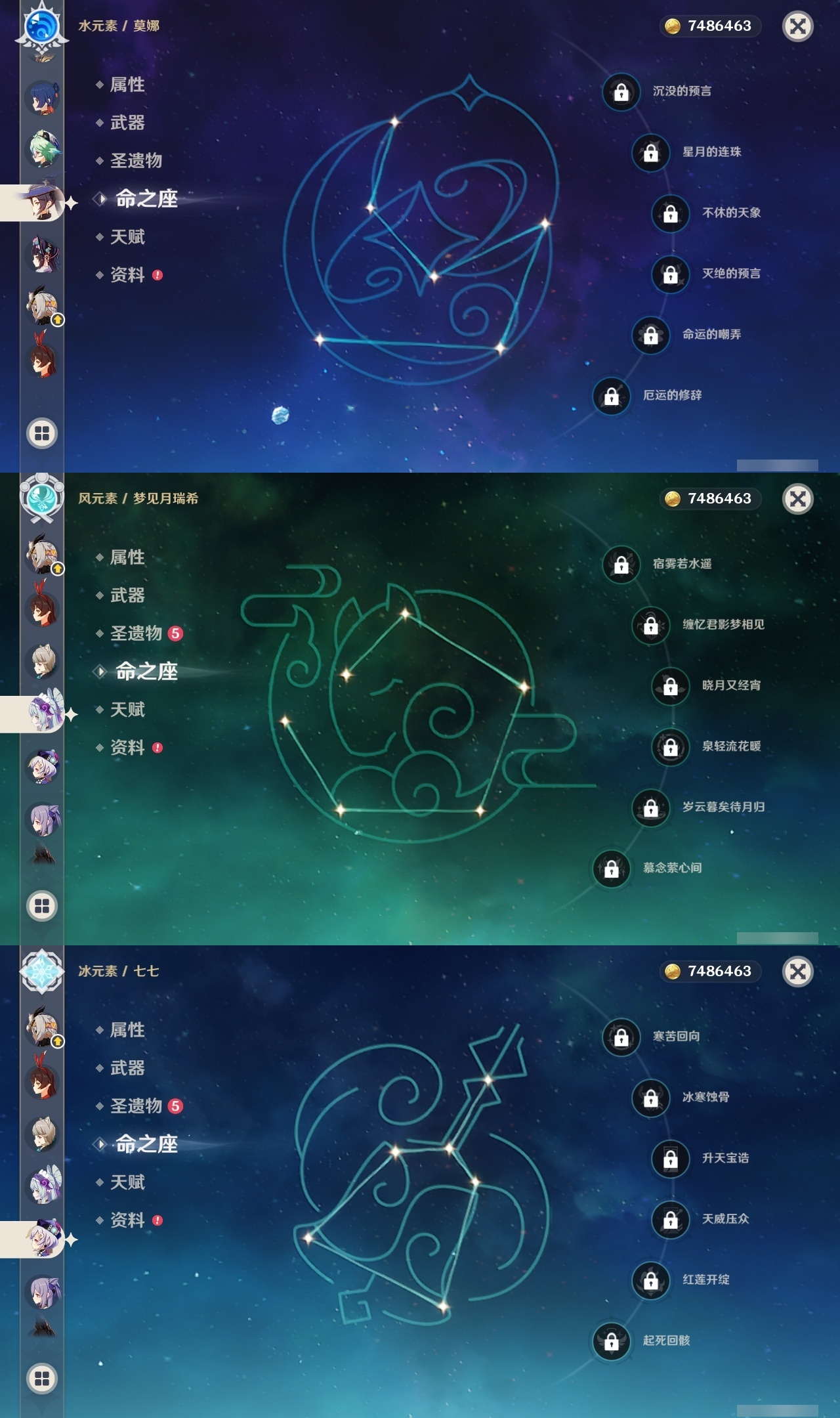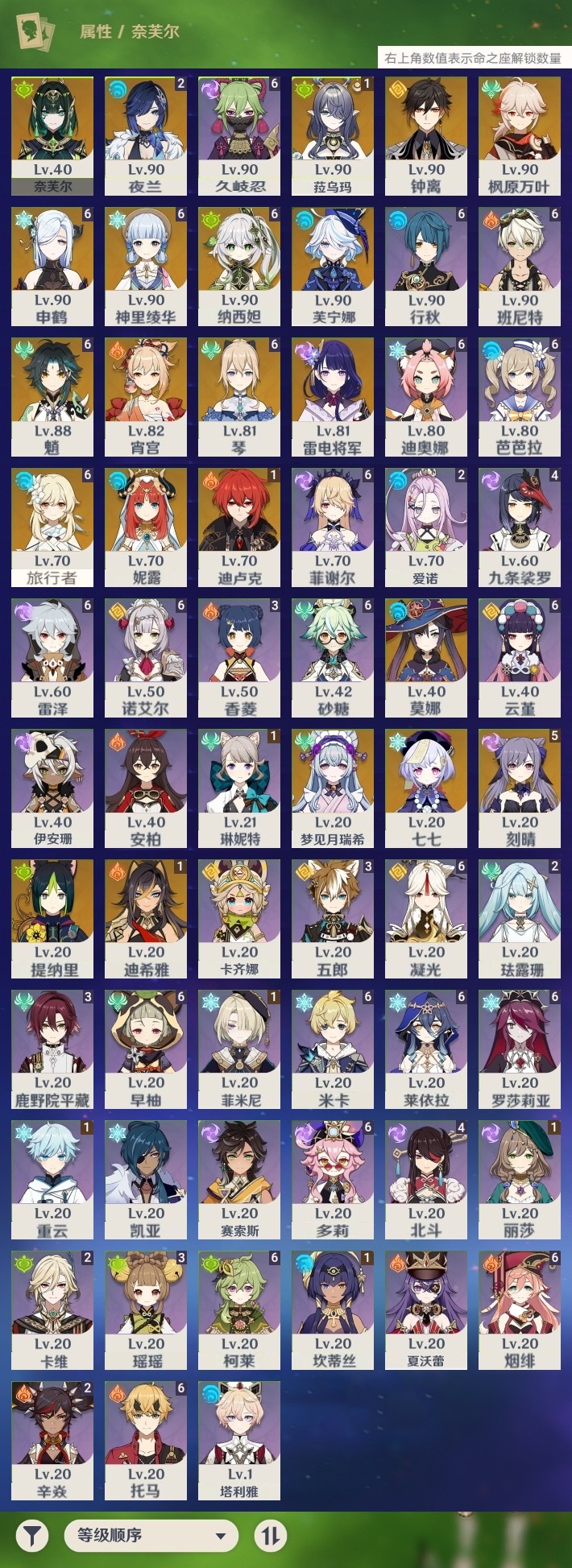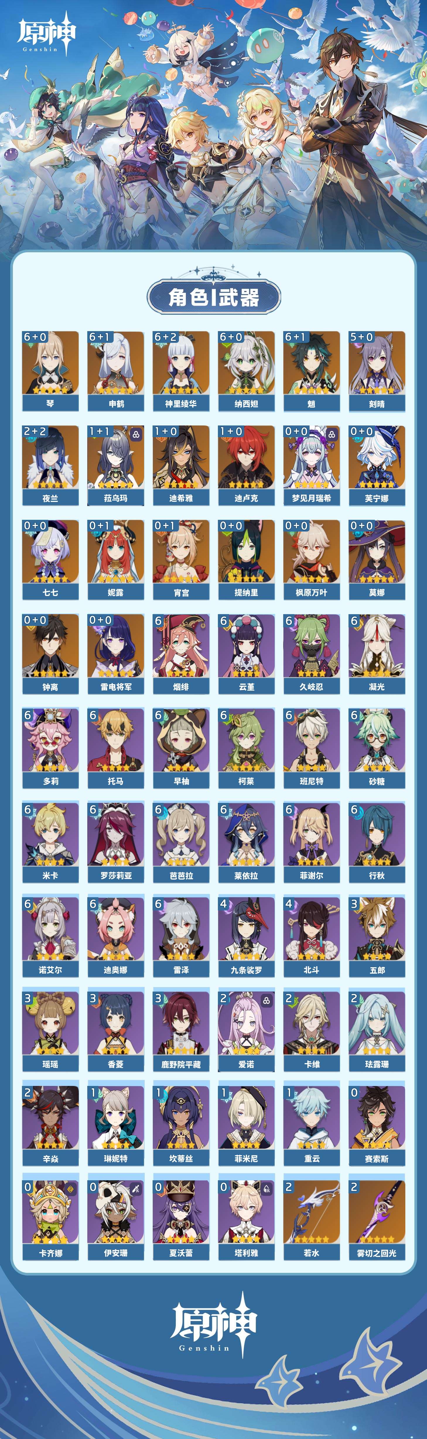 【原神】满命,冒险等级:57,五星数量:31,五星角色:魈 6命琴 6命神里绫华 6命申鹤 6命纳西妲 6命刻晴 5命夜兰 2命迪希雅 1命菈乌玛 1命迪卢克 1命莫娜七七宵宫钟离梦见月瑞希芙宁娜提纳里妮露枫原万叶雷电将军__五星武器:雾切之回光 2精若水 2精苍耀纺夜天镜飞雷之弦振和璞鸢天空之傲天空之脊天空之翼息灾圣显之钥__四星角色:班尼特 6命行秋 6命久岐忍 6命凝光 6命迪奥娜 6命砂糖 6命莱依拉 6命米卡 6命多莉 6命柯莱 6命芭芭拉 6命云堇 6命早柚 6命托马 6命烟绯 6命诺艾尔 6命罗莎莉亚 6命雷泽 6命菲谢尔 6命九条裟罗 4命北斗 4命香菱 3命鹿野院平藏 3命瑶瑶 3命五郎 3命珐露珊 2命卡维 2命辛焱 2命爱诺 2命坎蒂丝 1命重云 1命菲米尼 1命琳妮特 1命卡齐娜夏沃蕾伊安珊塔利雅赛索斯